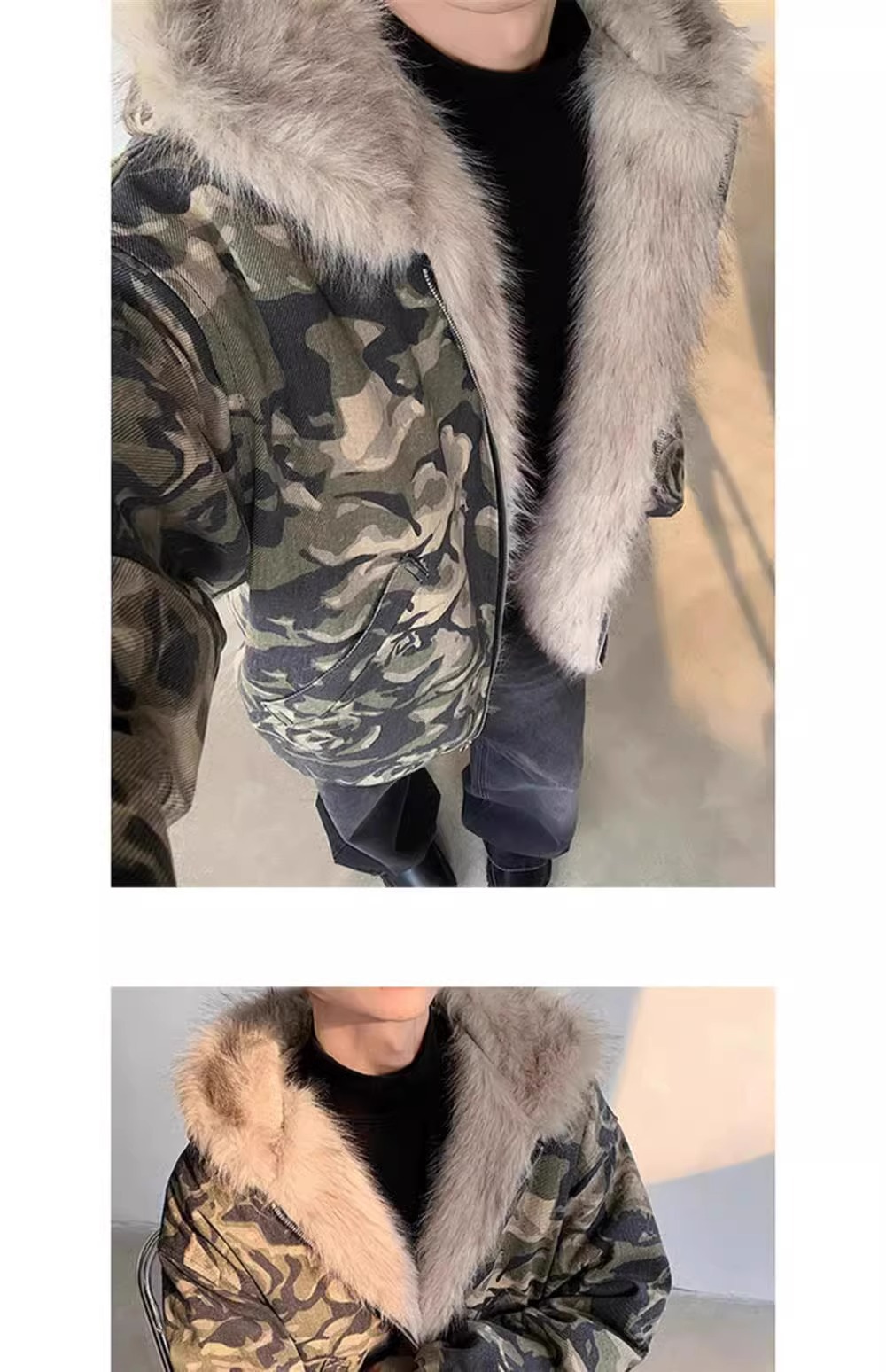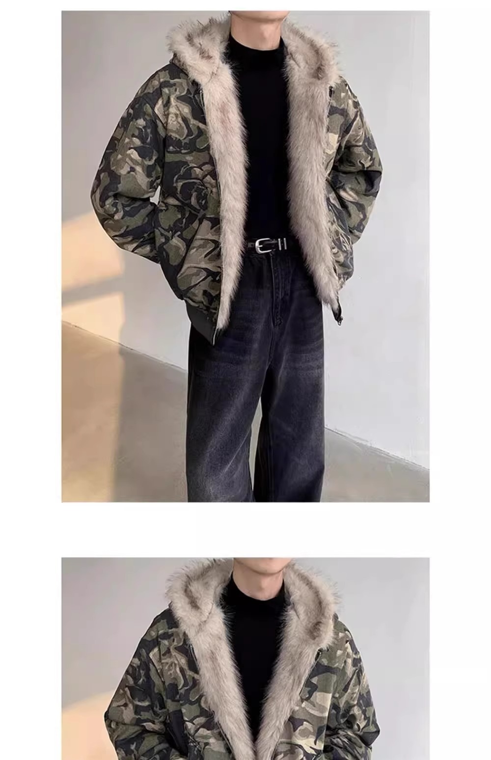 아메리칸 스타일 레트로 세척 된 위장 모피 칼라 후드 재킷 두꺼운 재킷 남성 틈새 디자인 센스 플러튼 핸섬 느슨한 코튼 패딩 재킷