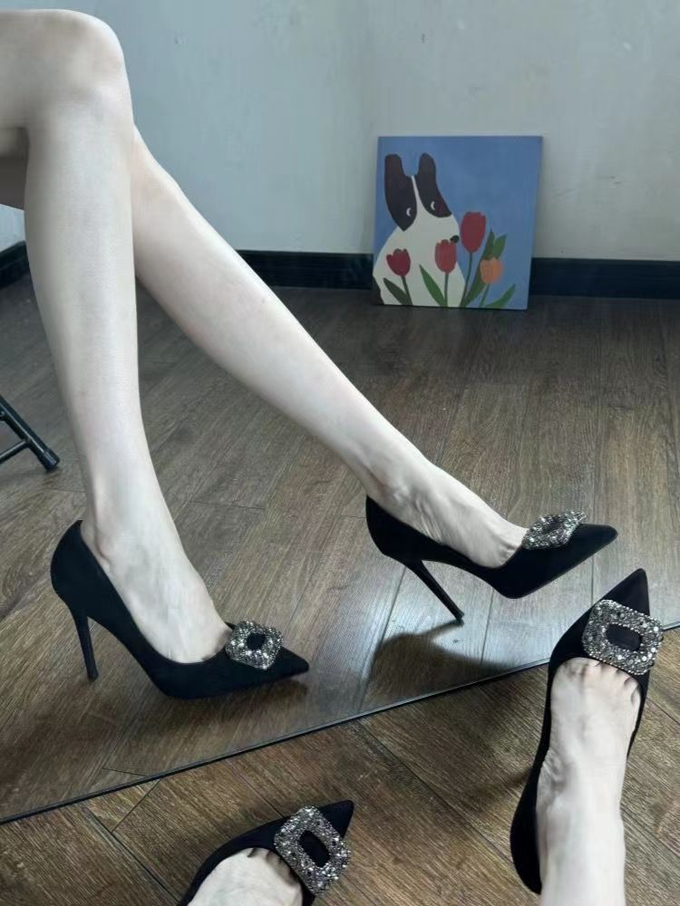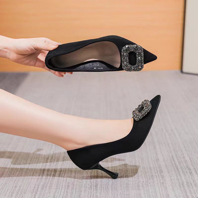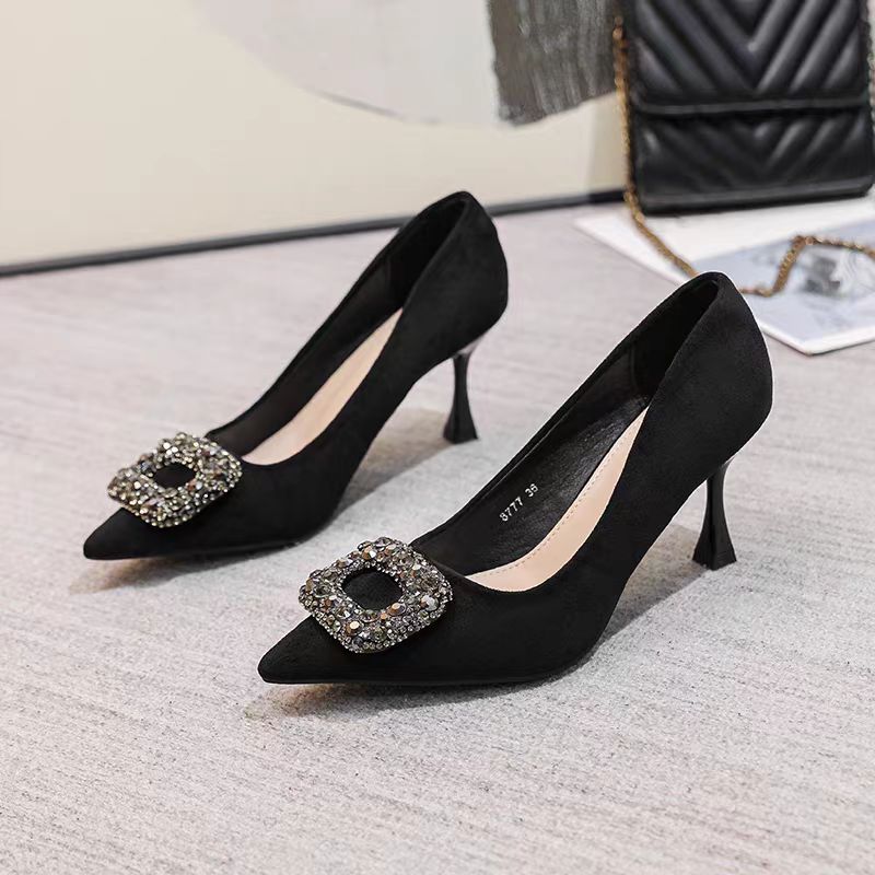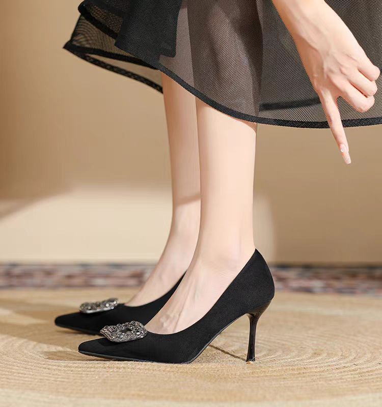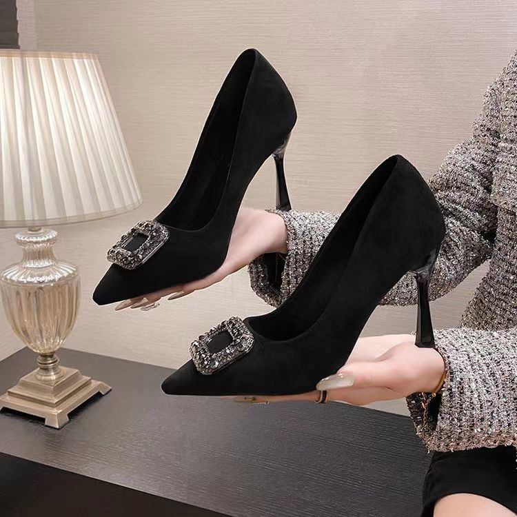 피트가 아닌 광장 버클 신발 2024 봄 새 가을 스틸레토 힐 라인스톤 스웨이드 여성을위한 우아한 뾰족한 블랙 하이힐스토어 가기