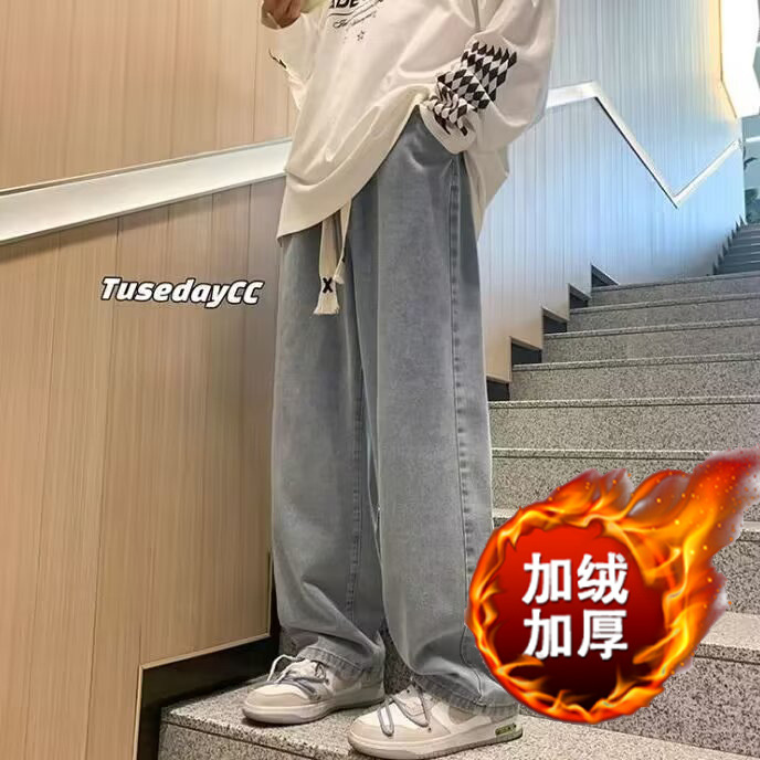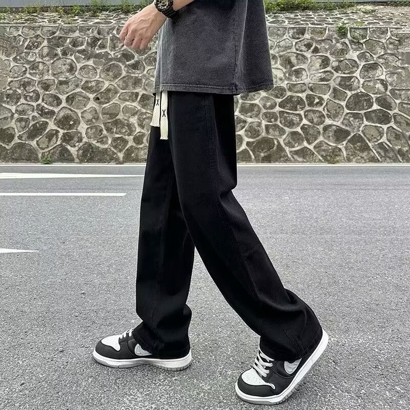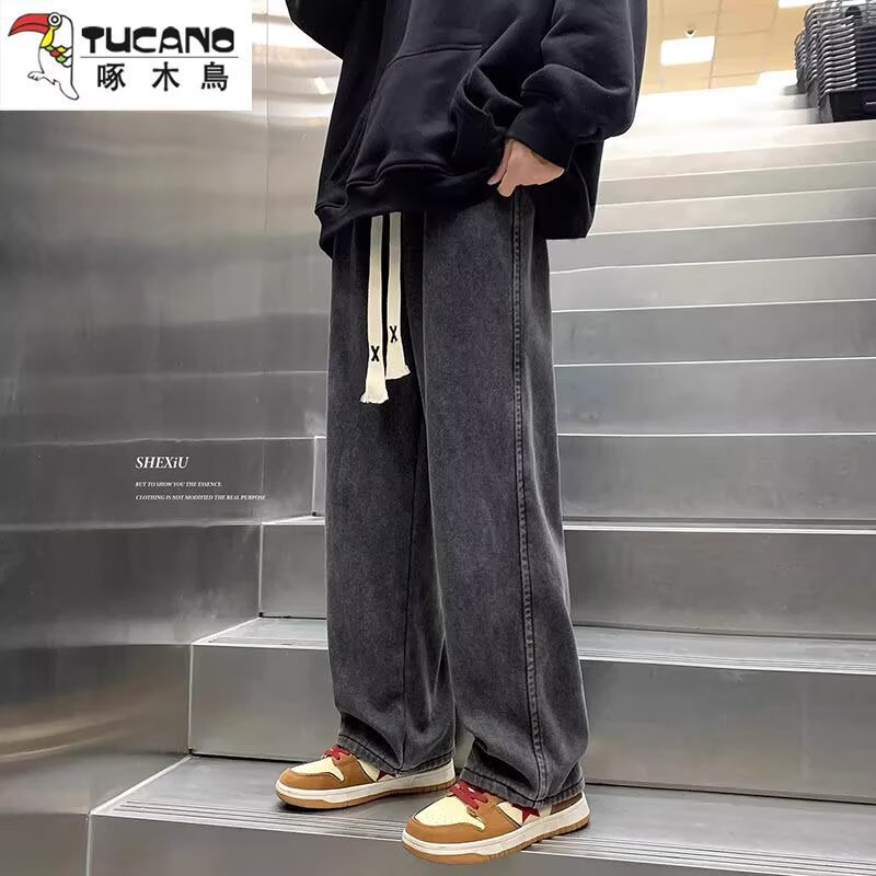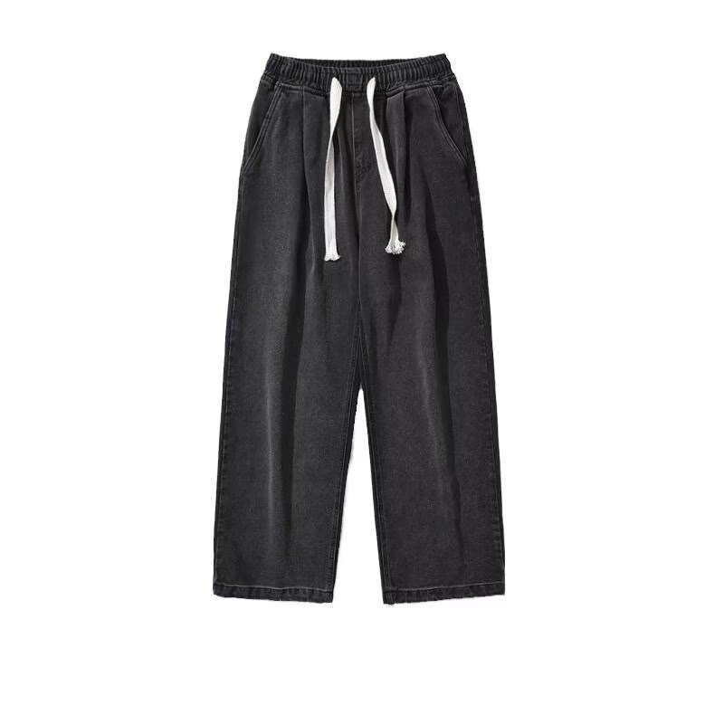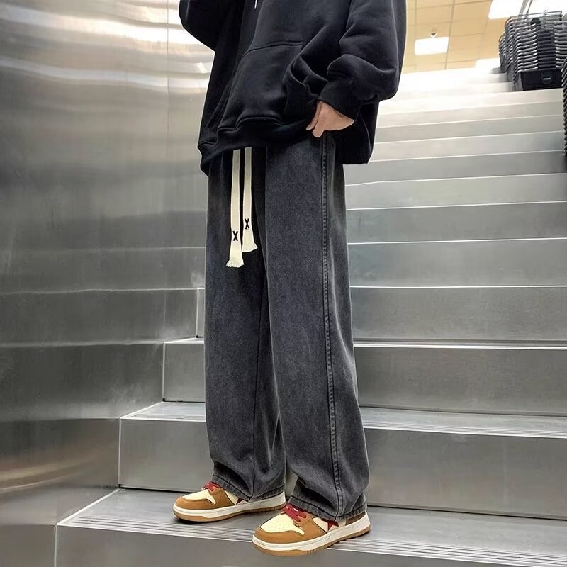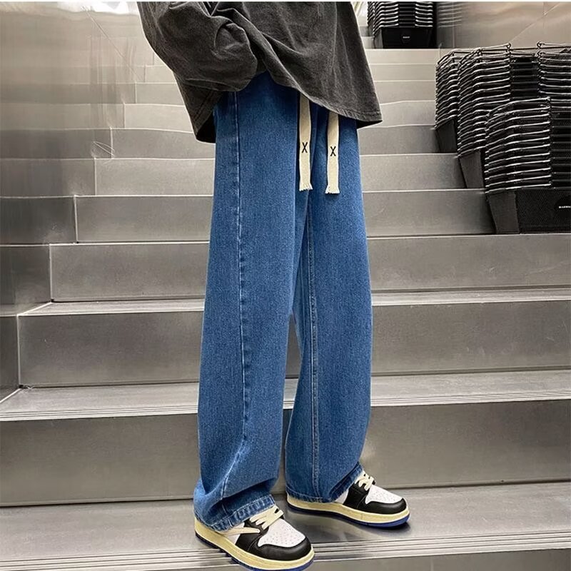 라이트 블루 청바지 남성 봄과 가을 드로우 스트링 느슨한 허리 스트레이트 바지 미국 스타일 하이 스트리트 바이브 스타일 바지