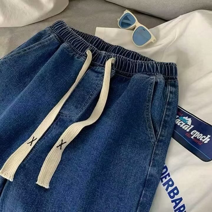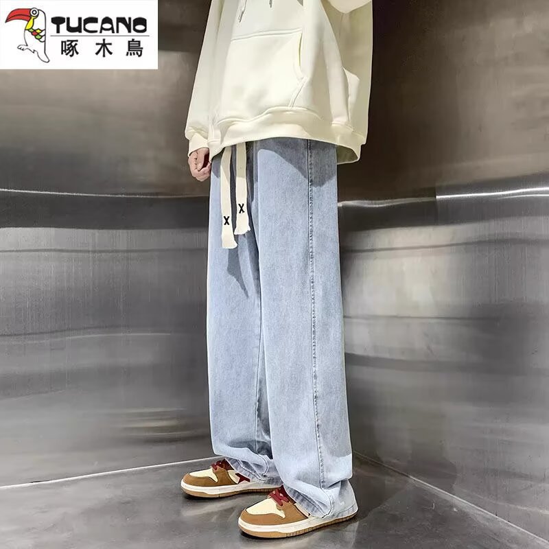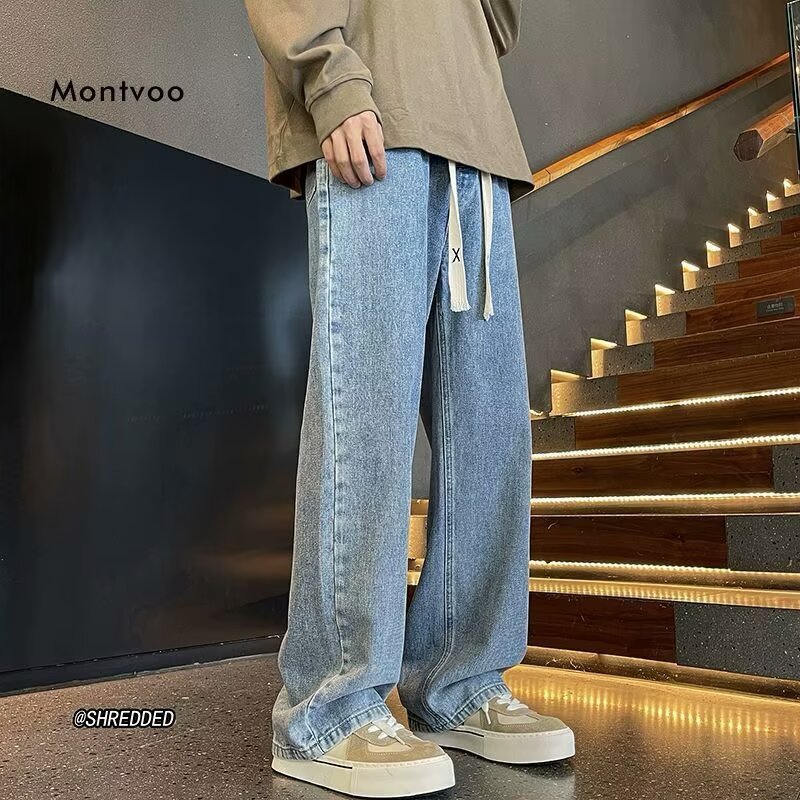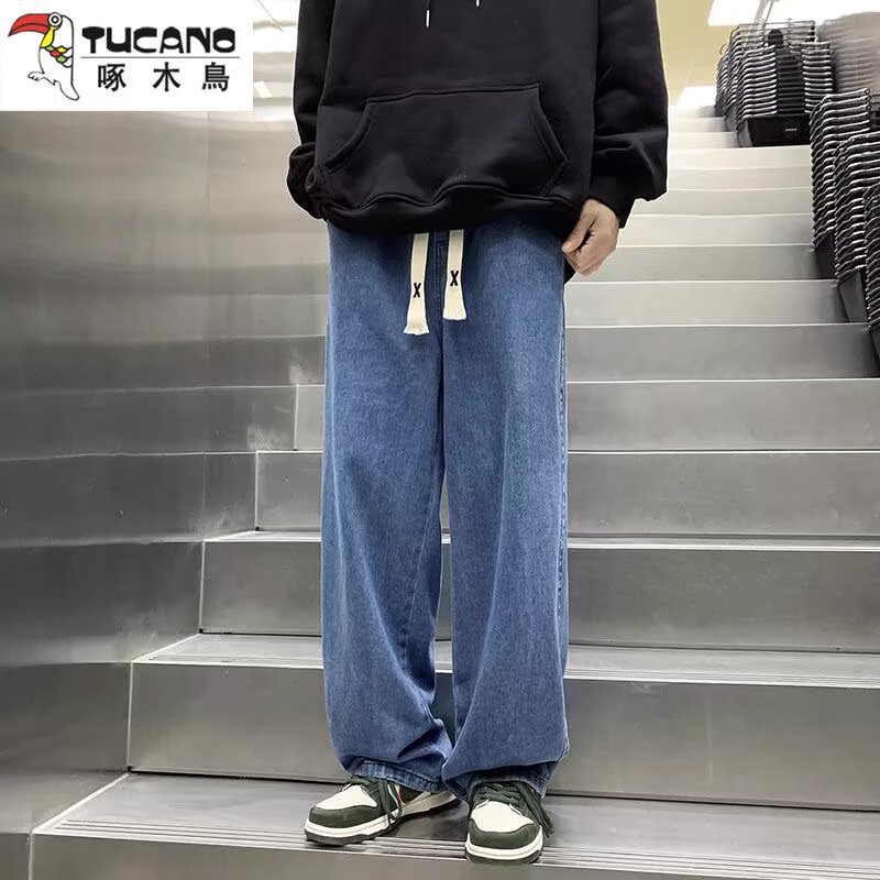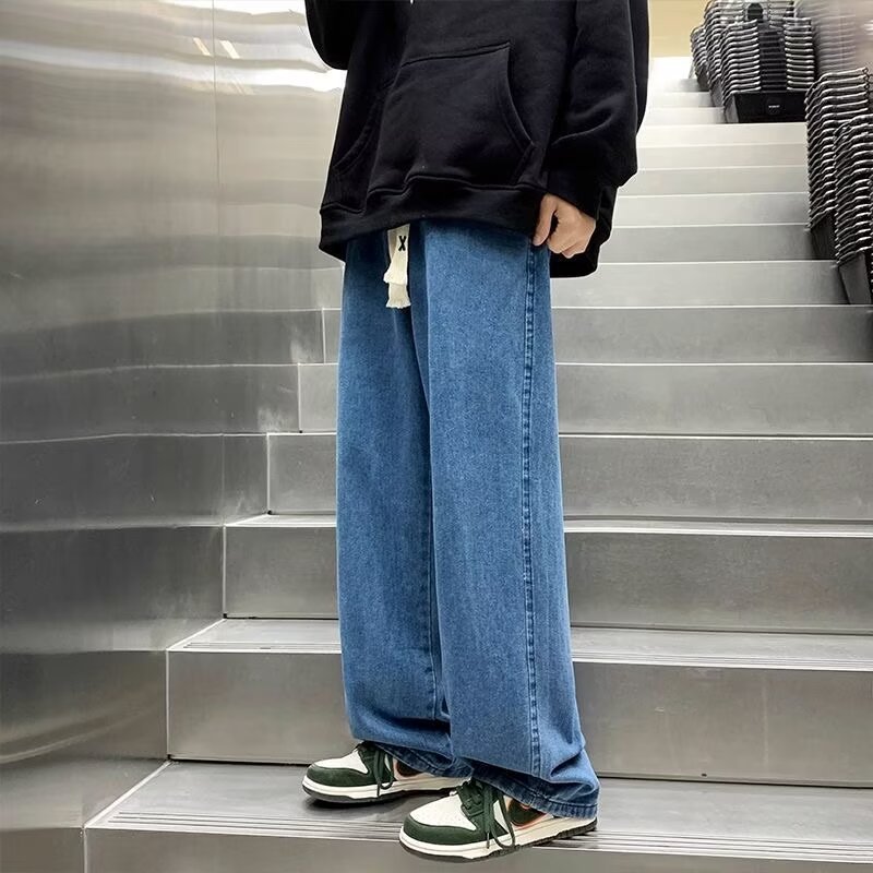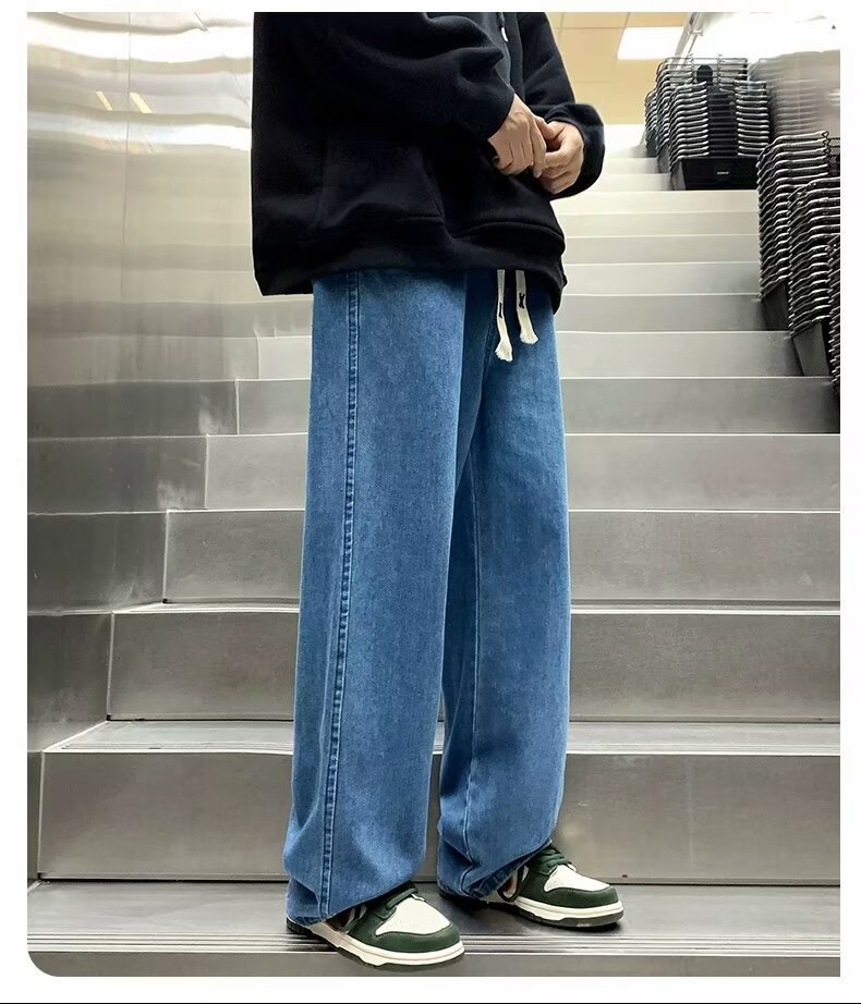 라이트 블루 청바지 남성 봄과 가을 드로우 스트링 느슨한 허리 스트레이트 바지 미국 스타일 하이 스트리트 바이브 스타일 바지스토어 가기