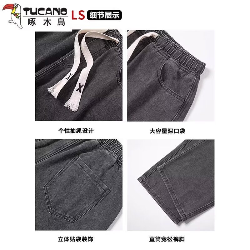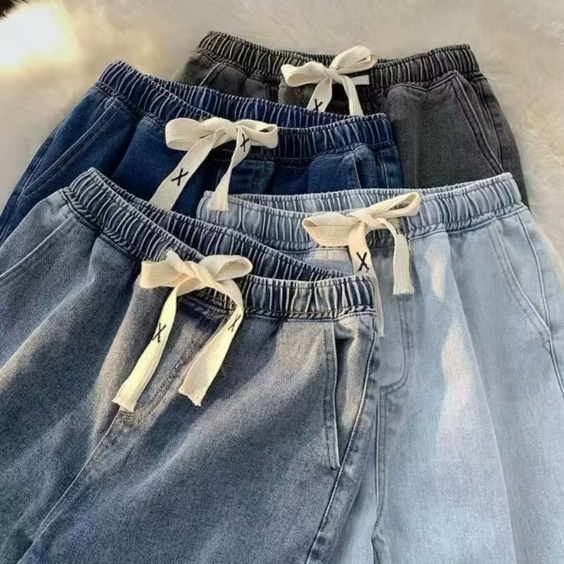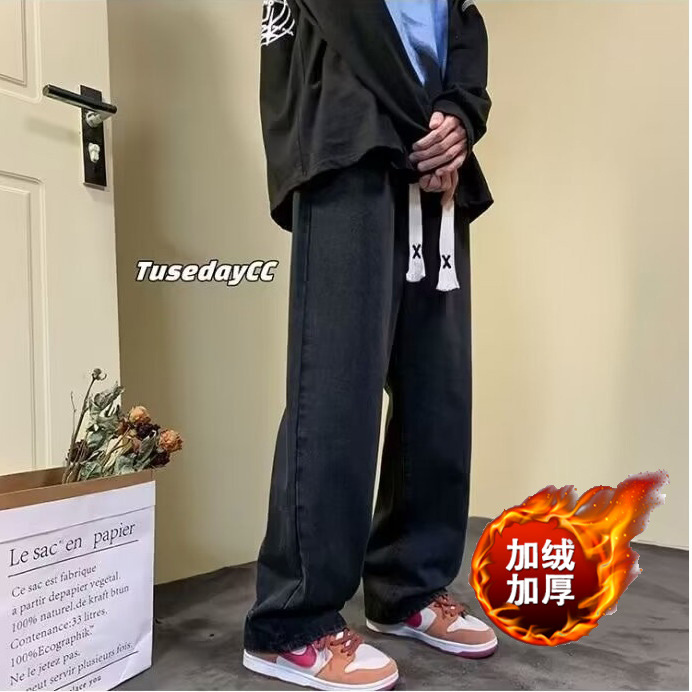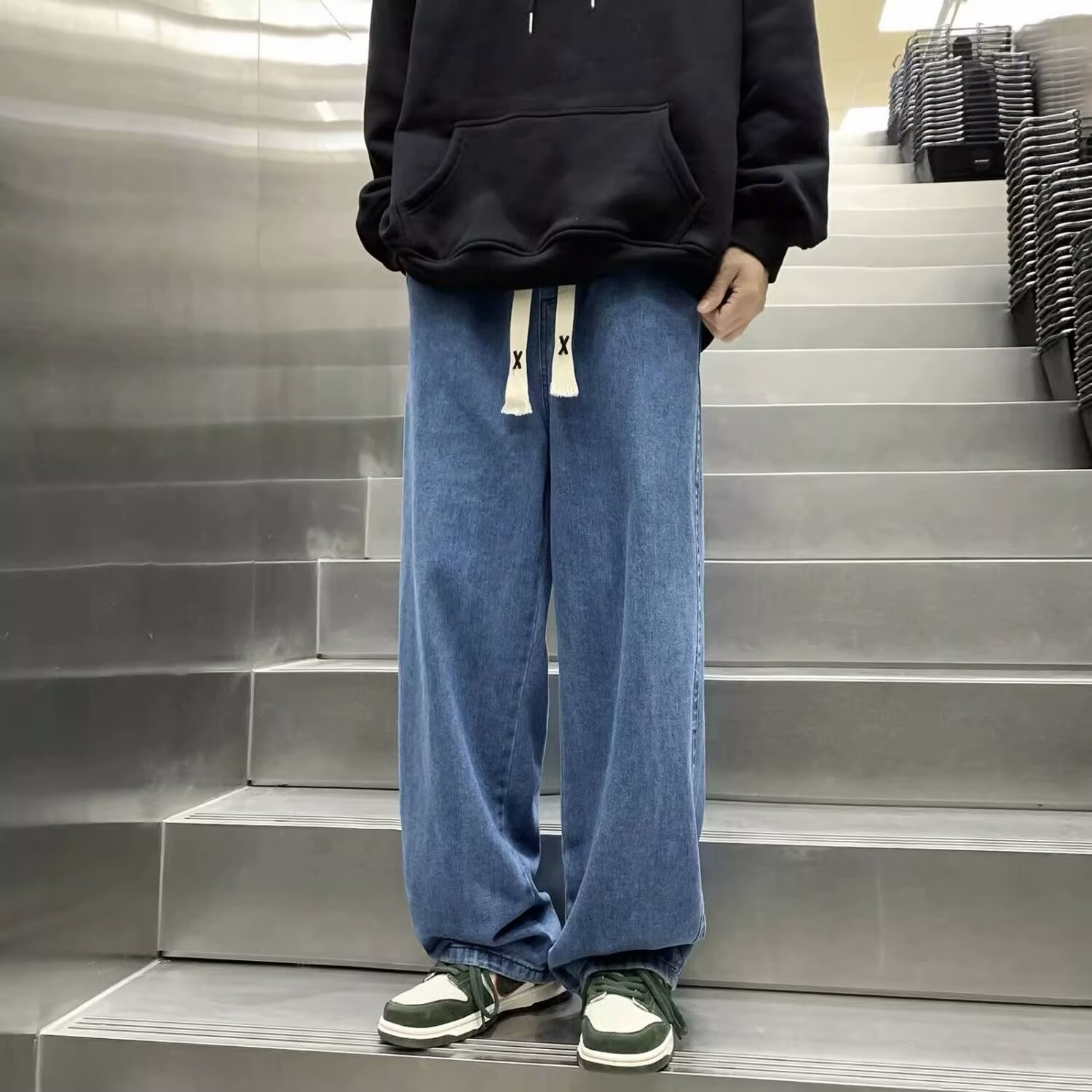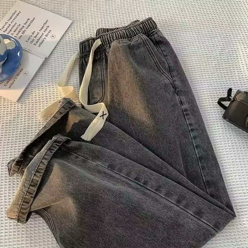 라이트 블루 청바지 남성 봄과 가을 드로우 스트링 느슨한 허리 스트레이트 바지 미국 스타일 하이 스트리트 바이브 스타일 바지스토어 가기