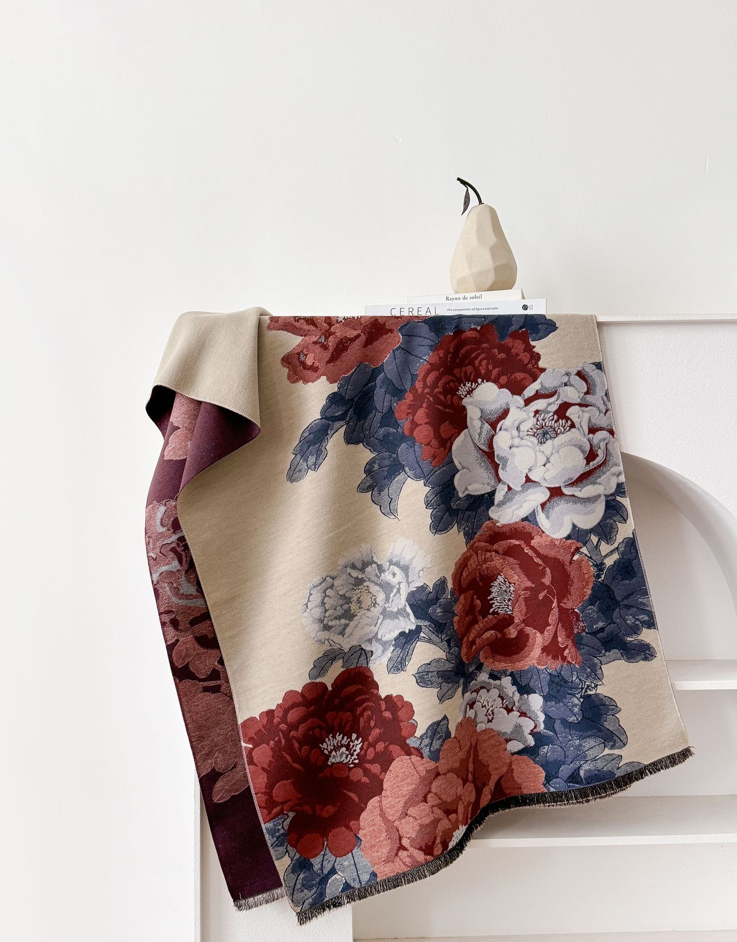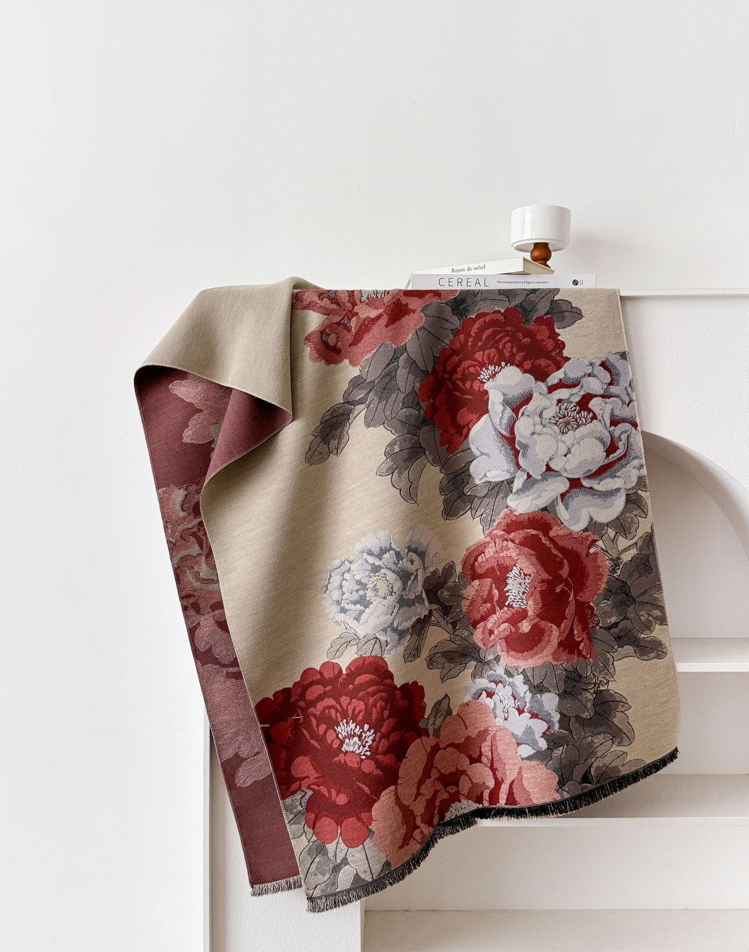 새로운 Guofeng 모란 꽃 인쇄 하이 엔드 센스 우아한 대비 컬러 스카프 모방 캐시미어 2024 가을 및 겨울 양면 목도리스토어 가기