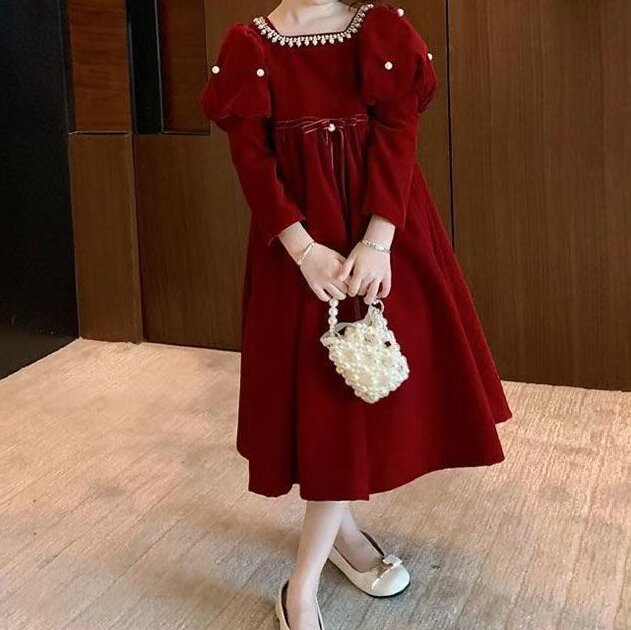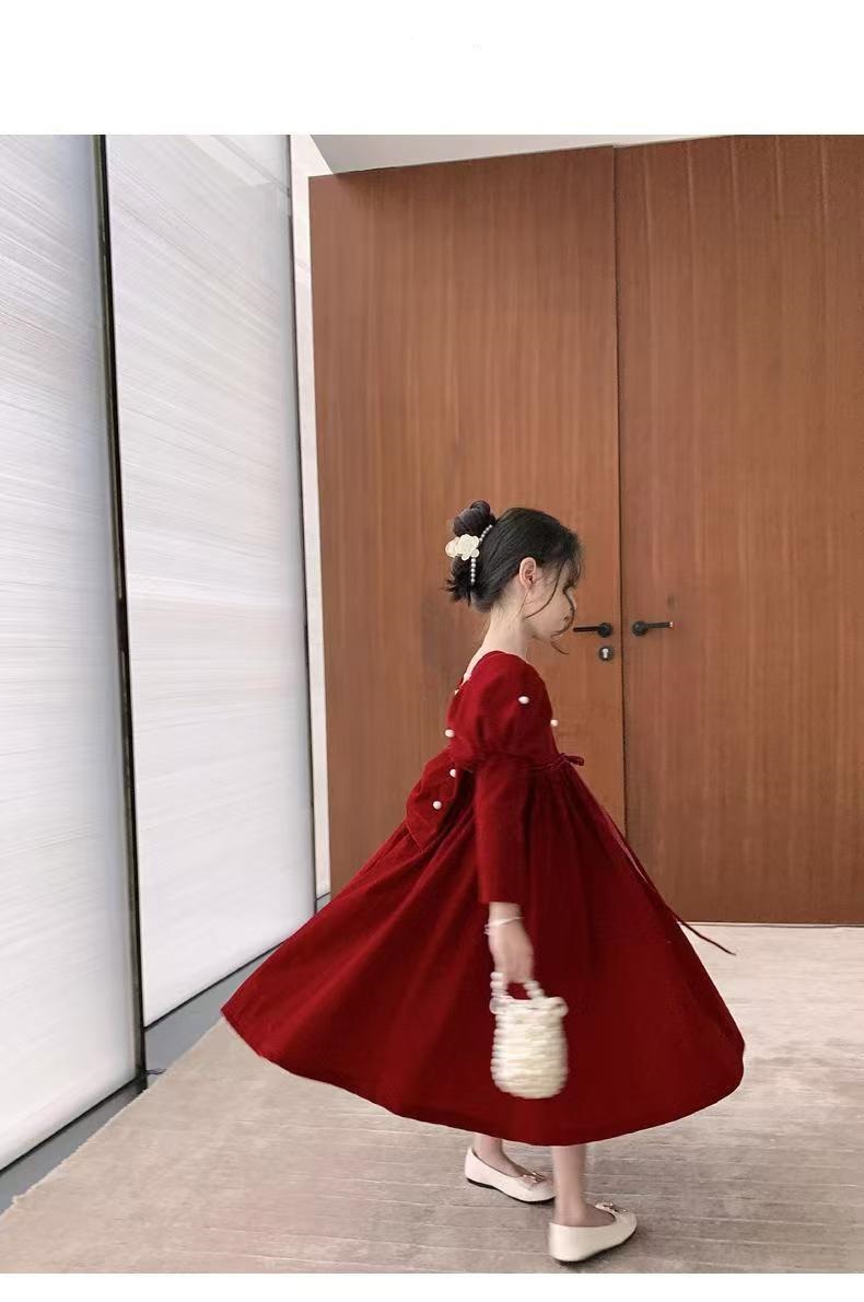 소녀 붉은 축제 원피스 2024 가을과 겨울 새로운 어린이 퍼프 소매 원피스 공주 원피스 여자 새해 원피스