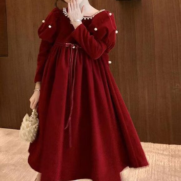 소녀 붉은 축제 원피스 2024 가을과 겨울 새로운 어린이 퍼프 소매 원피스 공주 원피스 여자 새해 원피스스토어 가기