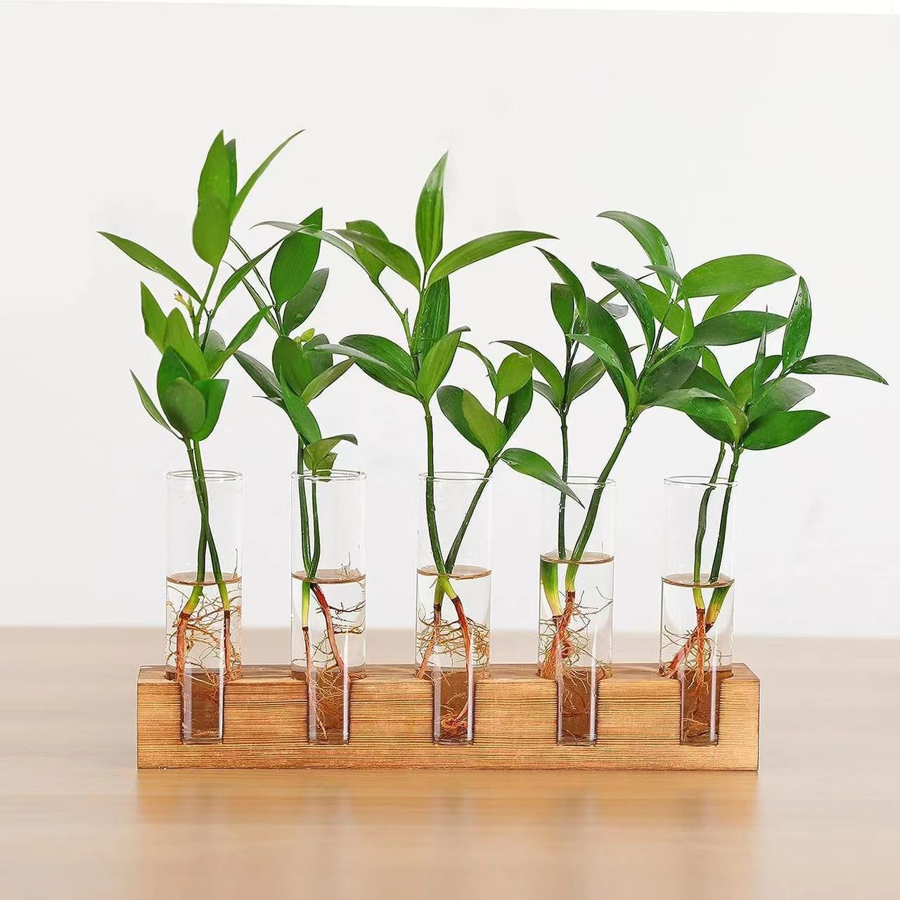 데스크탑 테스트 튜브 꽃병 나무 프레임 수경 식물 번식 역 녹색 장미 전파 역 유리 용기 나무 프레임 장식 장식품