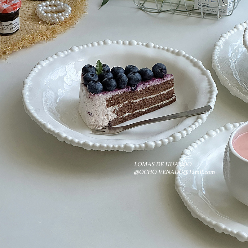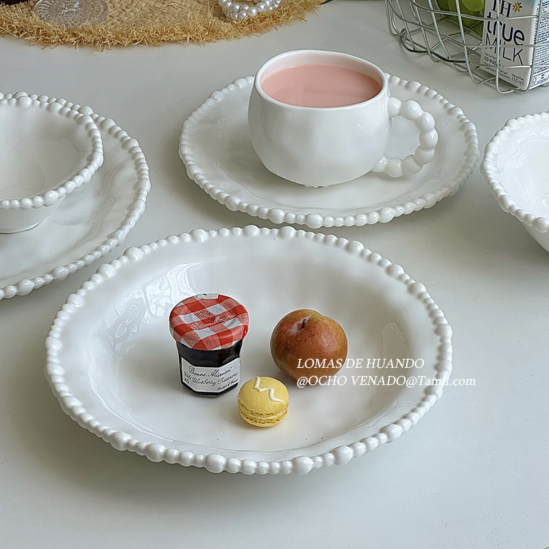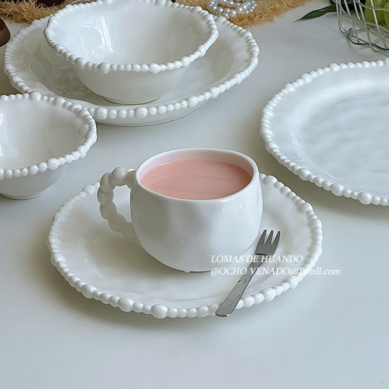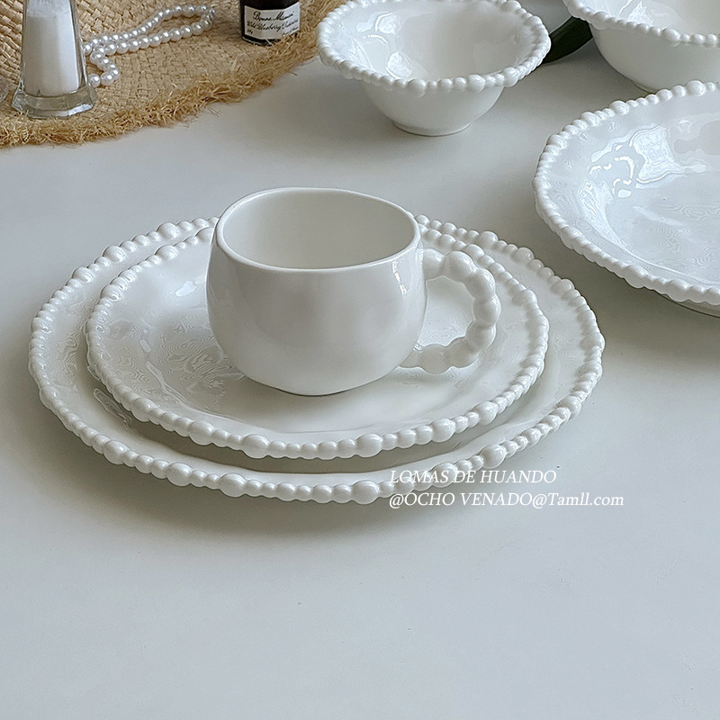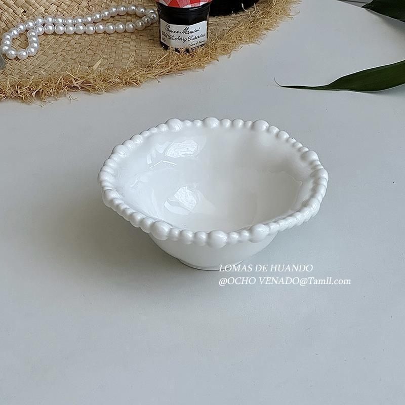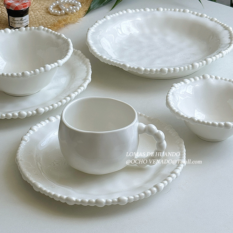 프랑스 스타일 간단한 순수한 흰색 진주 사이드 보울과 접시 콤비네이션 높은 색상 가치 서양 음식 그릇 및 디저트 케이크 플레이트 세라믹 Ins 스타일스토어 가기