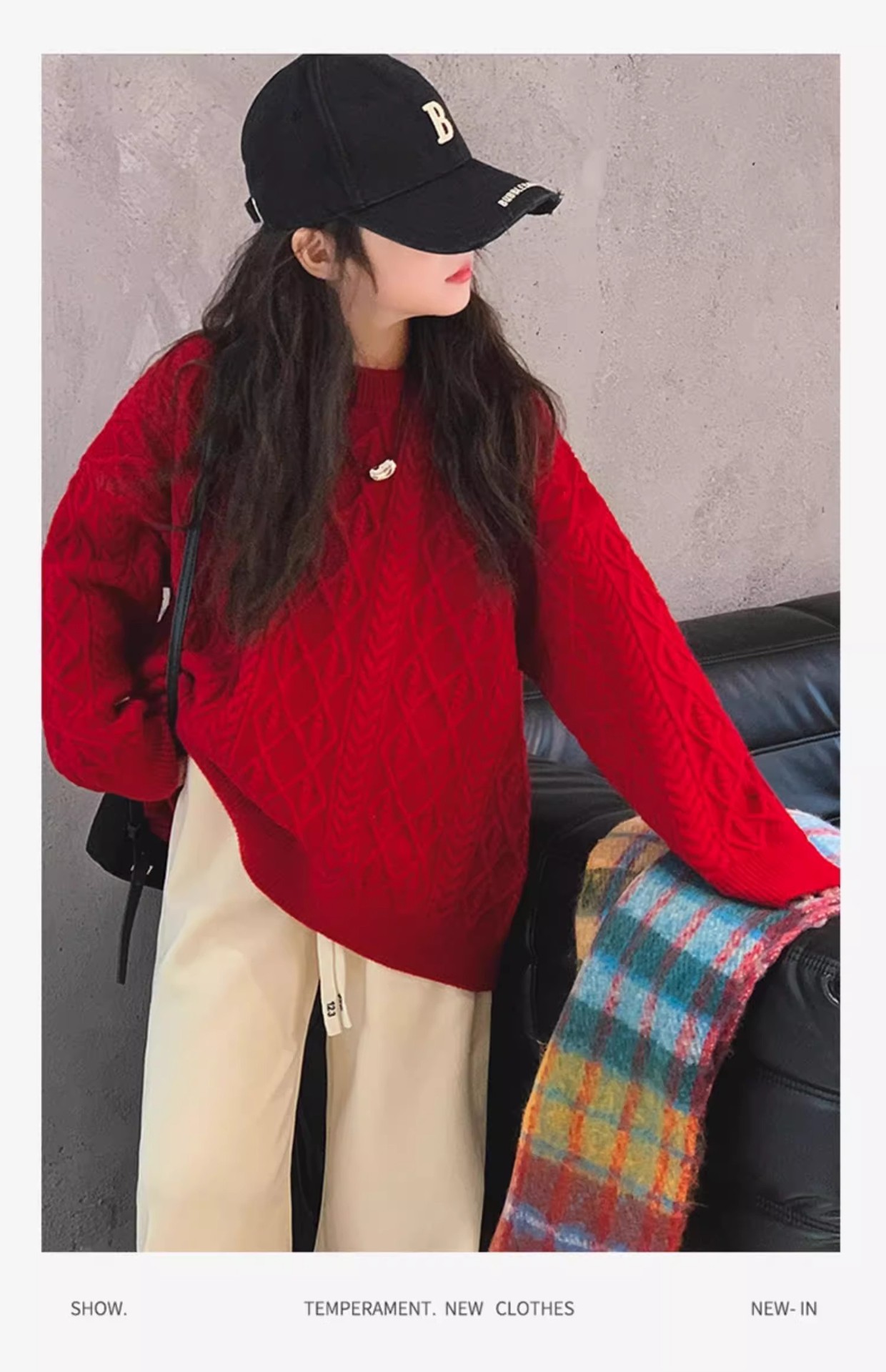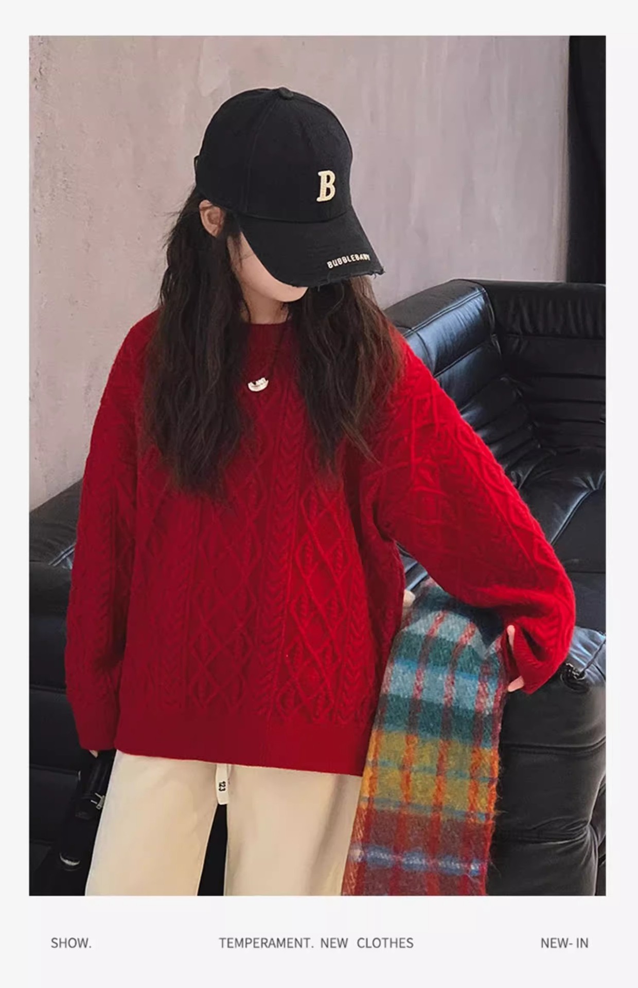 소녀 니트 스웨터 2024 새로운 서양 스타일 큰 아이들 8-15 세 가을과 겨울 앙고라 레드 탑스토어 가기
