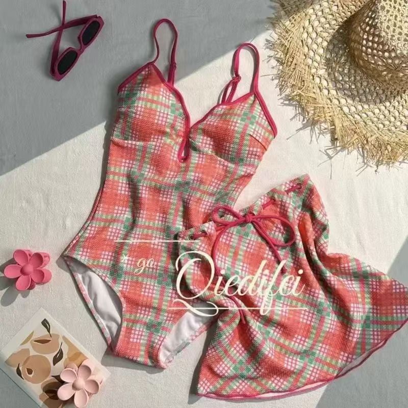 Hua Shaona Za 같은 스타일 태국 격자 무늬 수영복 작은 신선한 복고풍 학생 수영복 삼각형 원피스 휴일 수영복스토어 가기