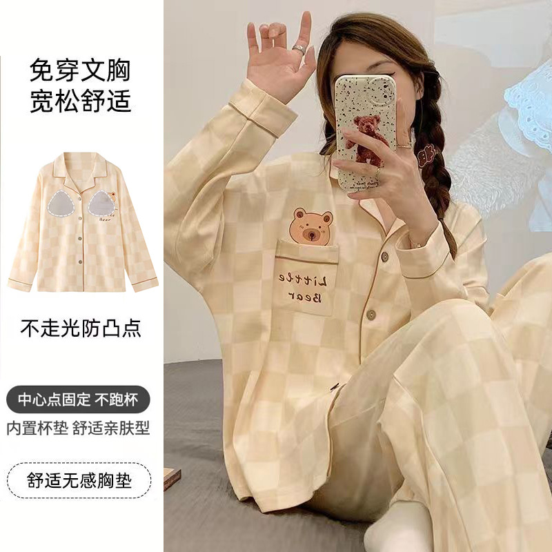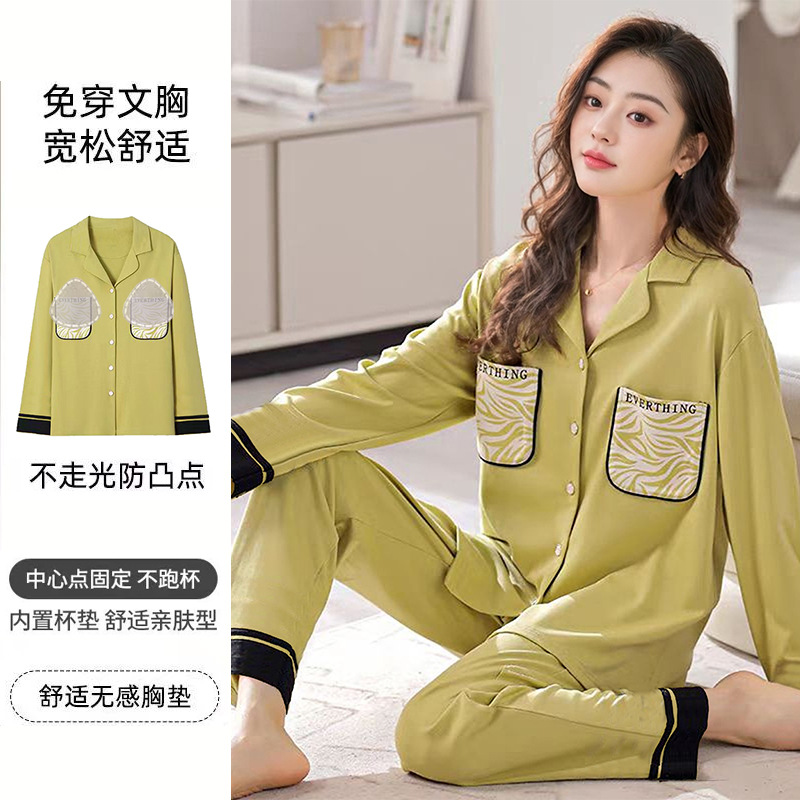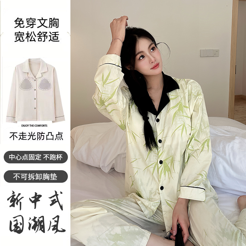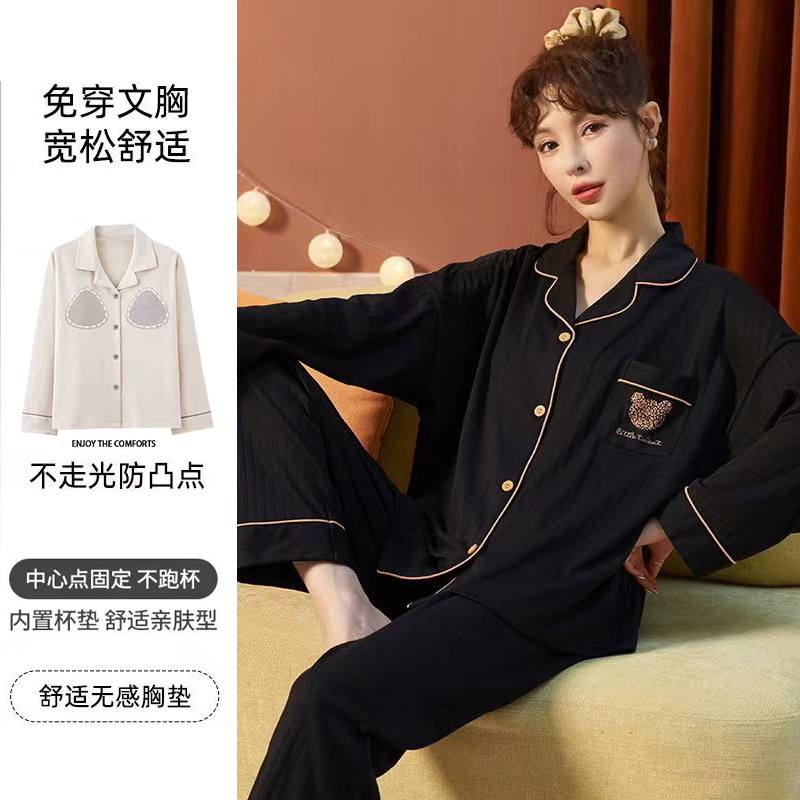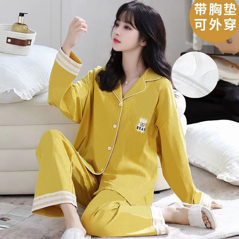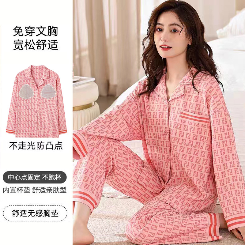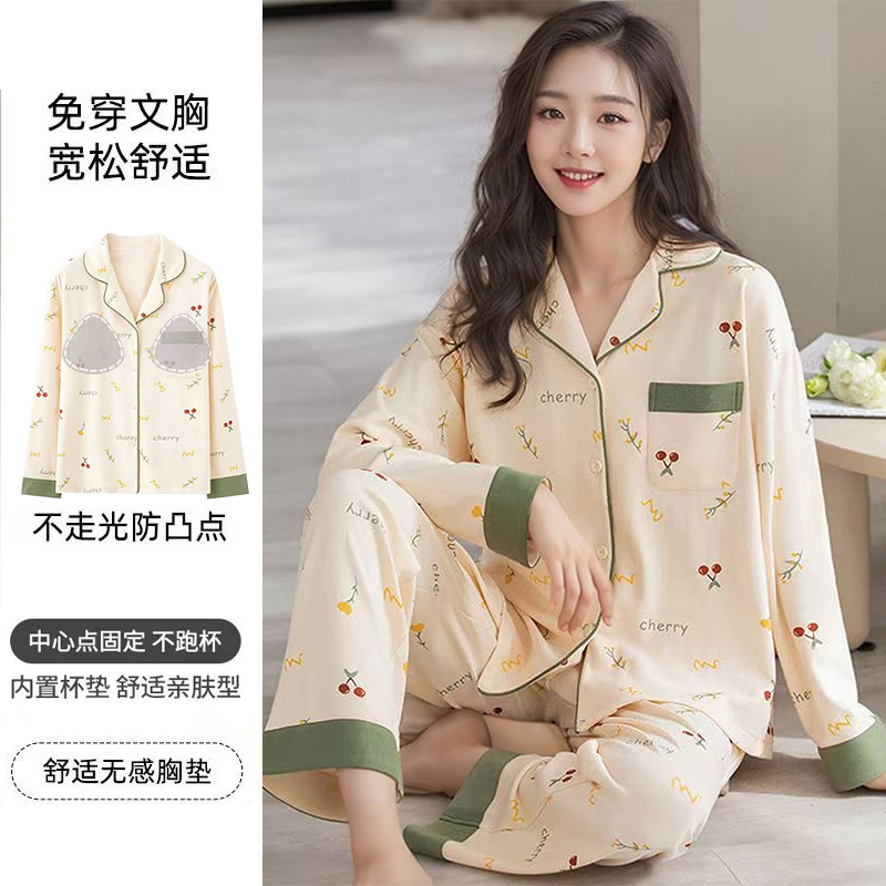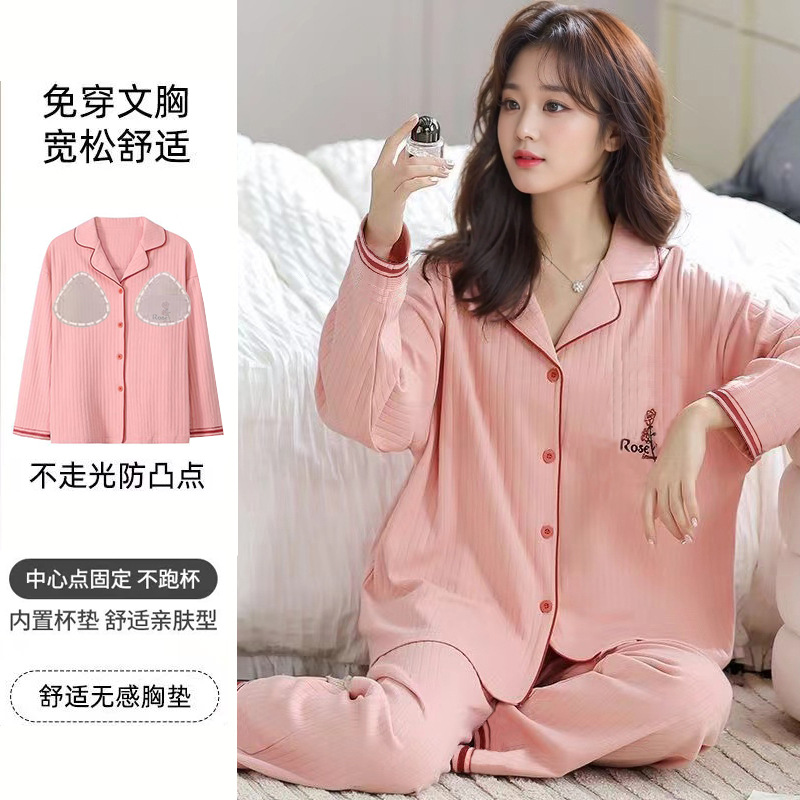 가슴 패드가 달린 면 잠옷 여성의 봄과 가을 긴 소매 2024 새로운 플러스 사이즈 가을 및 겨울 홈 옷 세트 입을 수 있습니다스토어 가기