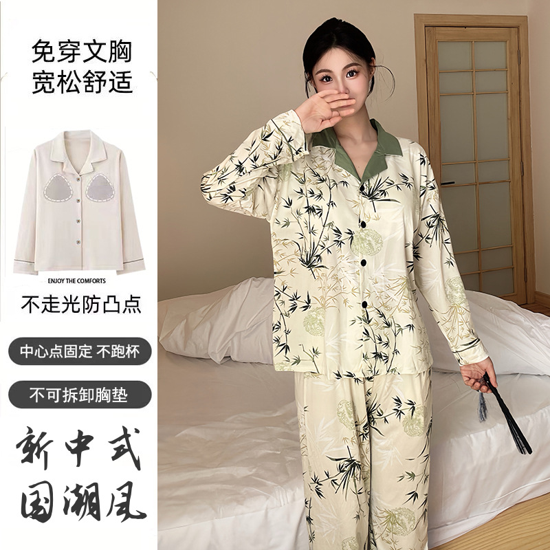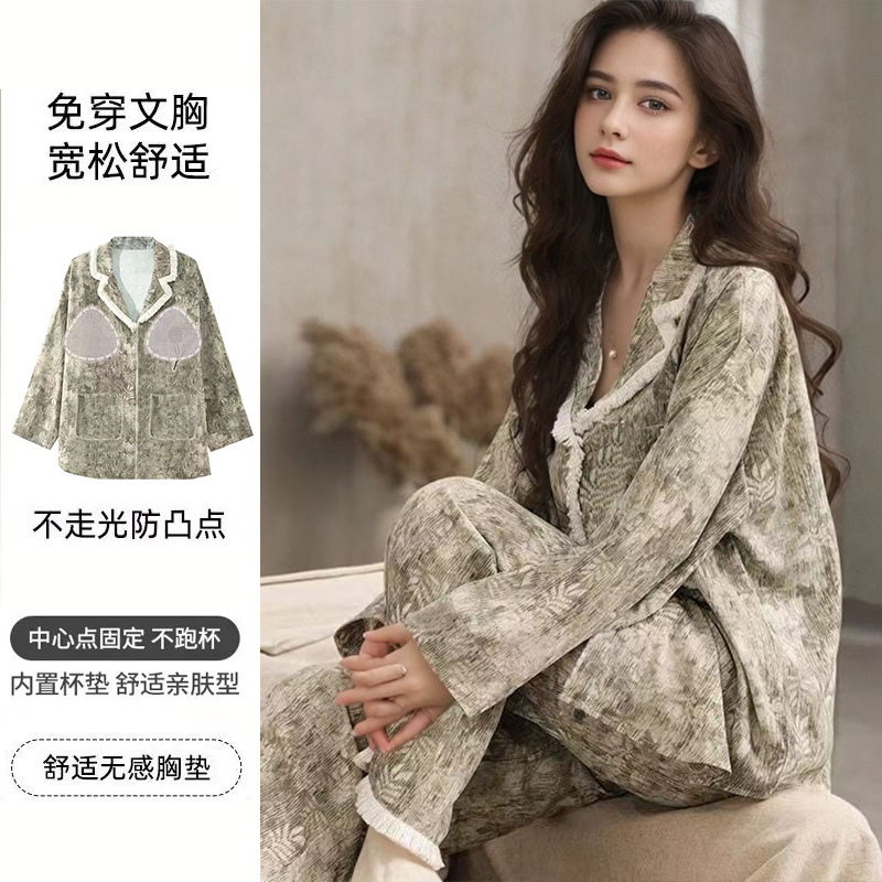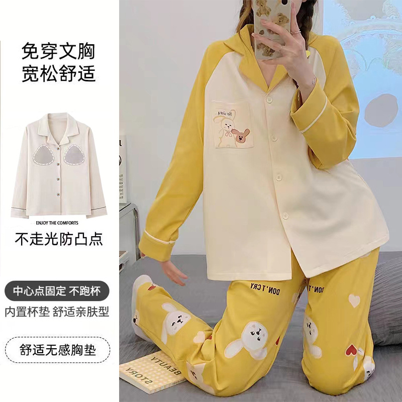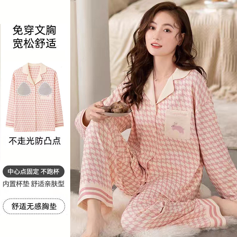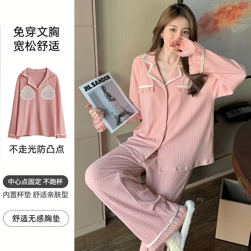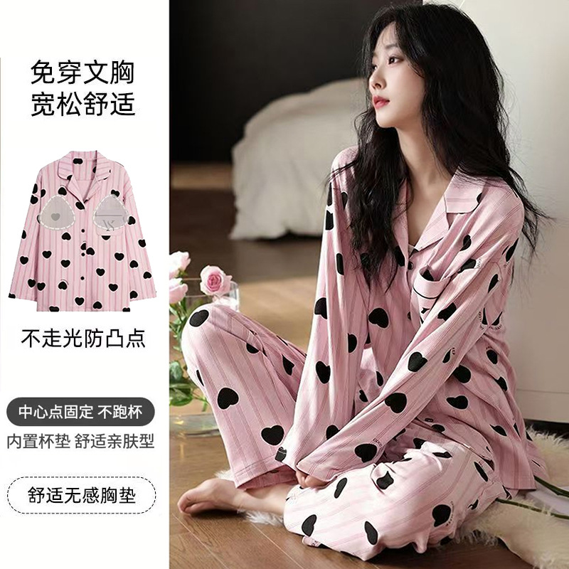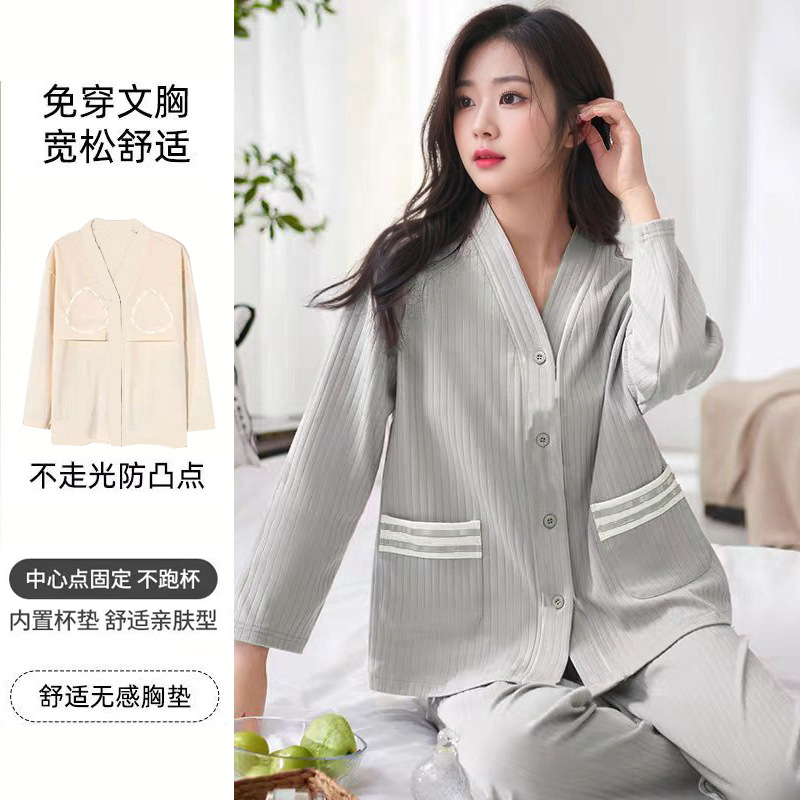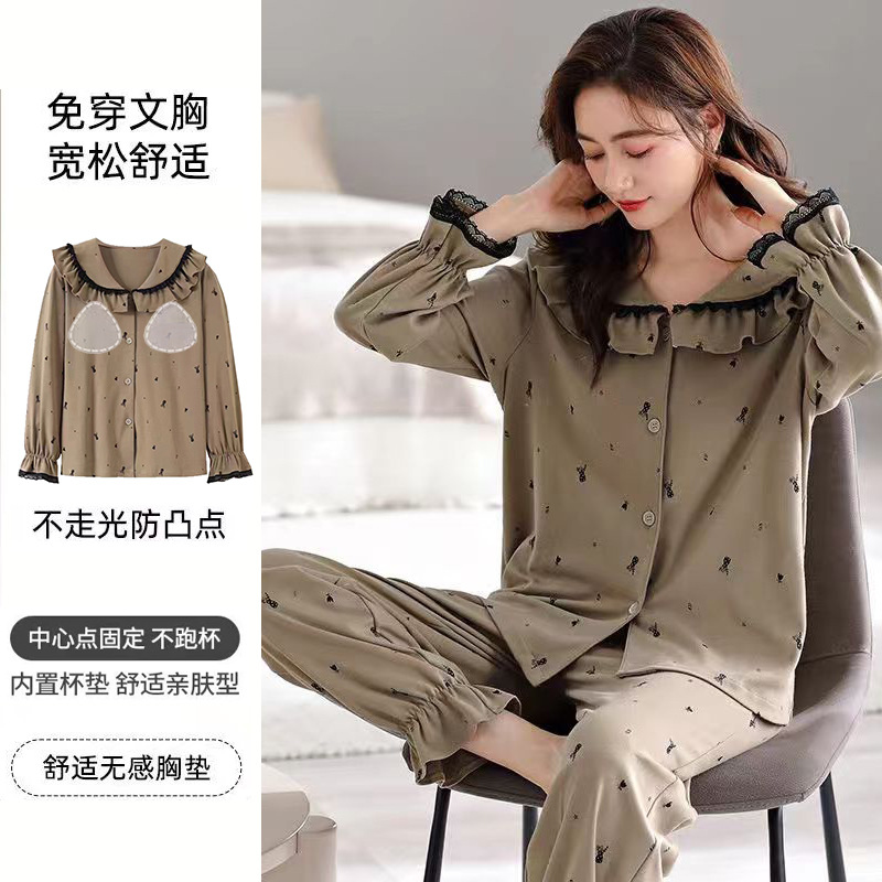 가슴 패드가 달린 면 잠옷 여성의 봄과 가을 긴 소매 2024 새로운 플러스 사이즈 가을 및 겨울 홈 옷 세트 입을 수 있습니다스토어 가기