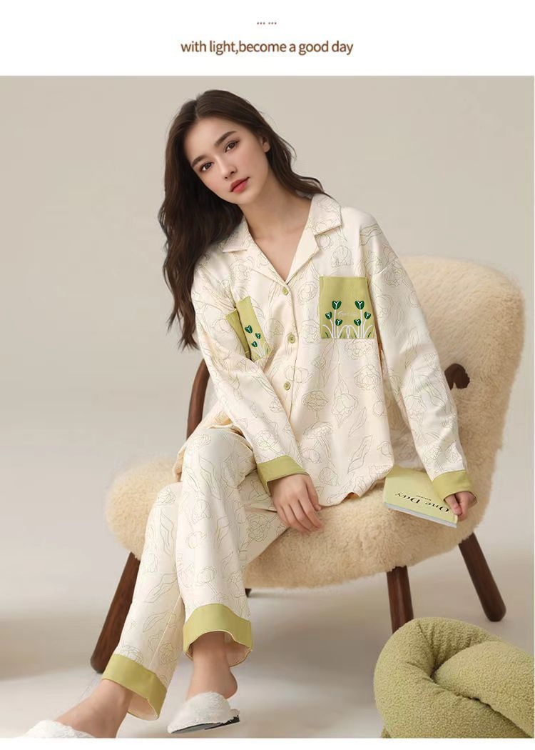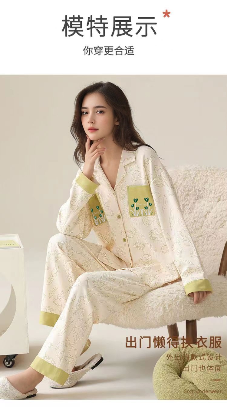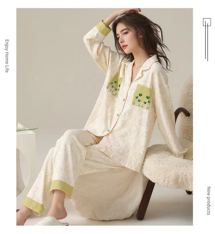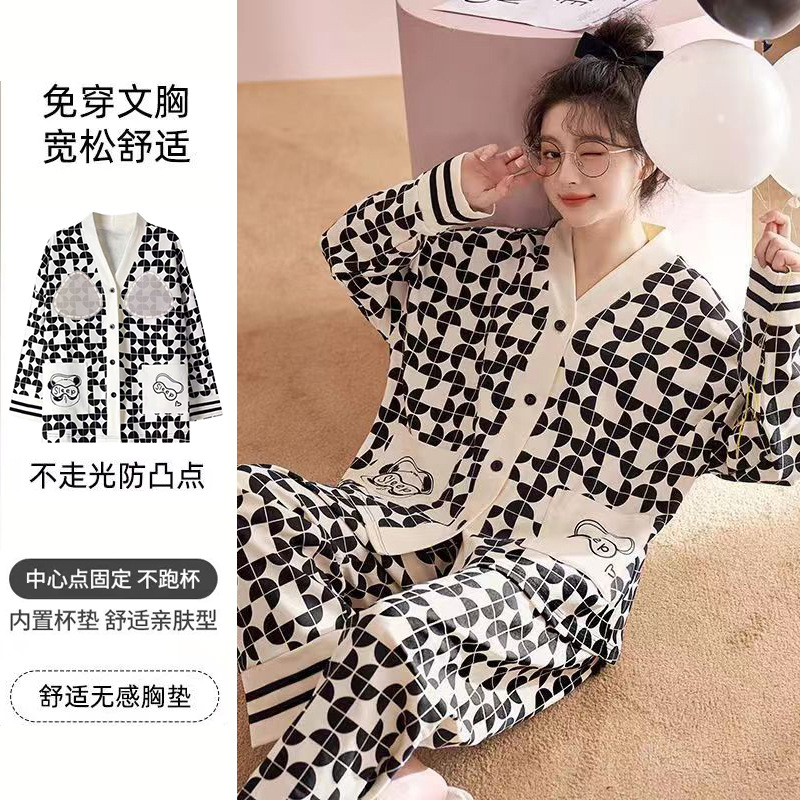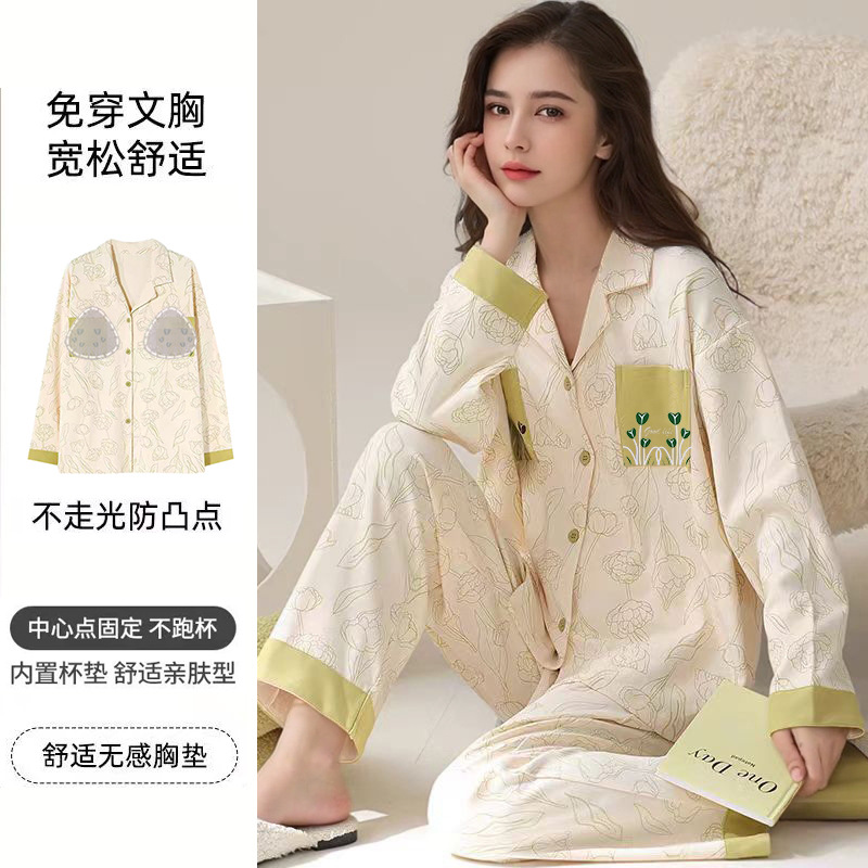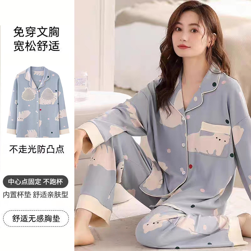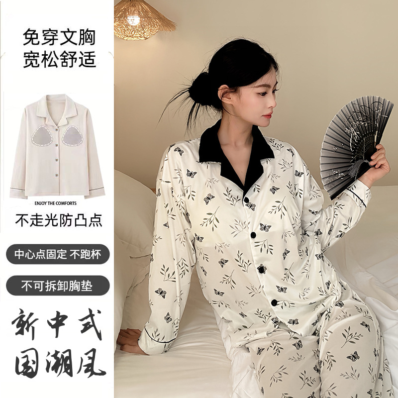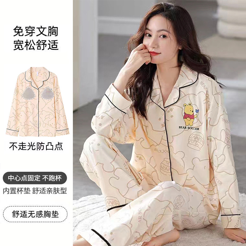 가슴 패드가 달린 면 잠옷 여성의 봄과 가을 긴 소매 2024 새로운 플러스 사이즈 가을 및 겨울 홈 옷 세트 입을 수 있습니다스토어 가기