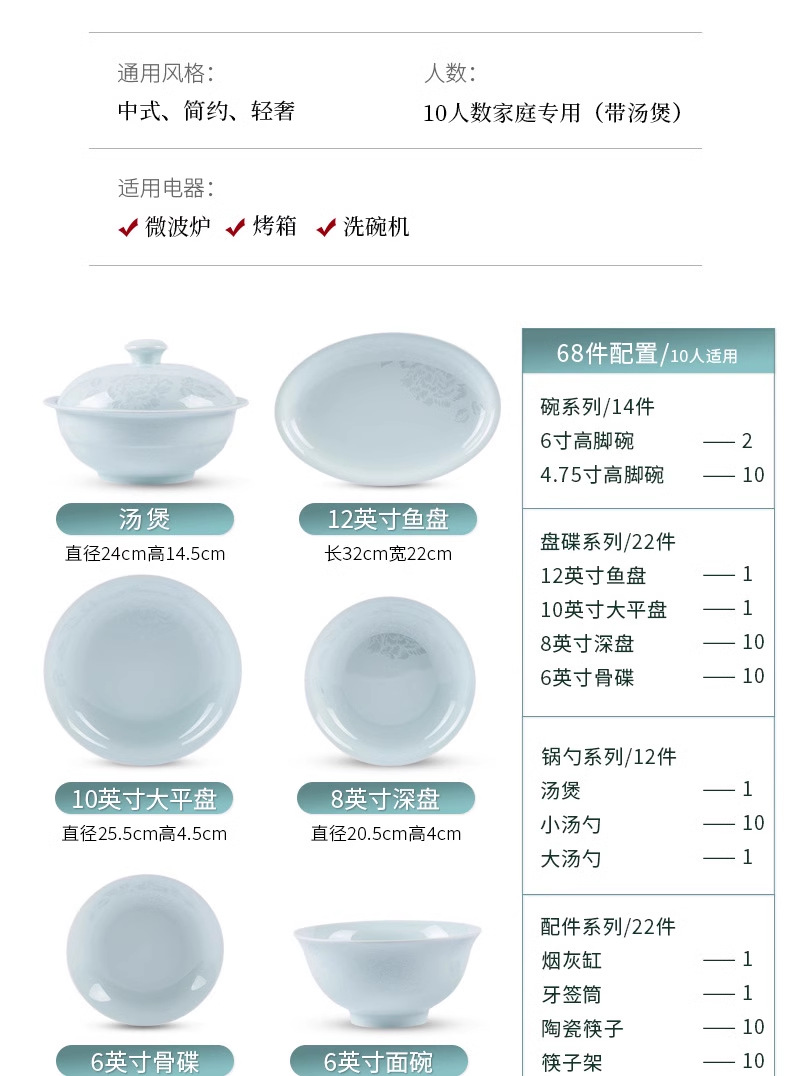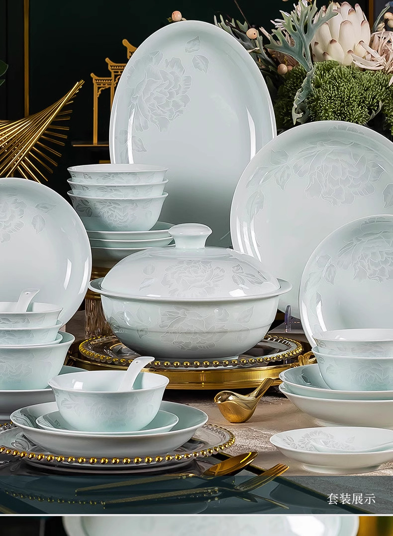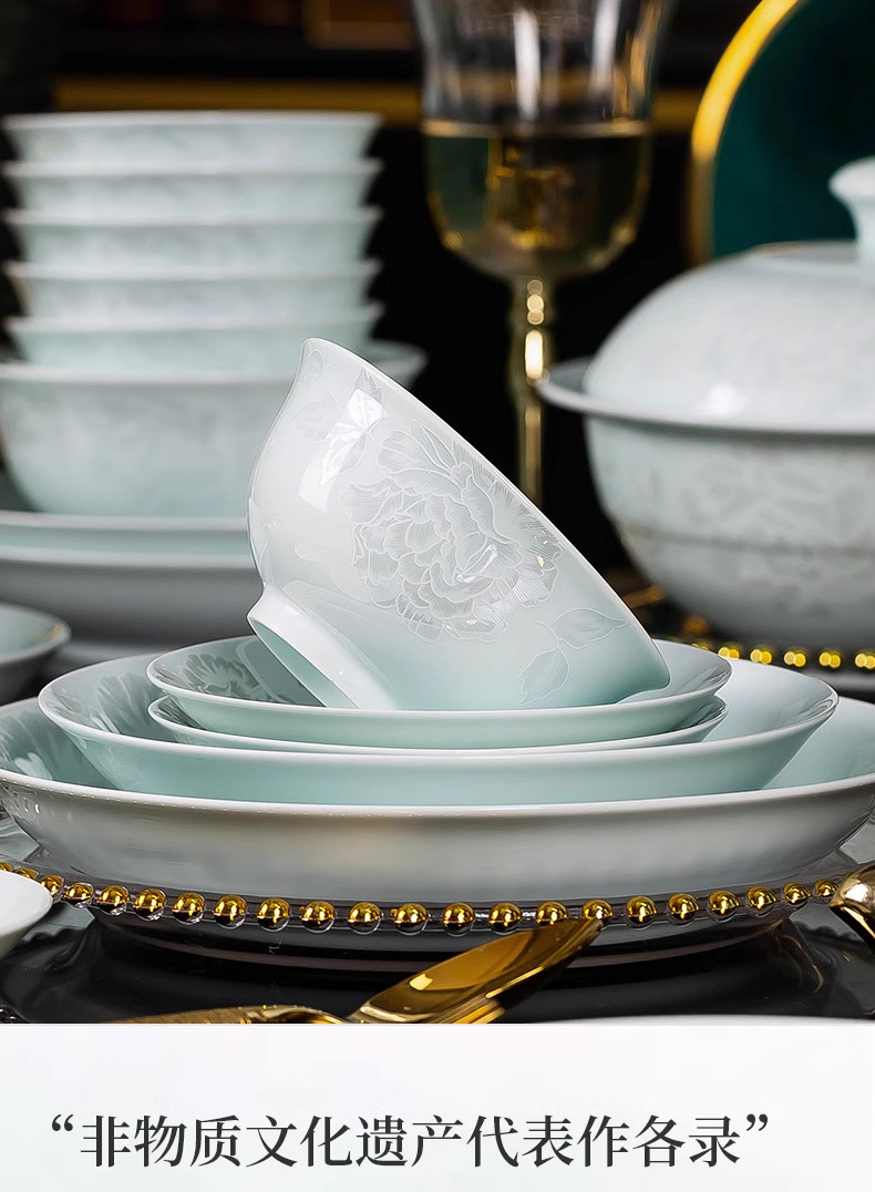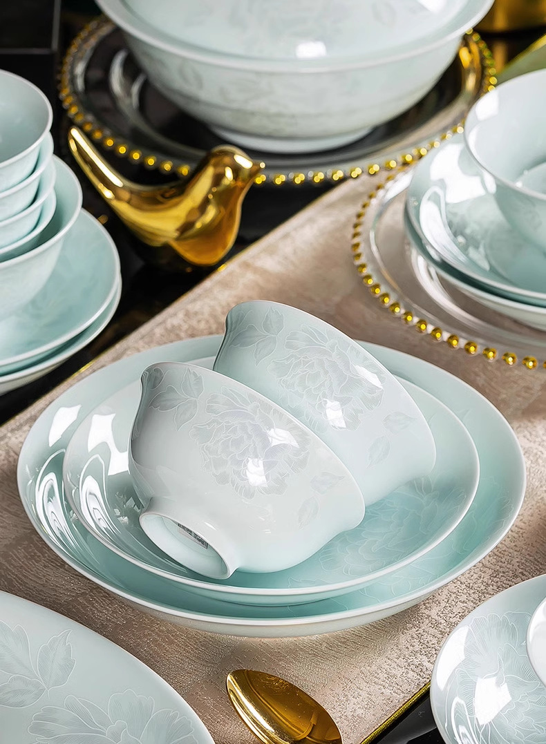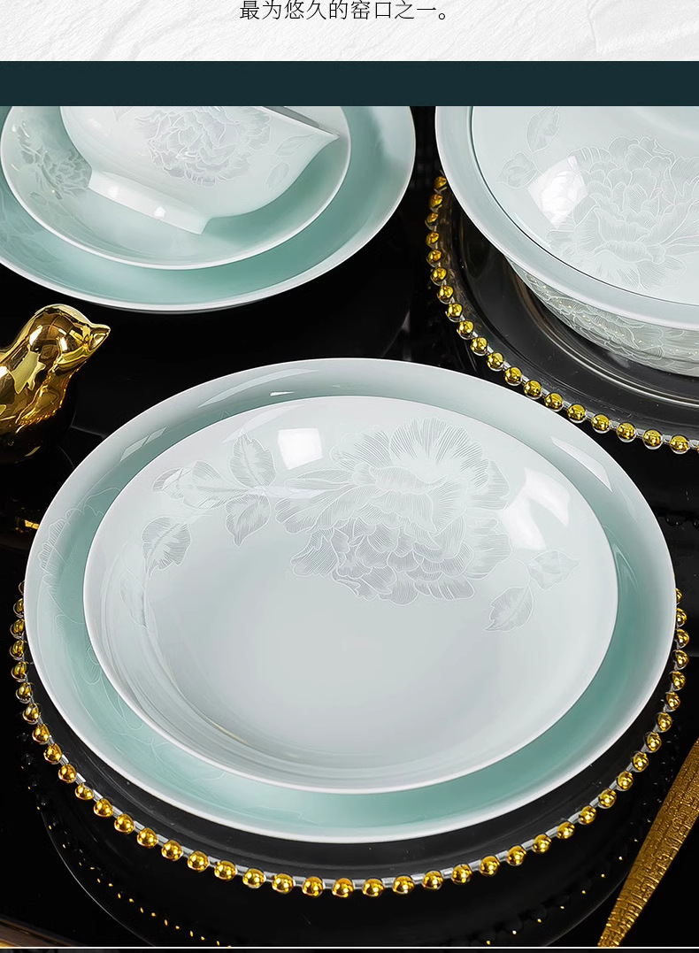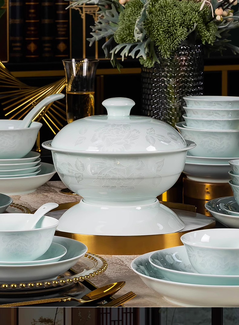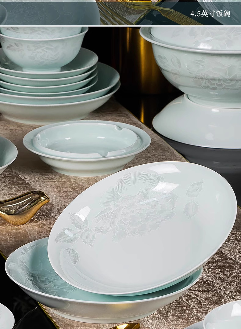 고급 흰색 도자기 요리 및 도금 Jingdezhen 세라믹 식기 고온 녹색 유약 중국 단일 식사 그릇 국수 그릇 수프 그릇