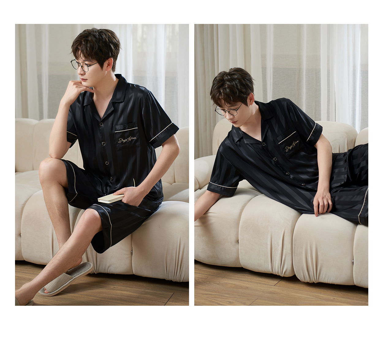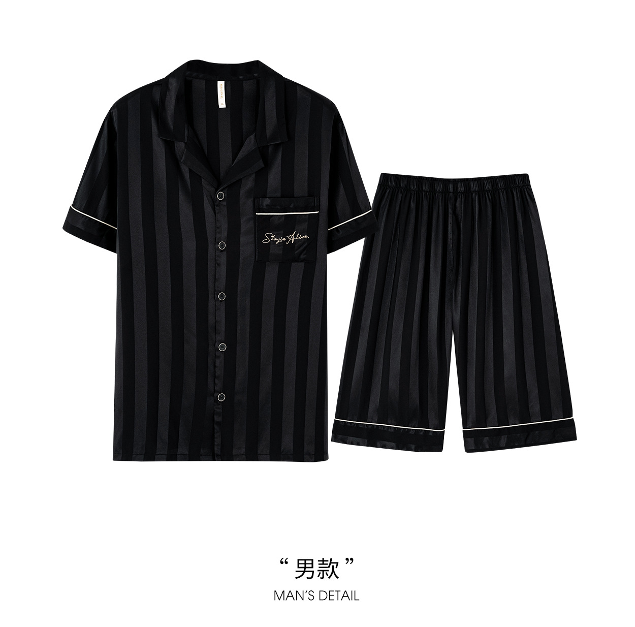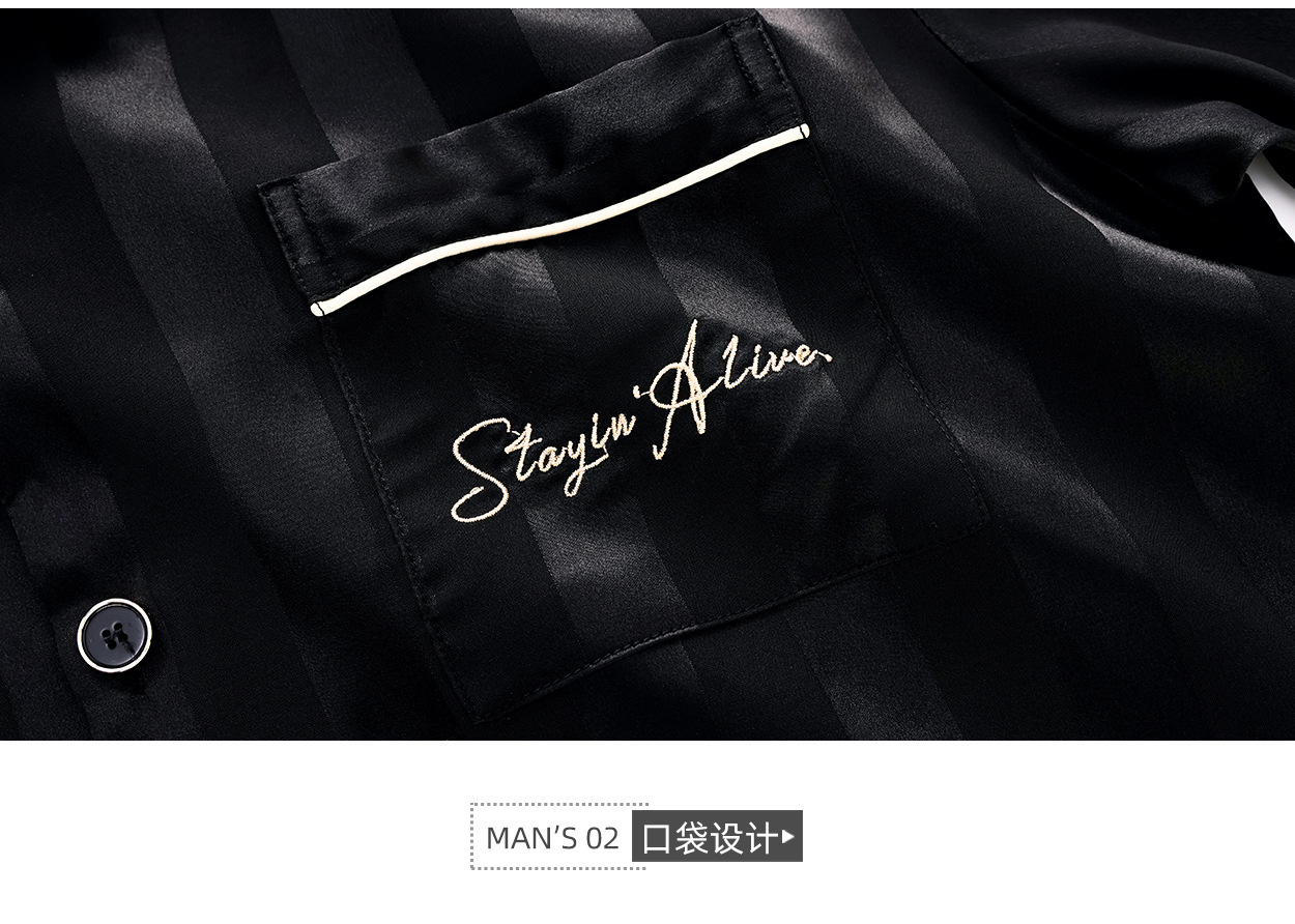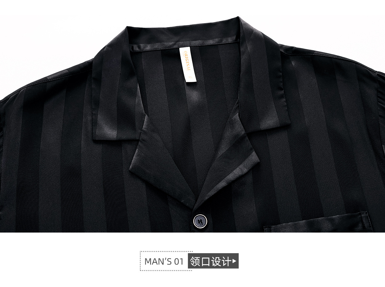 커플 잠옷 여자 여름 아이스 실크 고급 줄무늬 반팔 남자 반바지 세트 멋진 홈 옷