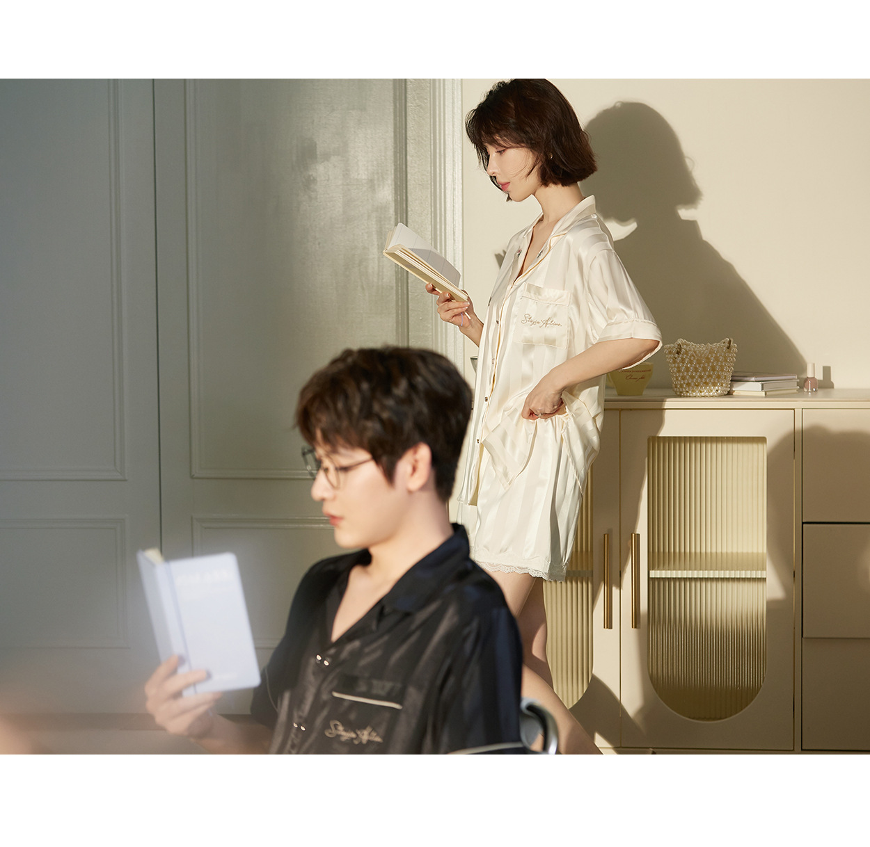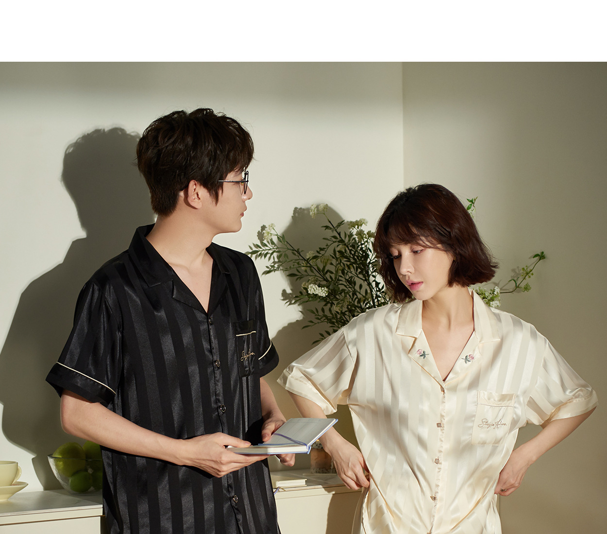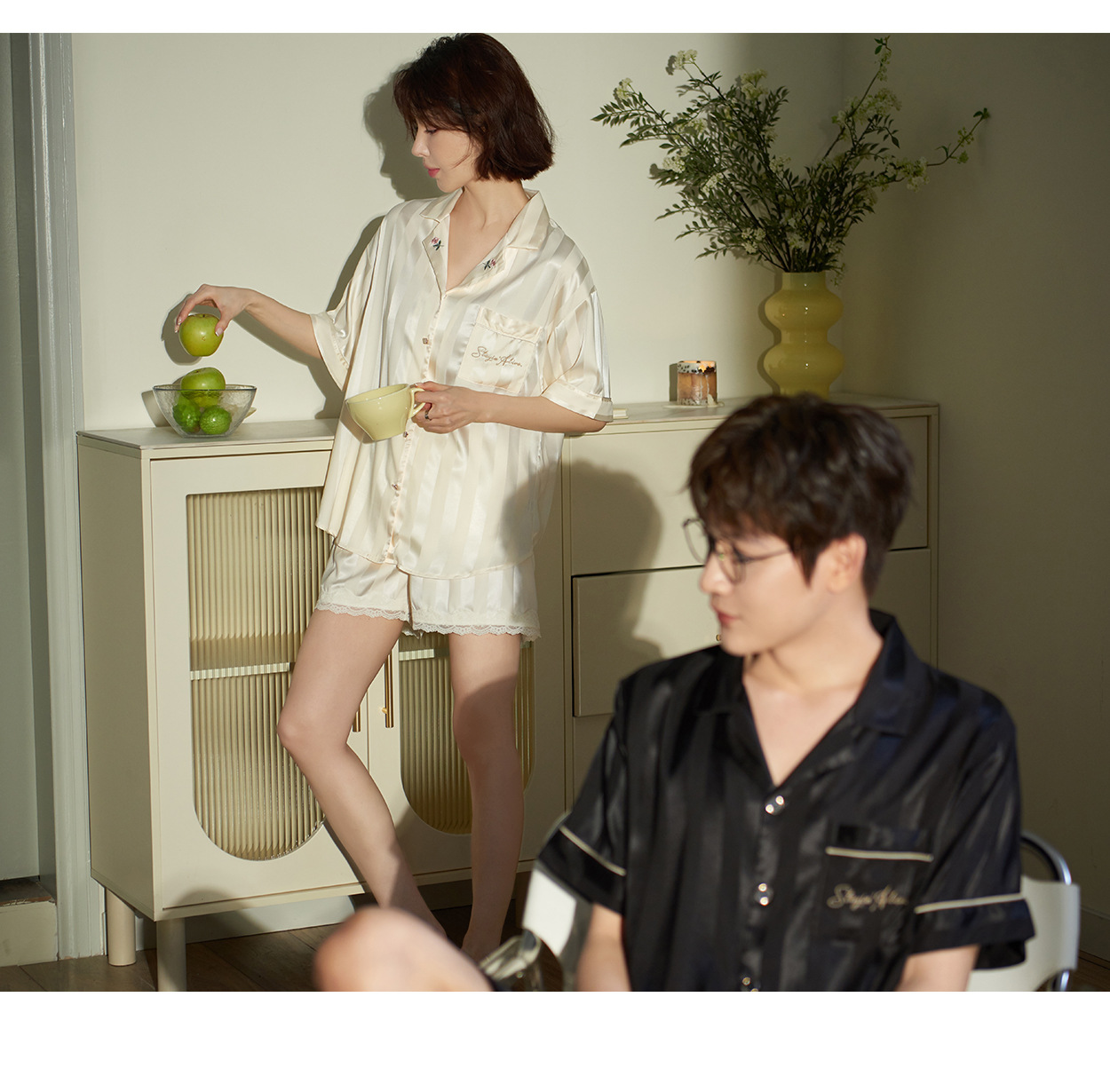 커플 잠옷 여자 여름 아이스 실크 고급 줄무늬 반팔 남자 반바지 세트 멋진 홈 옷