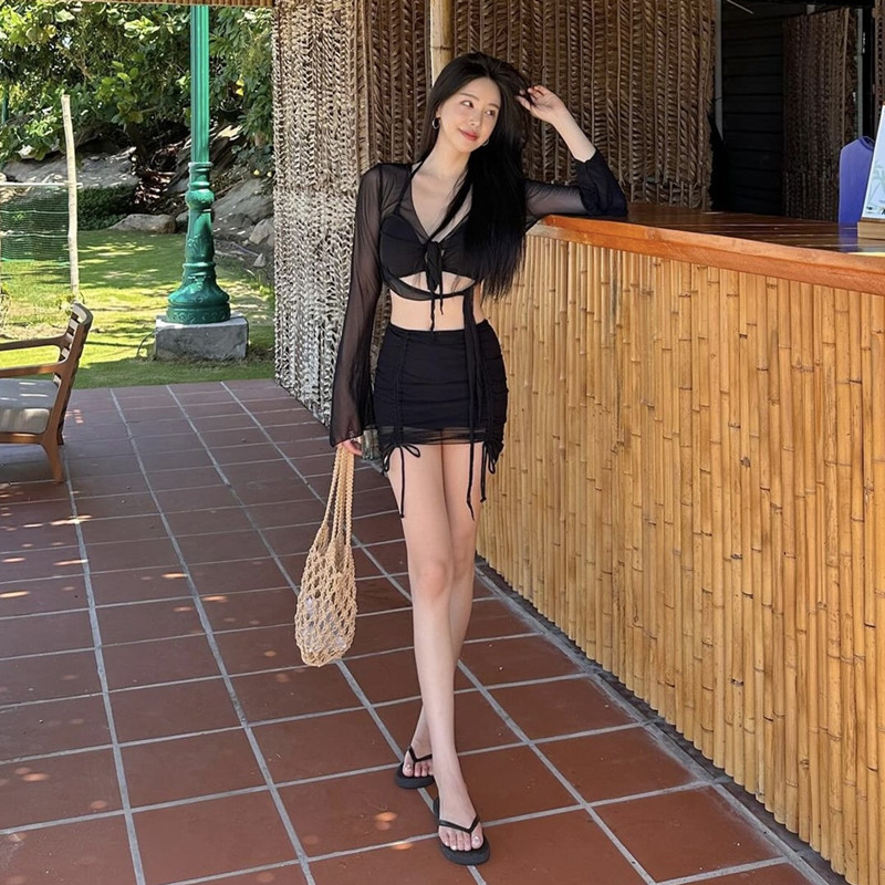 여성용 고급 얇은 명주 반투명 긴팔 자외선 차단제 블라우스 3 피스 스커트 비키니 스플릿 수영복스토어 가기