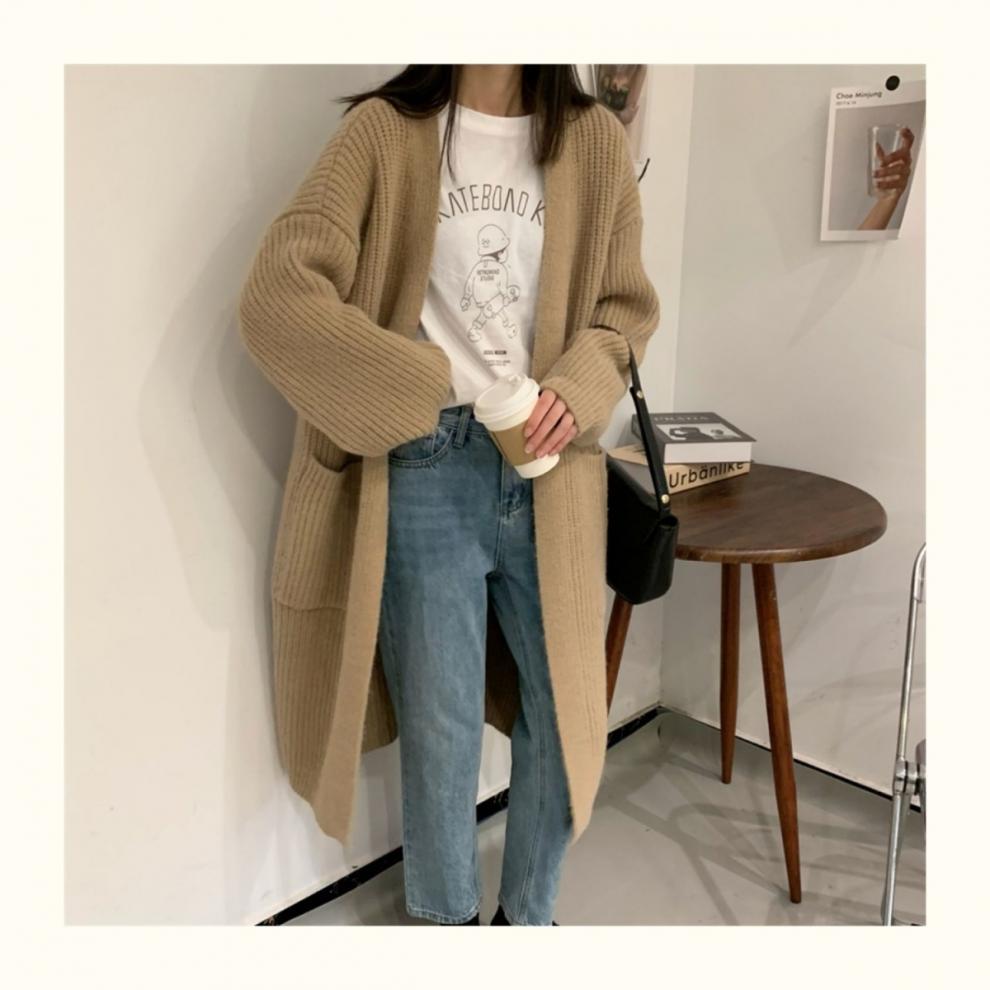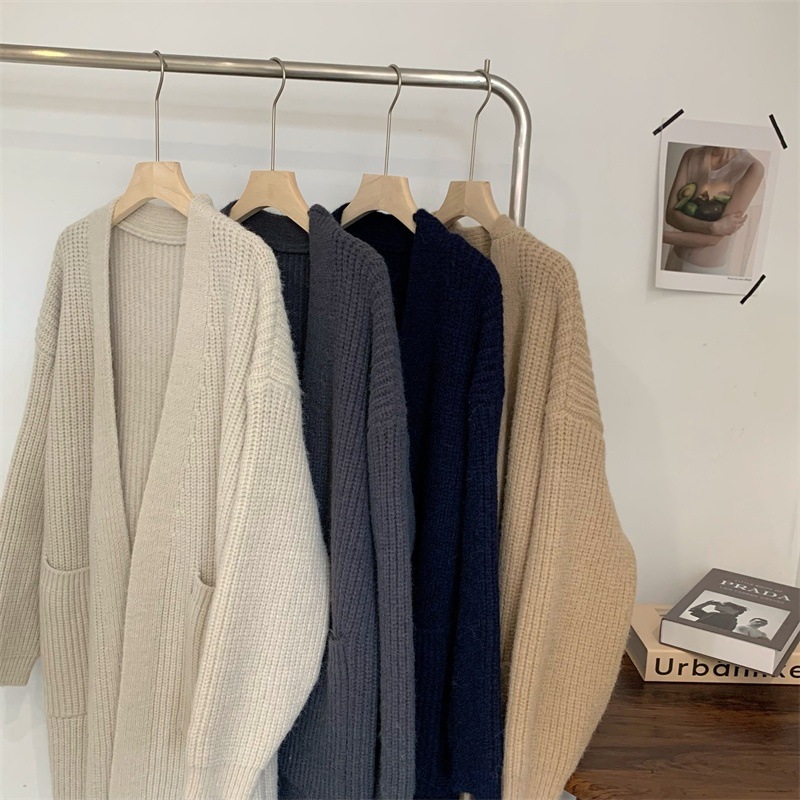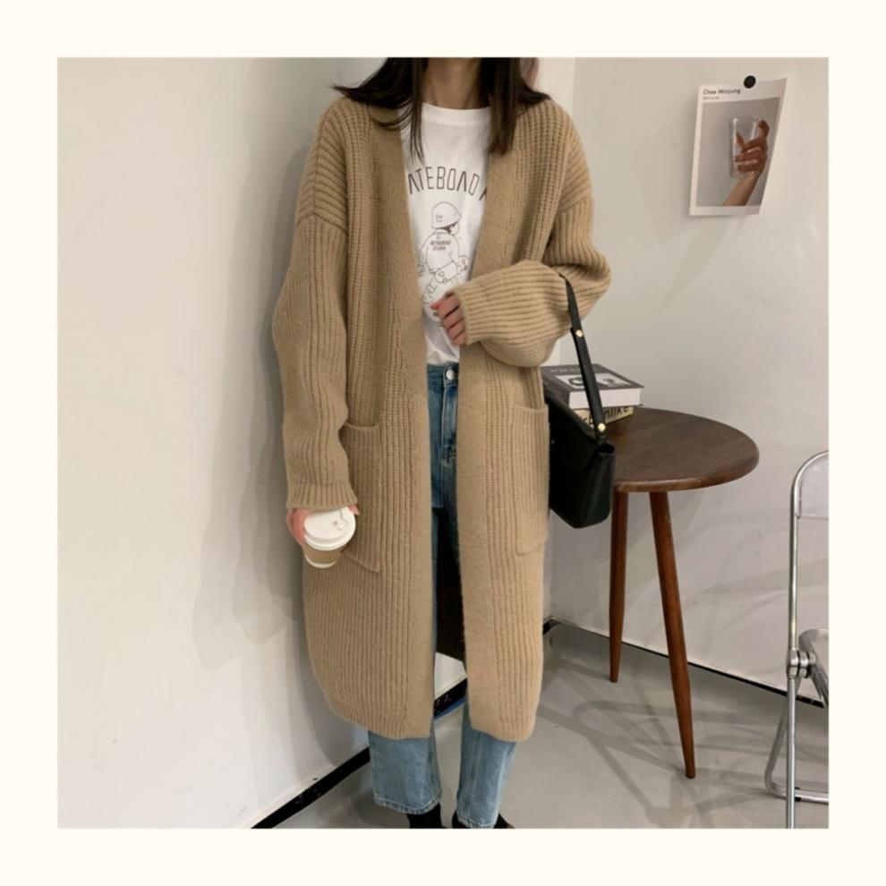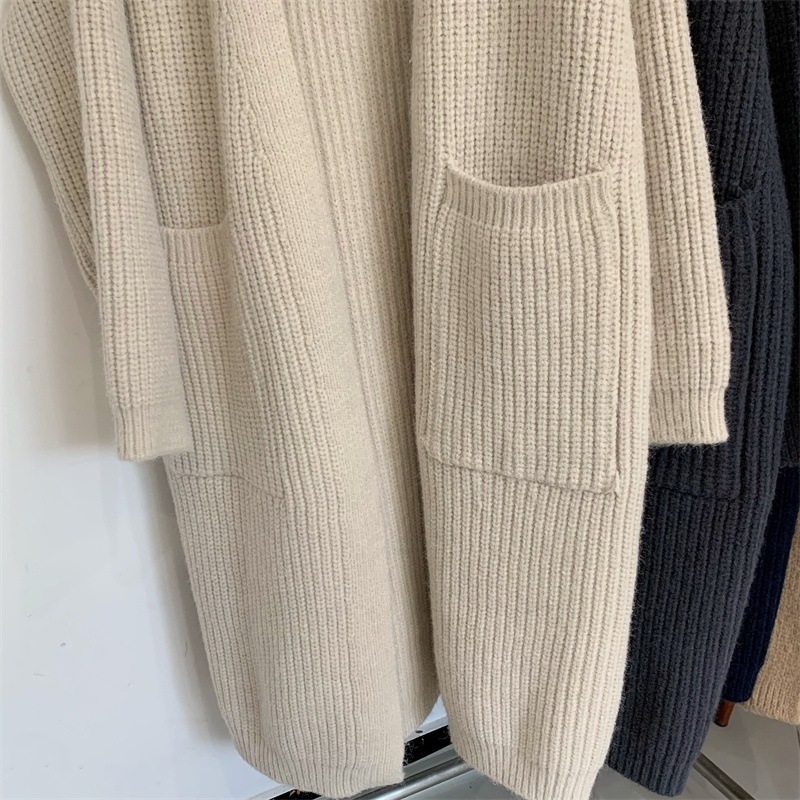 두꺼운 거친 양모 중간 길이 니트 카디건 여자 2024 한국 스타일 게으른 스타일 큰 포켓 느슨한 올 매치 재킷스토어 가기