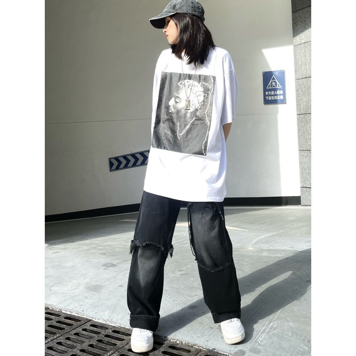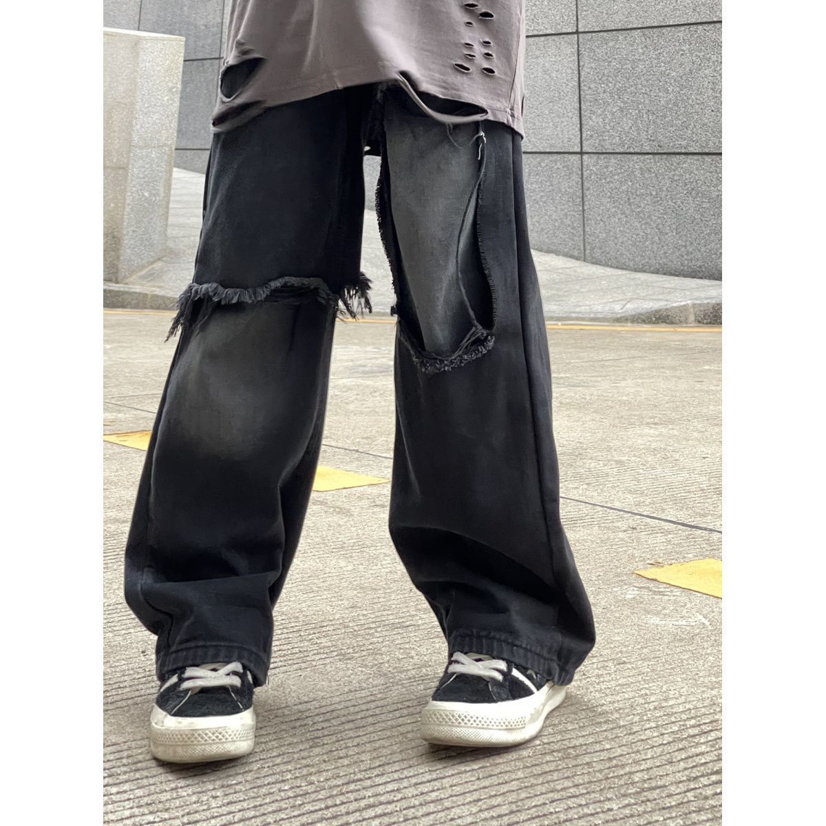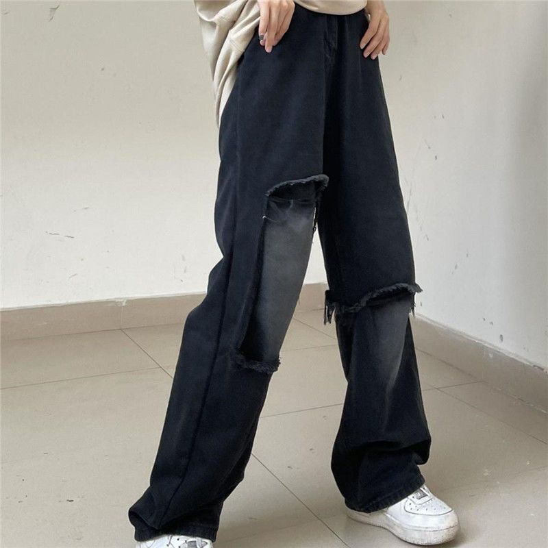 하이 스트리트 블랙 팬츠 여자 Ins 트렌디 새로운 유럽과 미국의 Hiphop 힙합 루즈 스트레이트 바이브 홀 브레이킹 니우 핑 런스토어 가기