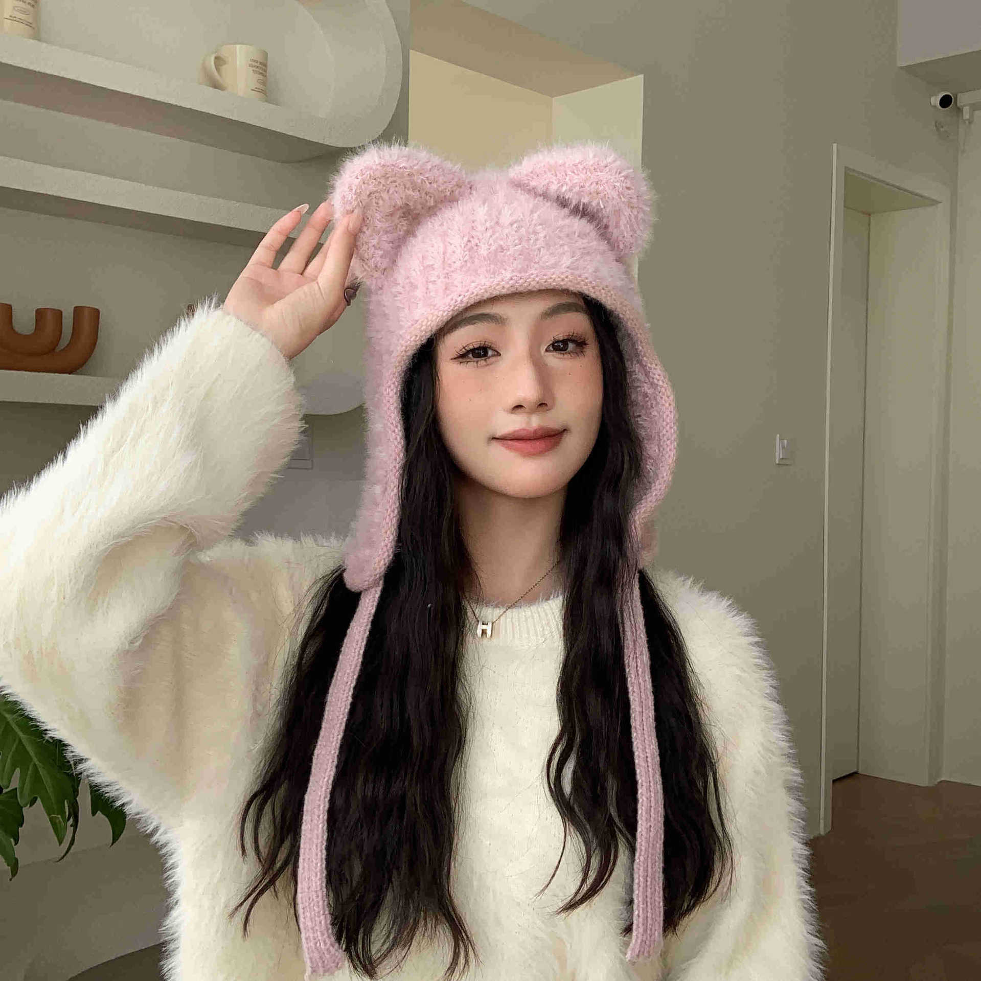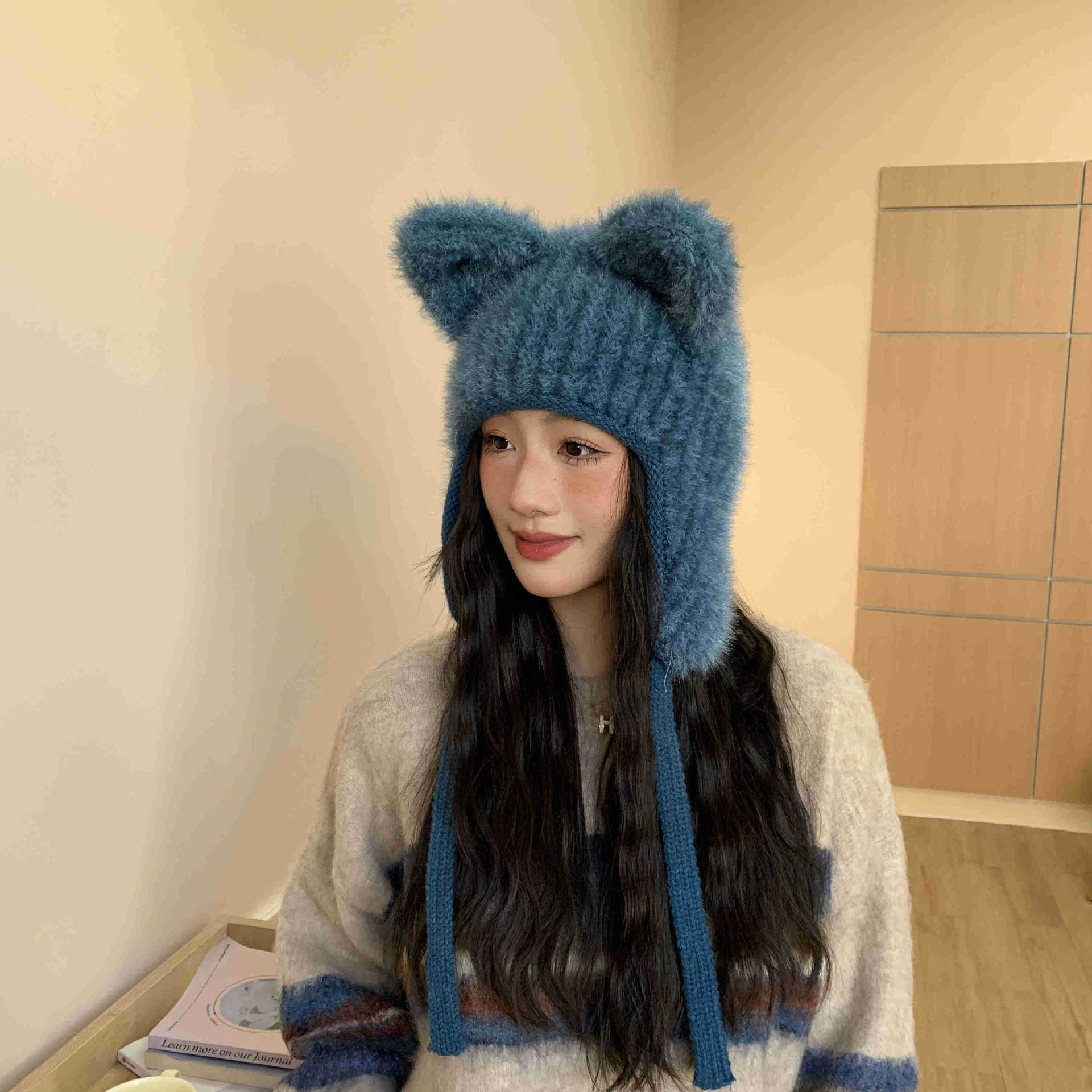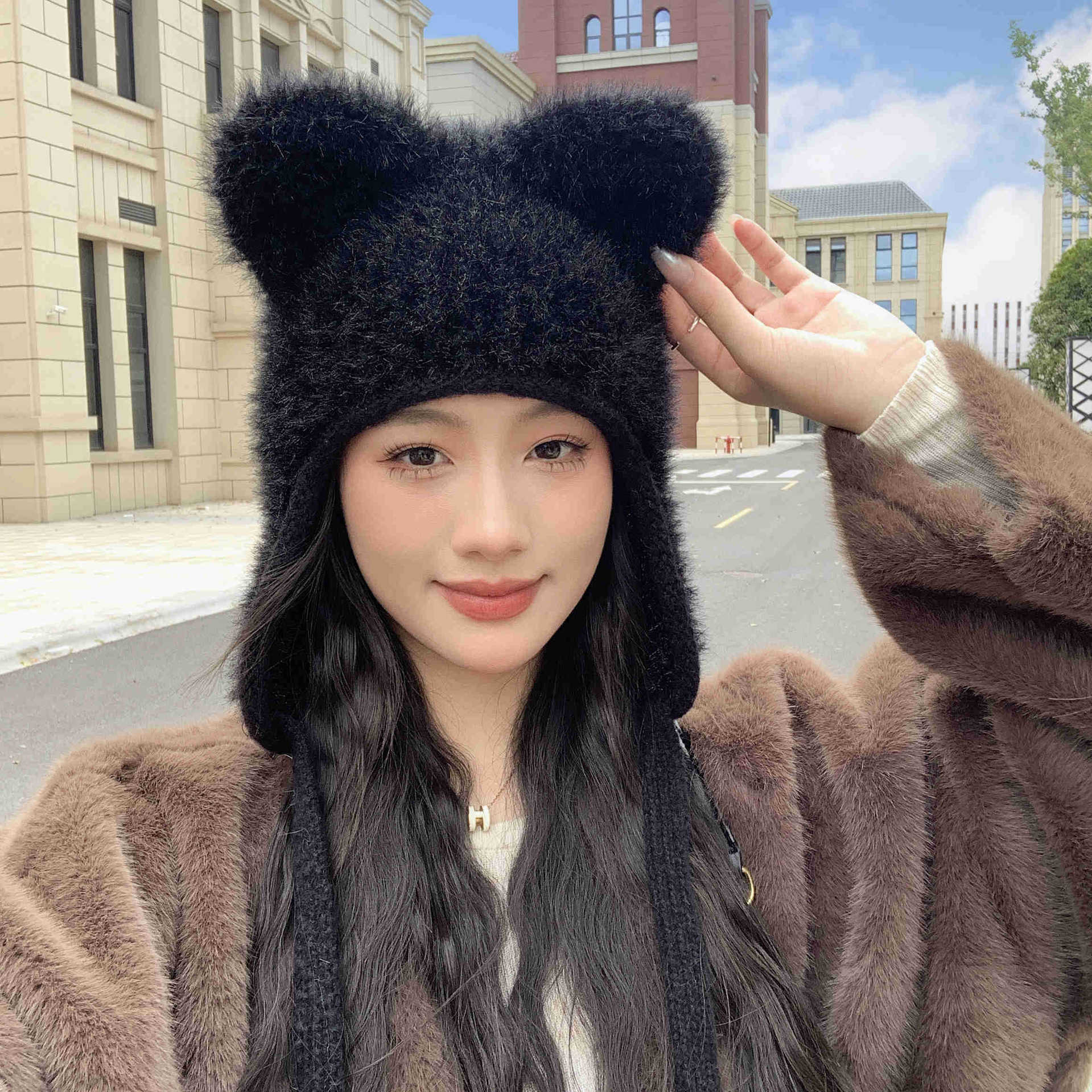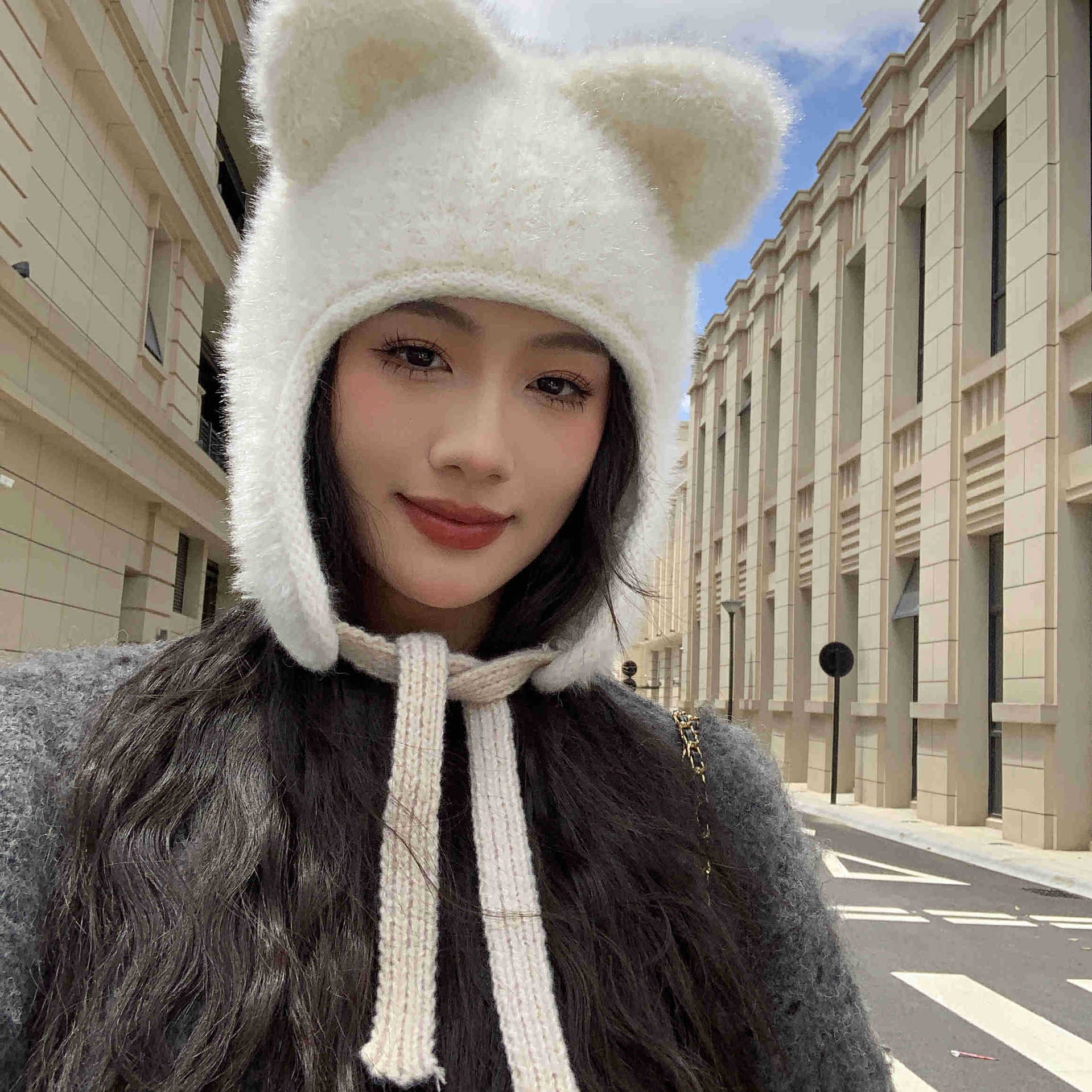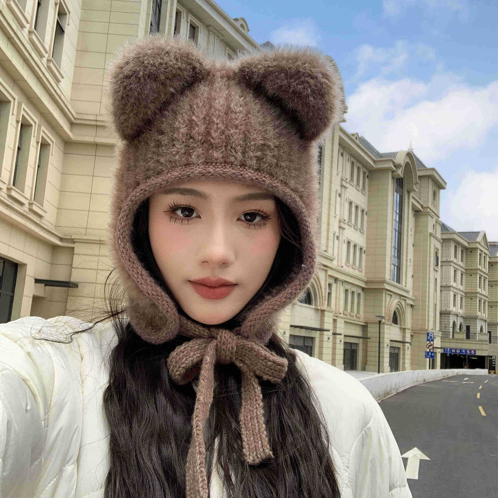 2024 새로운 한국 스타일 가을과 겨울 두꺼운 봉제 곰 귀 귀여운 고양이 니트 모자 유행 귀 보호 방풍스토어 가기