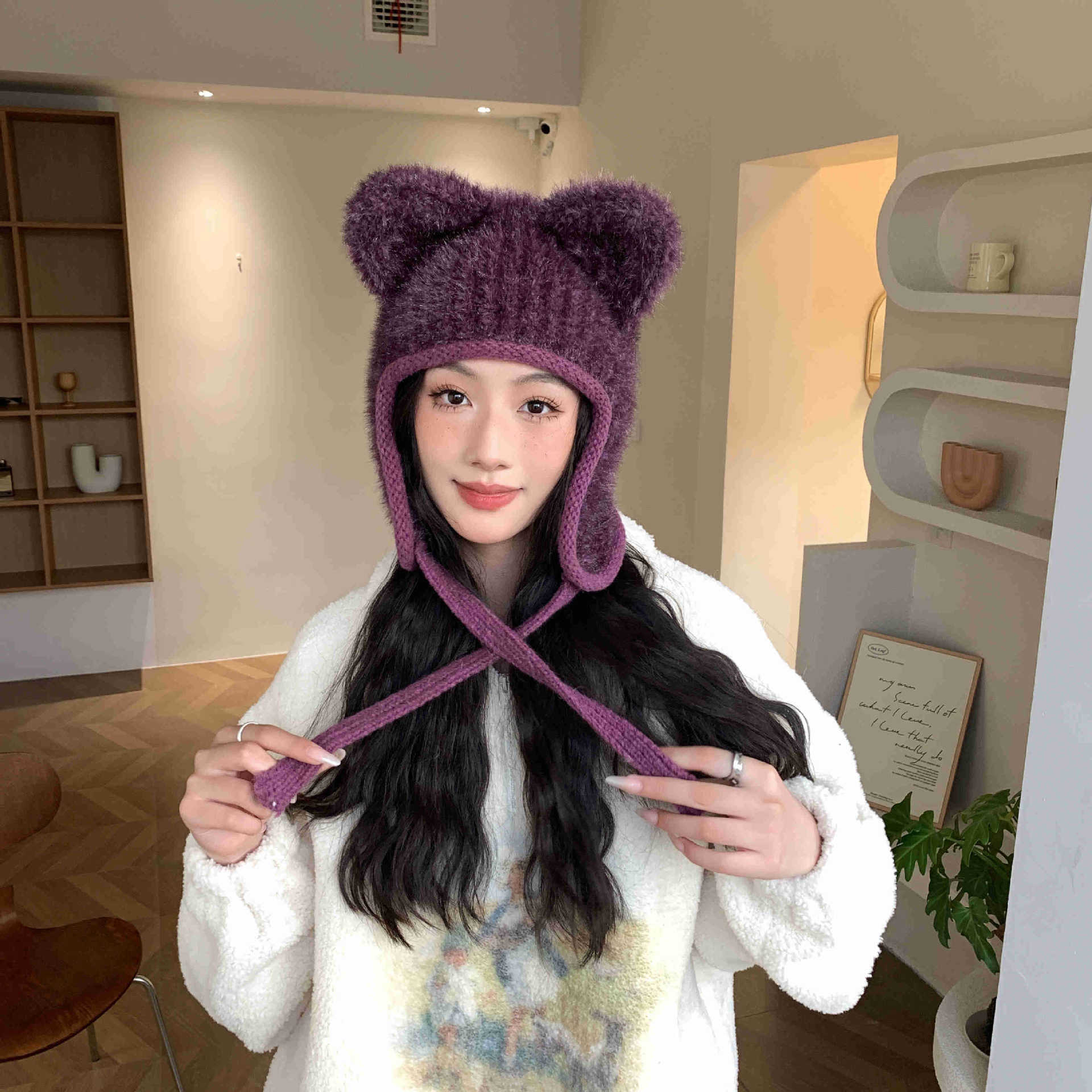 2024 새로운 한국 스타일 가을과 겨울 두꺼운 봉제 곰 귀 귀여운 고양이 니트 모자 유행 귀 보호 방풍