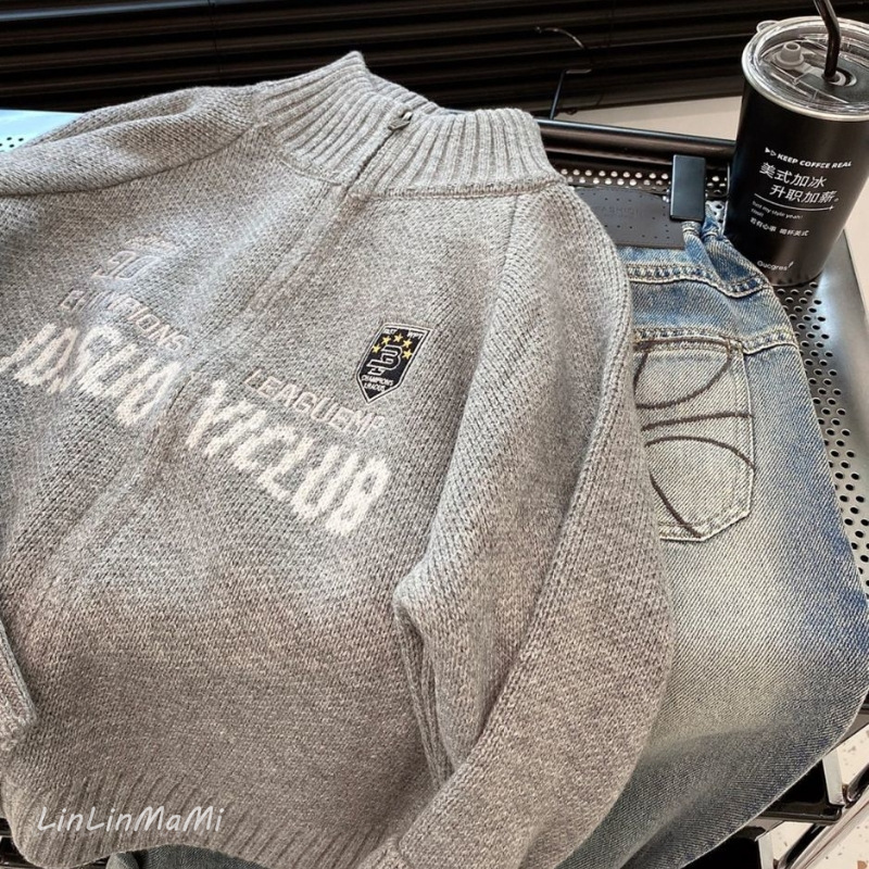재고 있음, 즉시 배송! 소년 스웨터 스탠드 칼라 2024 가을 겨울 새로운 스타일 중대형 아동 니트 지퍼 가디건 한국 자수스토어 가기