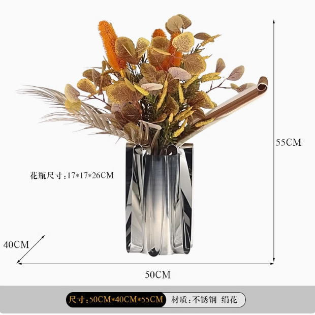 현대 빛 럭셔리 스테인레스 스틸 하이 엔드 금속 꽃병 거실 테이블 시뮬레이션 꽃 예술 판매 사무실 부드러운 장식 장식품스토어 가기