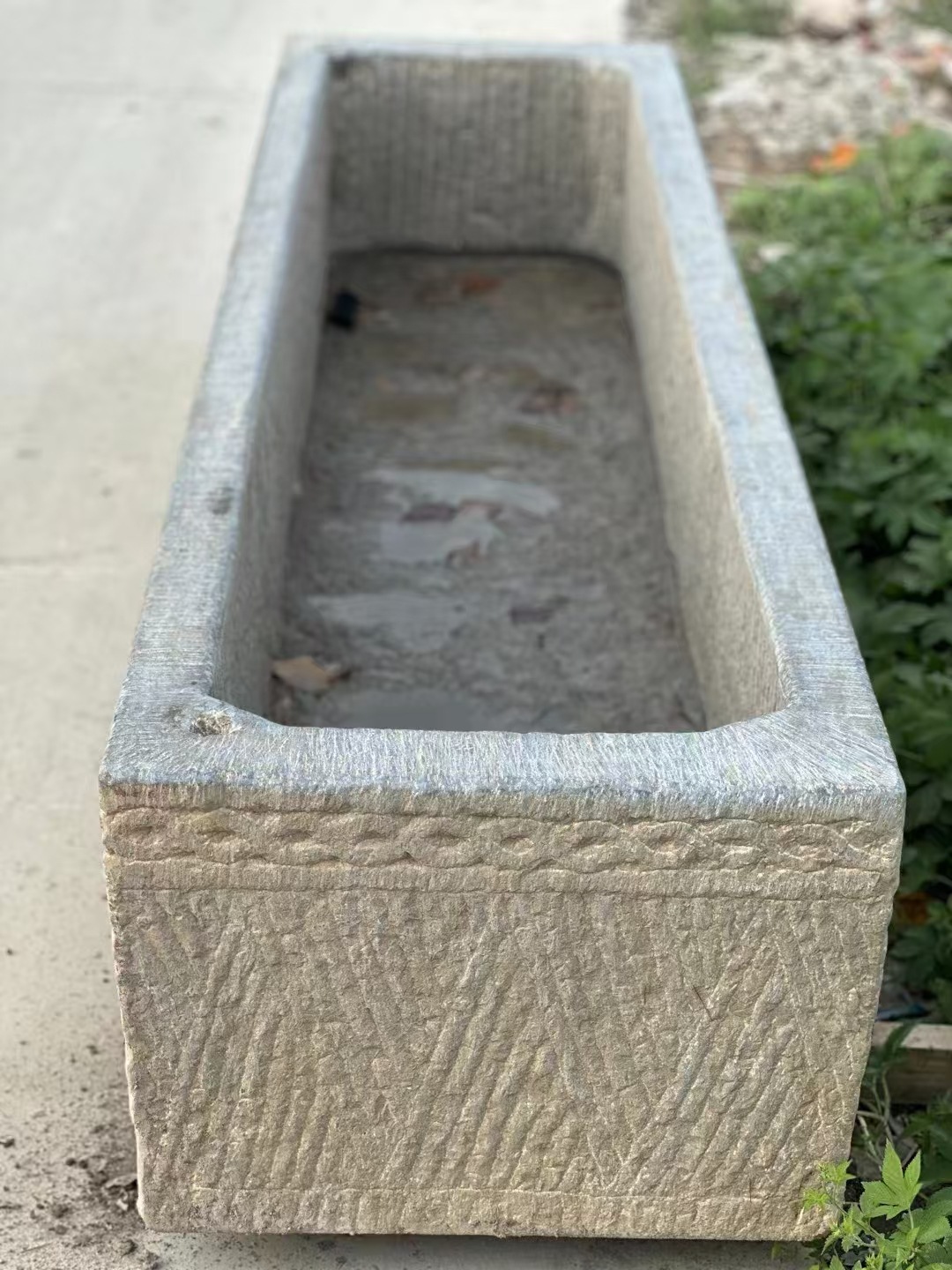 자연 오래 된 돌 트로프 야외 물고기 탱크 오래 된 돼지 트로프 돌 공장 정원 풍경 소 쟁기 물고기 연못 돌 쟁기