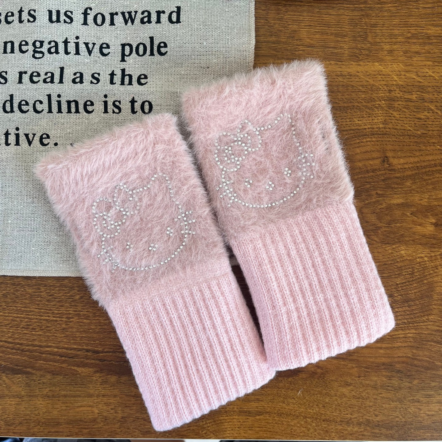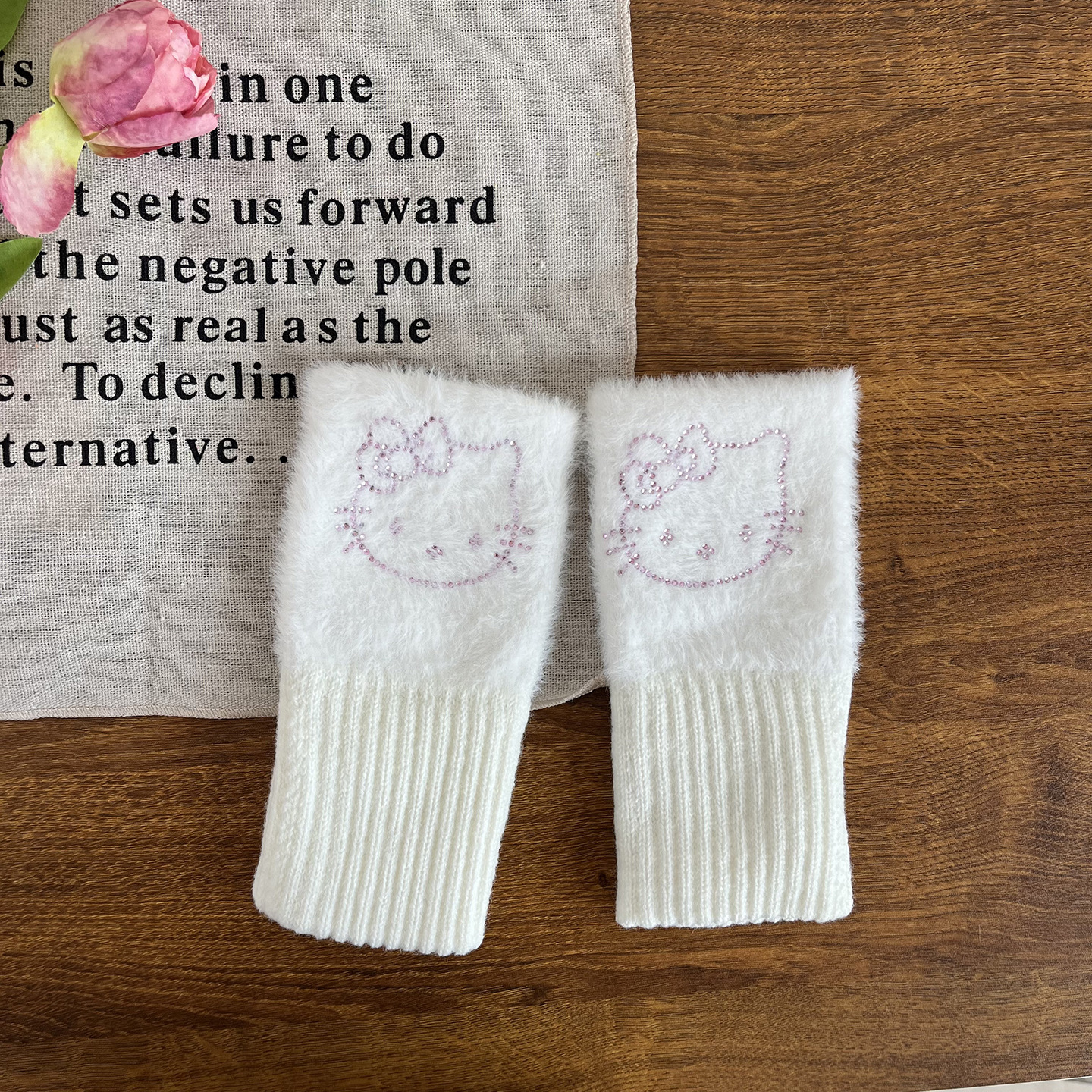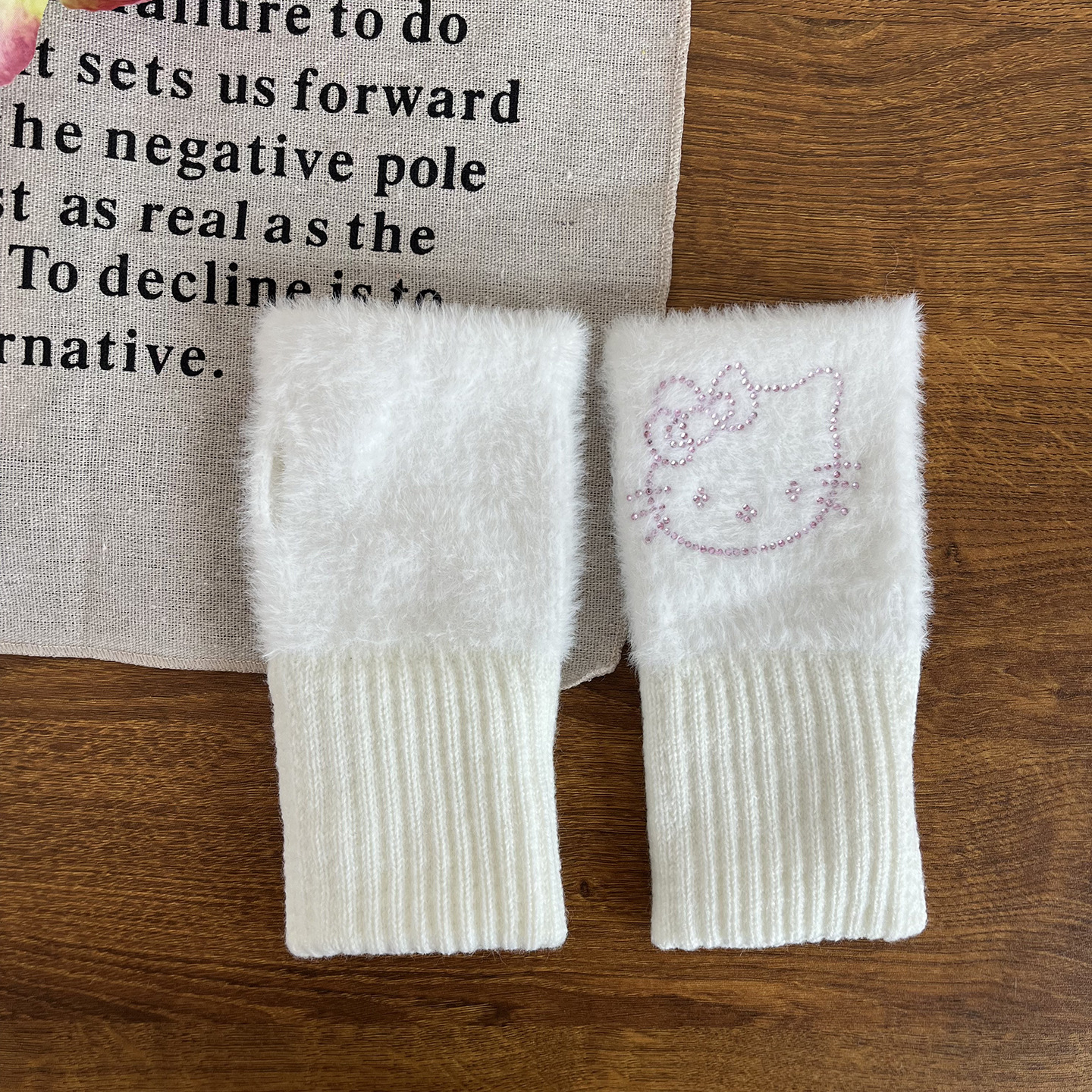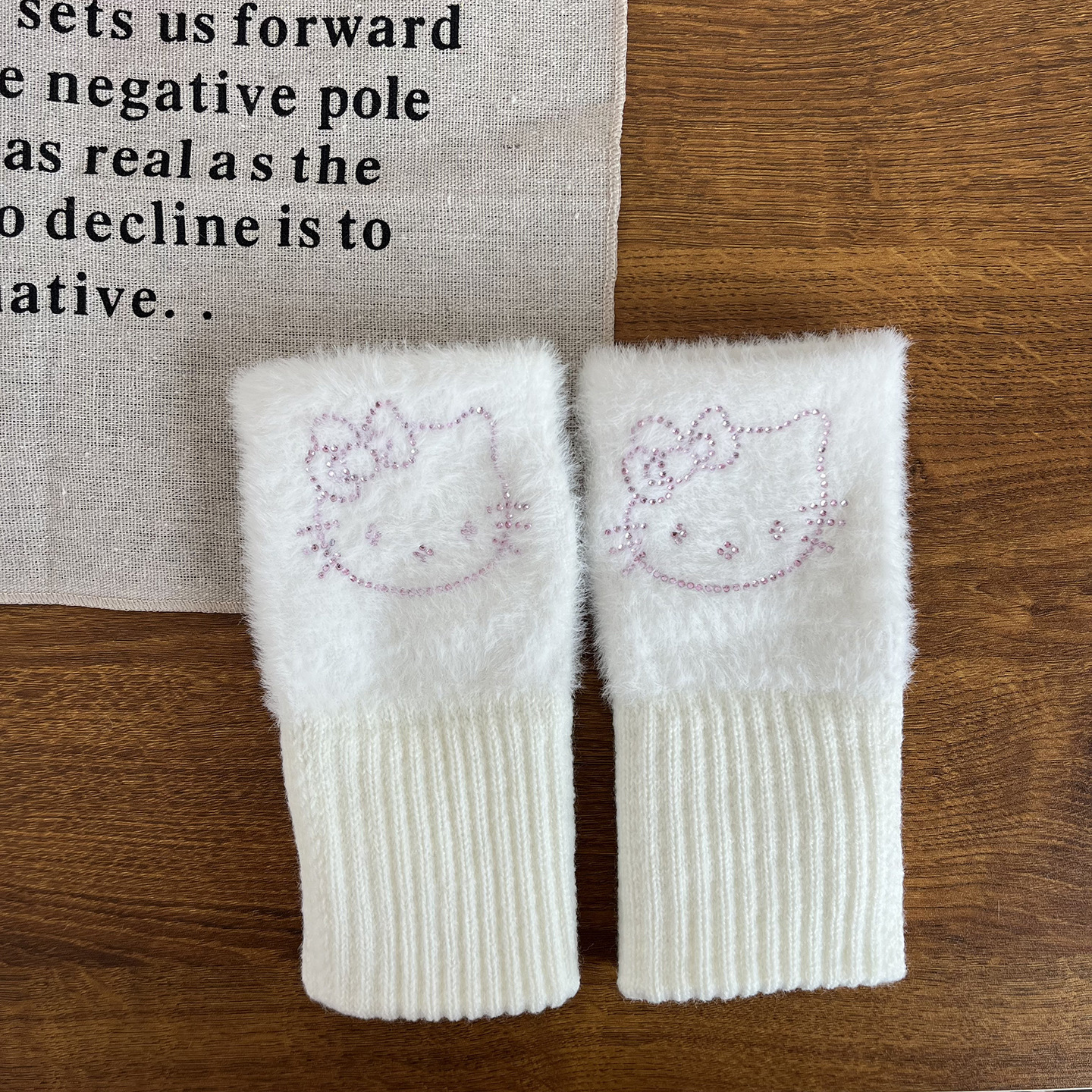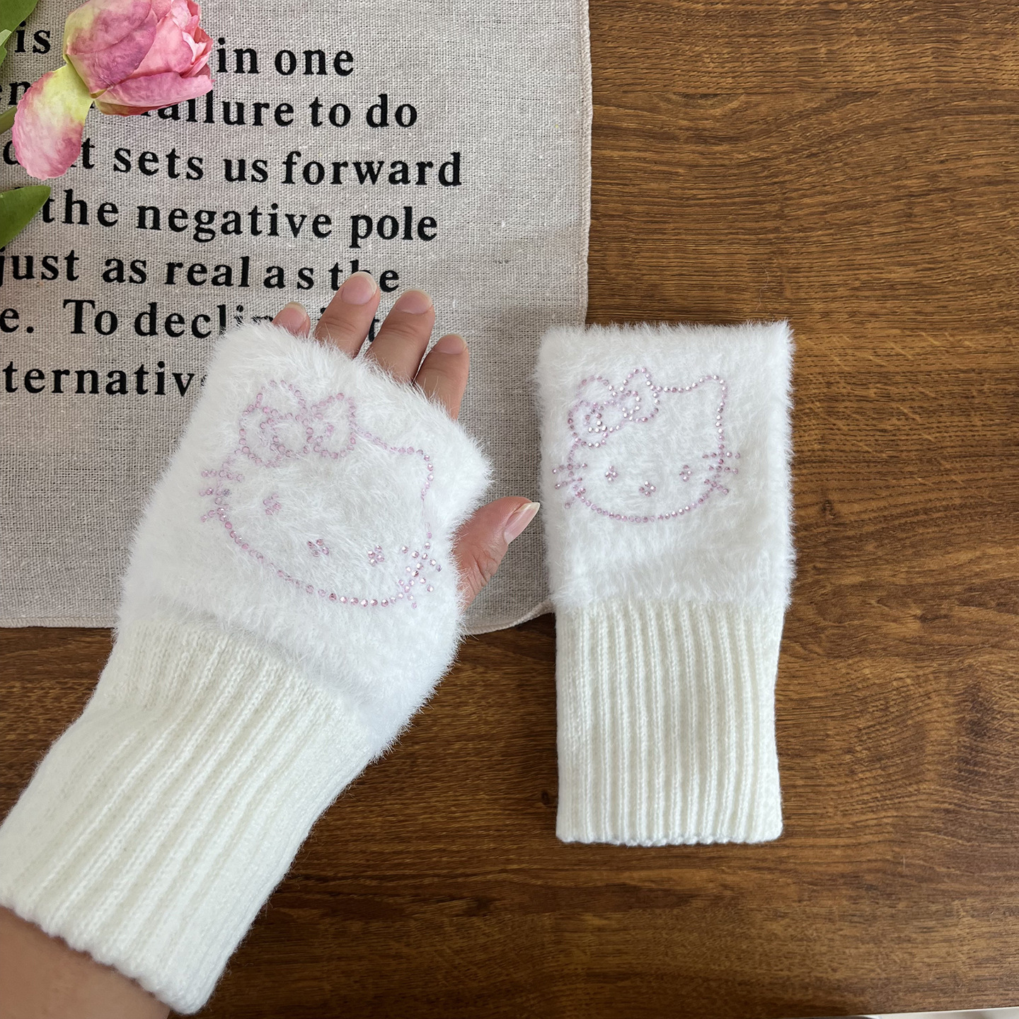 귀여운 만화 고양이 니트 반 손가락 장갑 여성의 겨울 봉제 두꺼운 따뜻한 손목 보호 학생 글쓰기 장갑