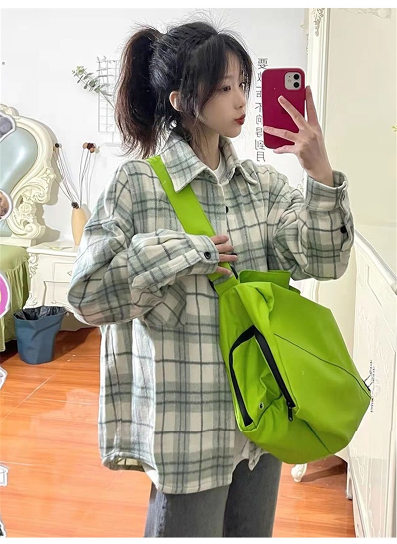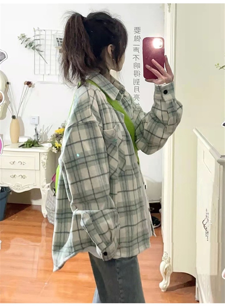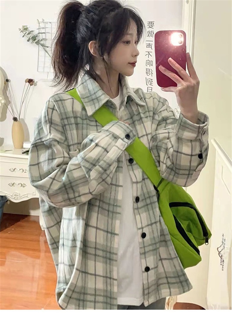 녹색 격자 무늬 셔츠 여성의 봄과 가을 새로운 느슨한 겉옷 디자인 센스 틈새 셔츠 폴로 칼라 재킷