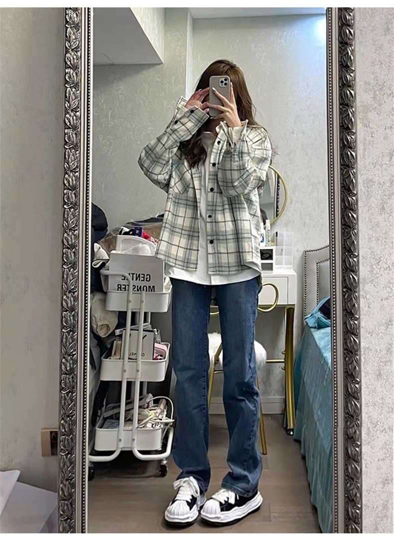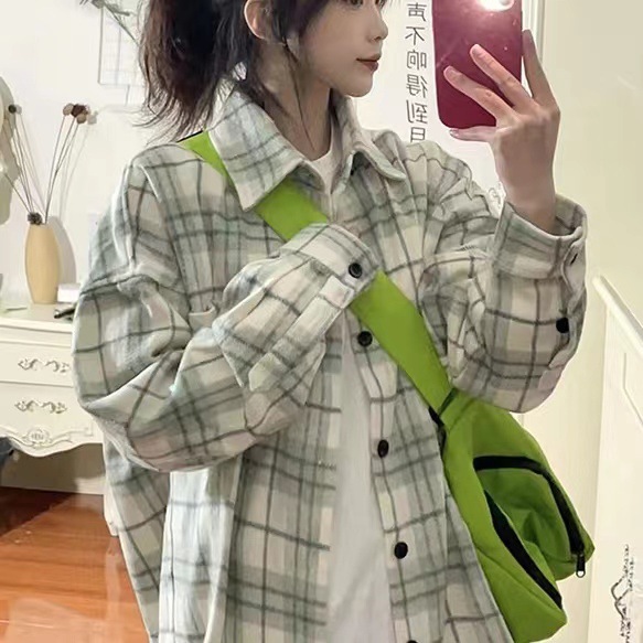 녹색 격자 무늬 셔츠 여성의 봄과 가을 새로운 느슨한 겉옷 디자인 센스 틈새 셔츠 폴로 칼라 재킷스토어 가기