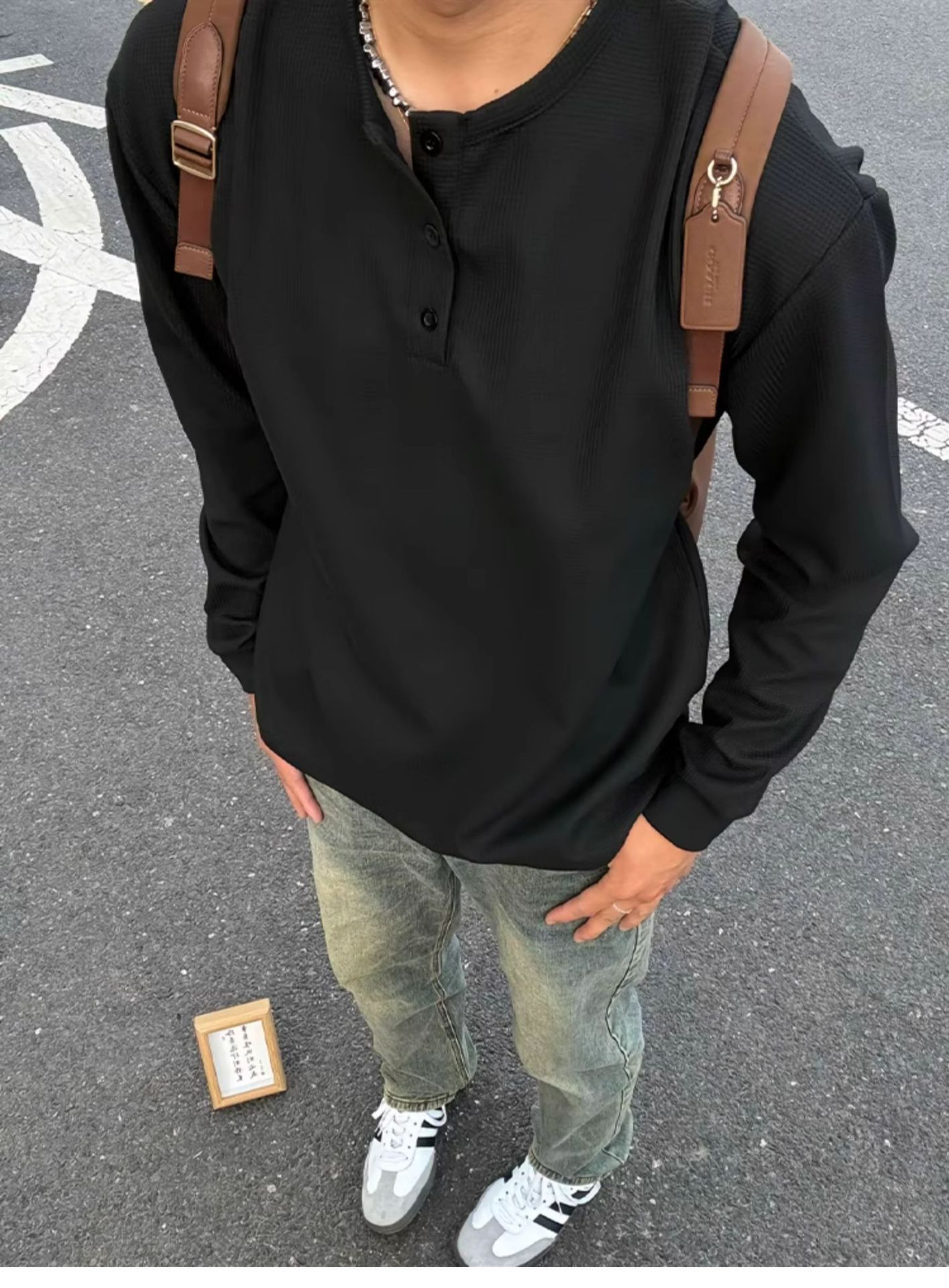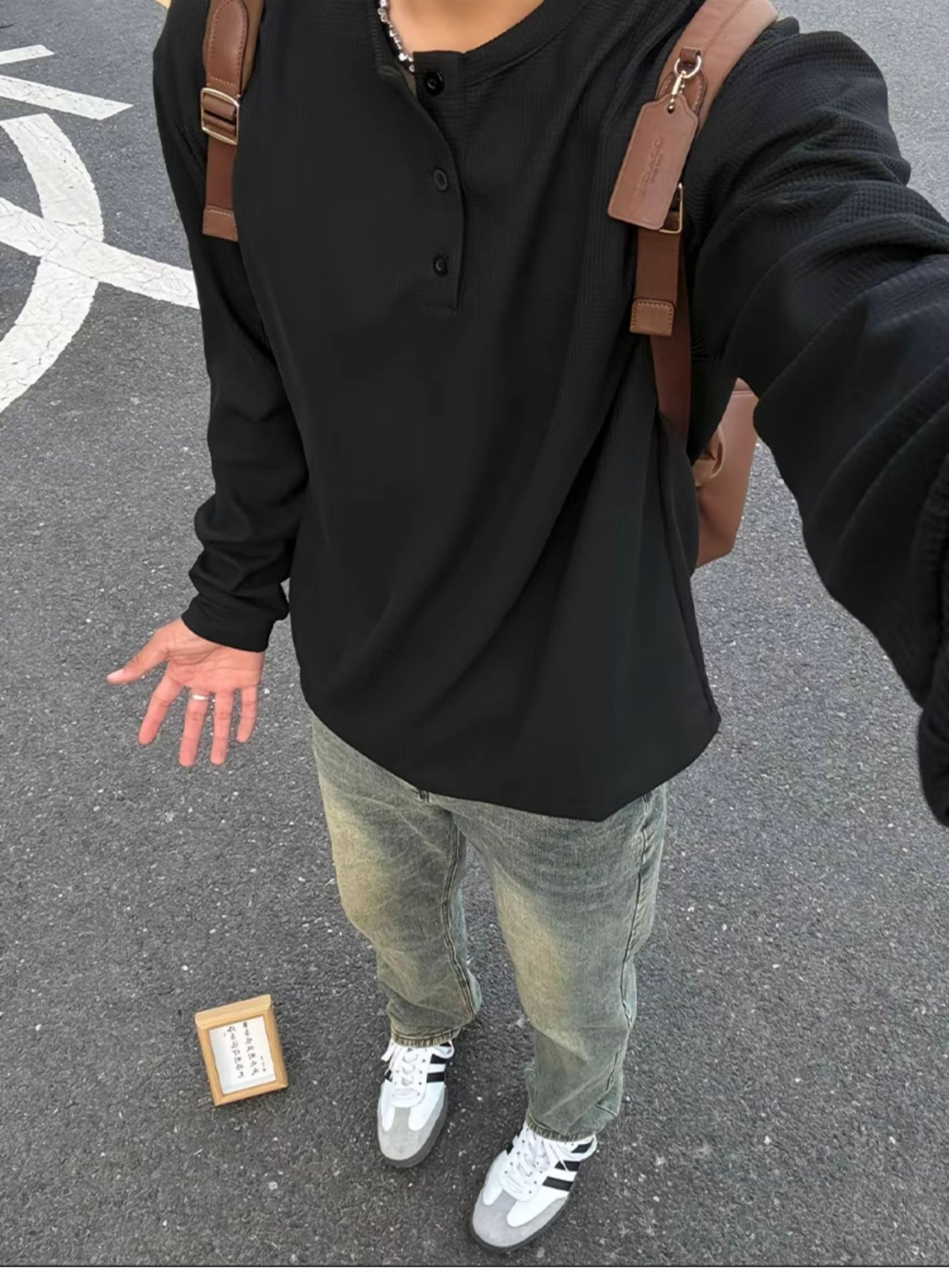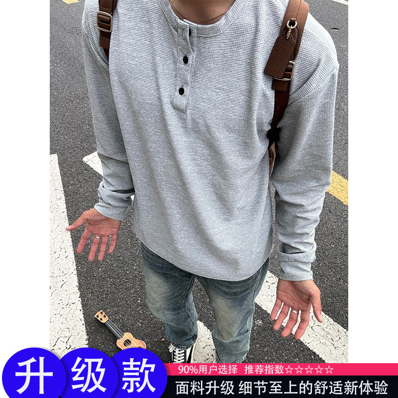 블랙 아메리칸 스타일 헨리 칼라 긴팔 티셔츠 남성 봄과 가을 와플 스웨터 패션 브랜드 센스 내베이스 셔츠스토어 가기