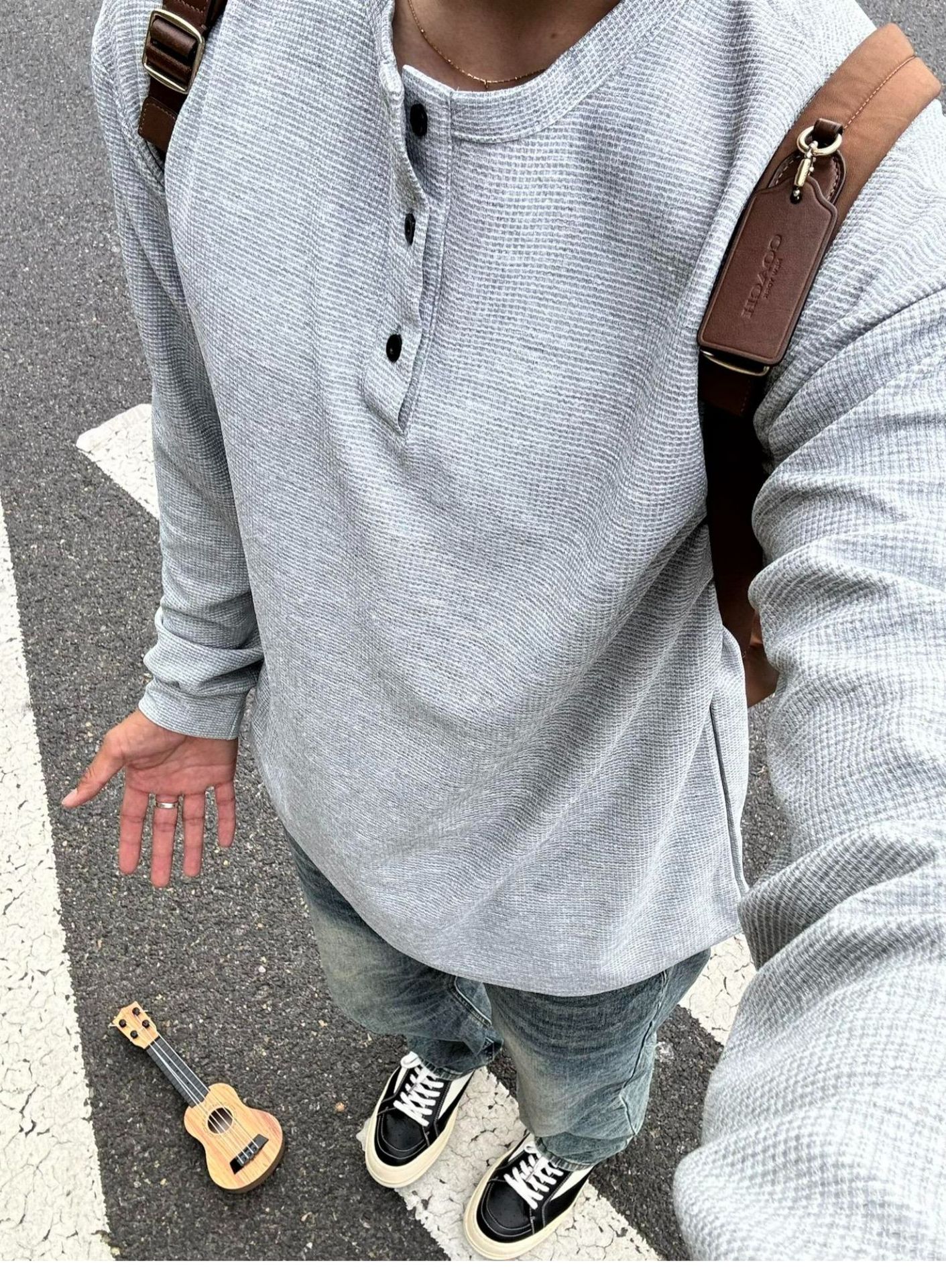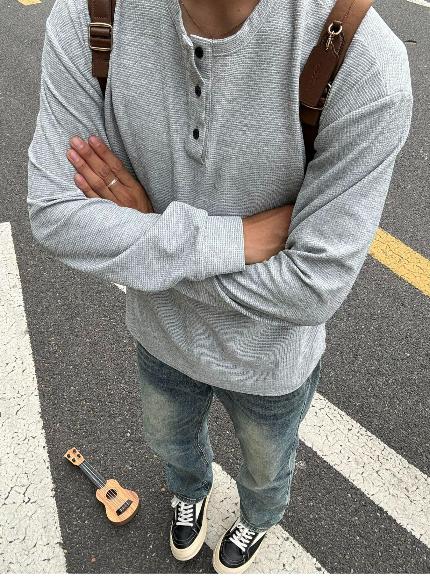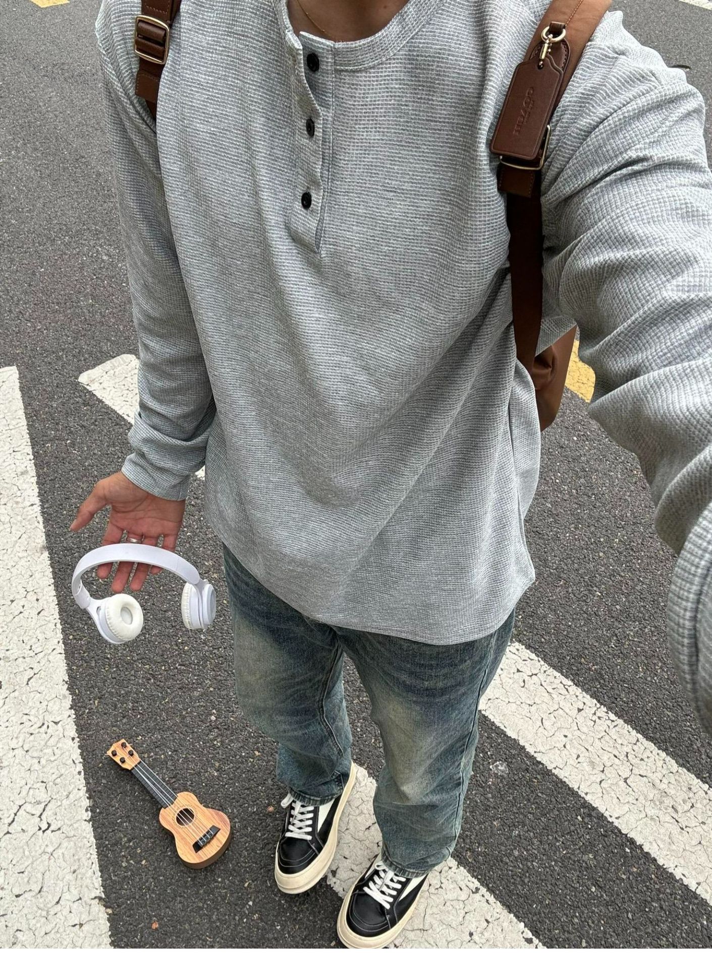 블랙 아메리칸 스타일 헨리 칼라 긴팔 티셔츠 남성 봄과 가을 와플 스웨터 패션 브랜드 센스 내베이스 셔츠스토어 가기