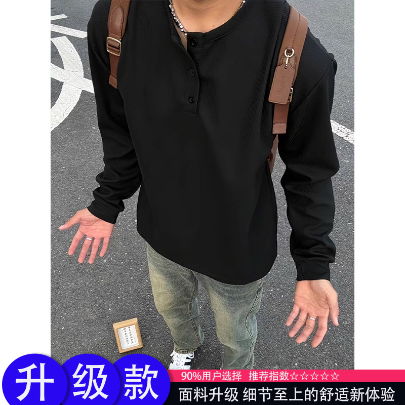 블랙 아메리칸 스타일 헨리 칼라 긴팔 티셔츠 남성 봄과 가을 와플 스웨터 패션 브랜드 센스 내베이스 셔츠
