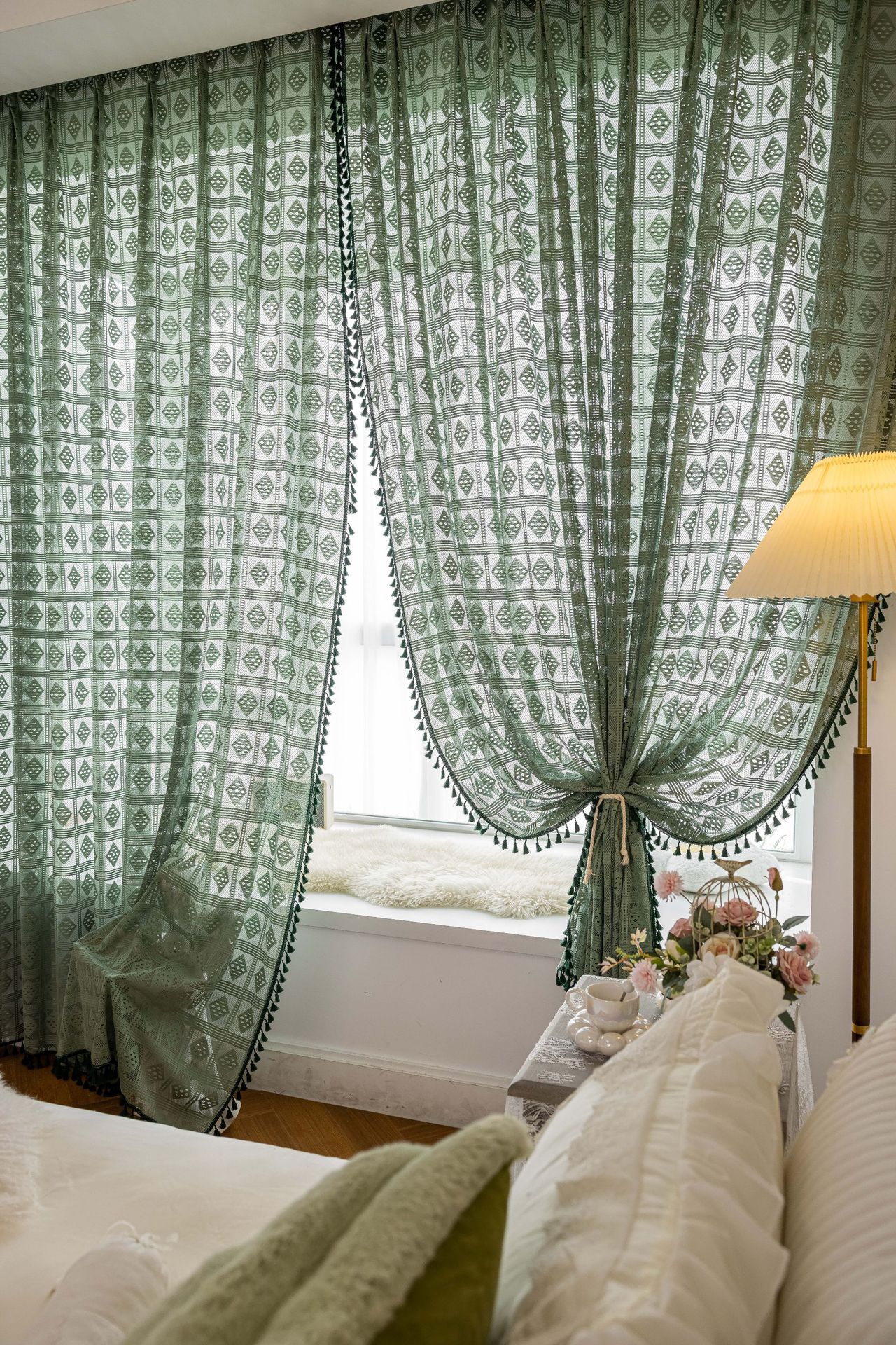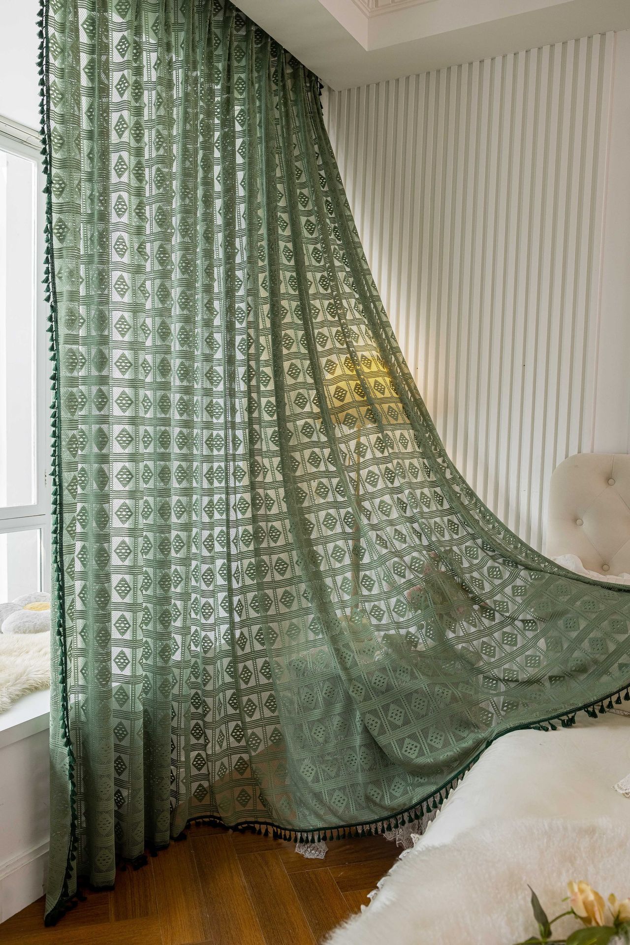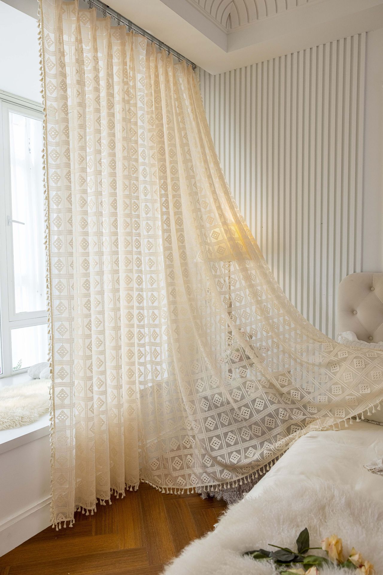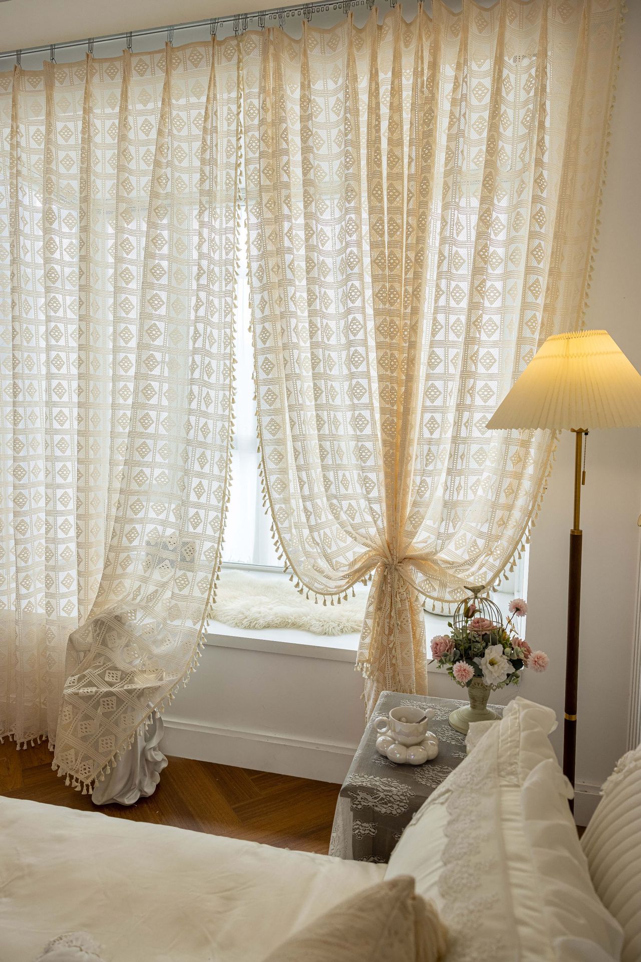 Tangmei 대외 무역 투명한 커튼 창 화면 도매 북유럽 인 베이지 빈 다이아몬드 격자 거실 침실 커튼