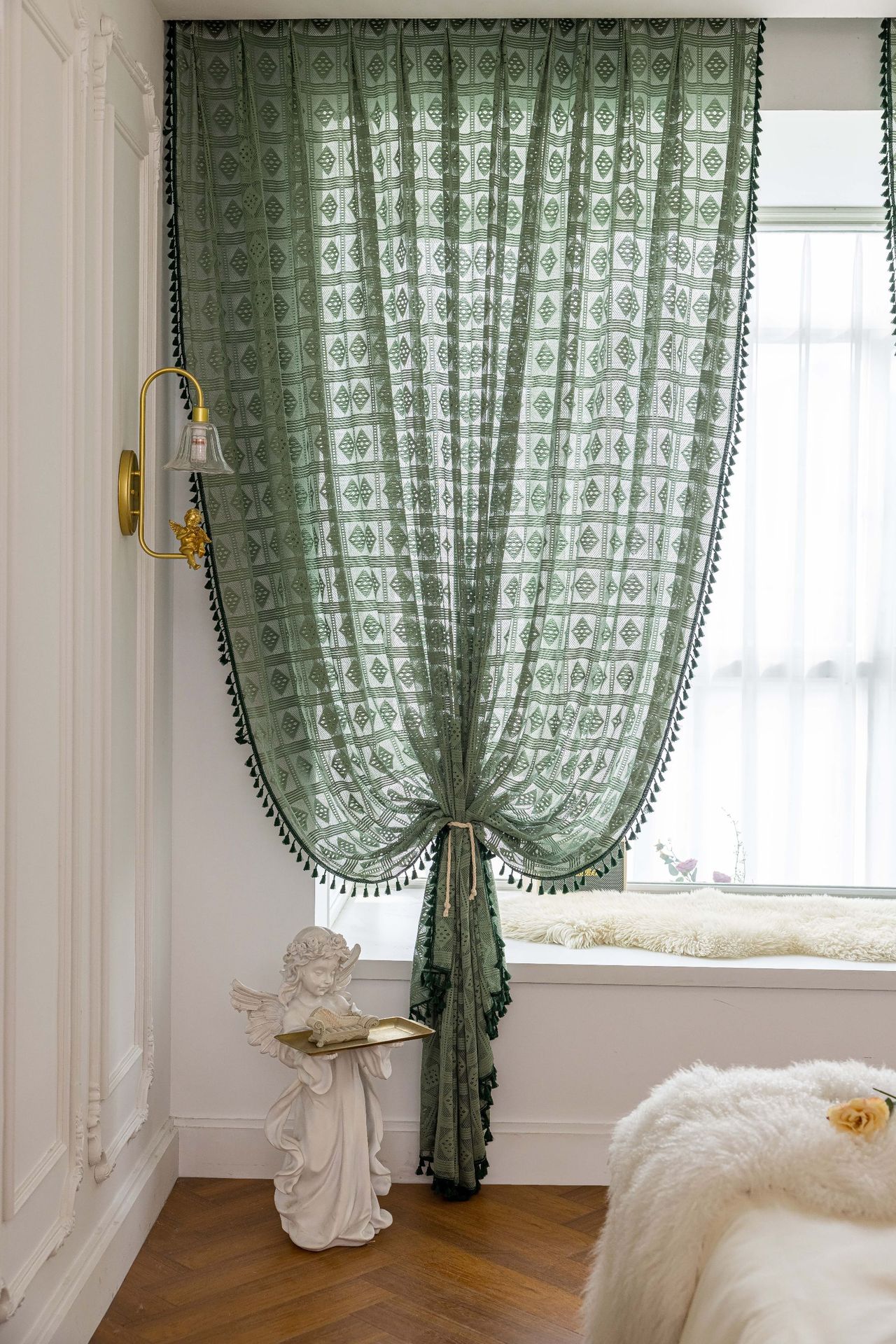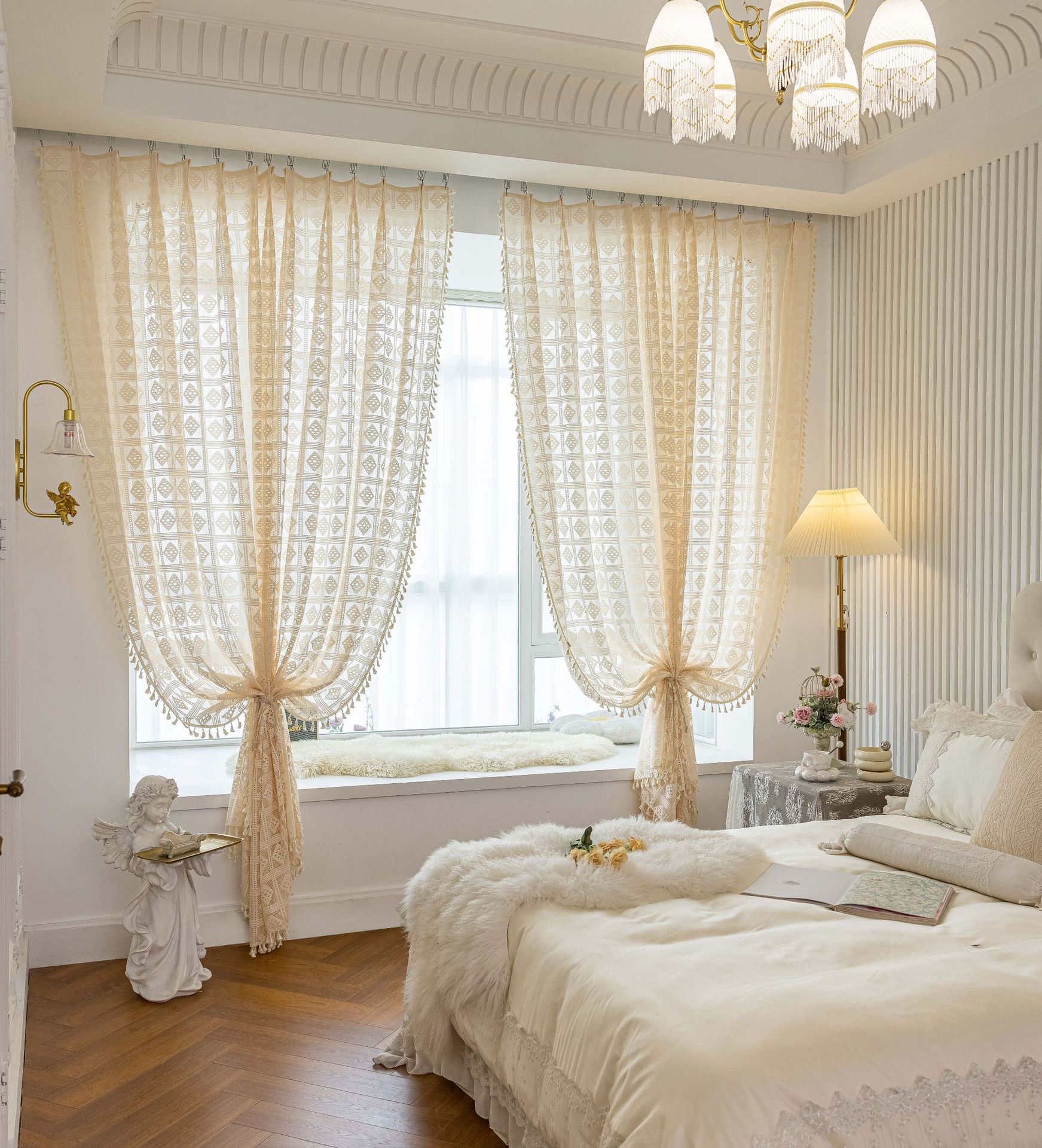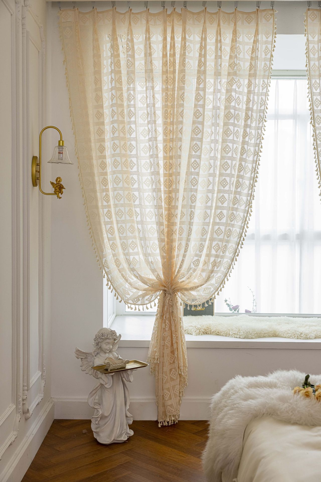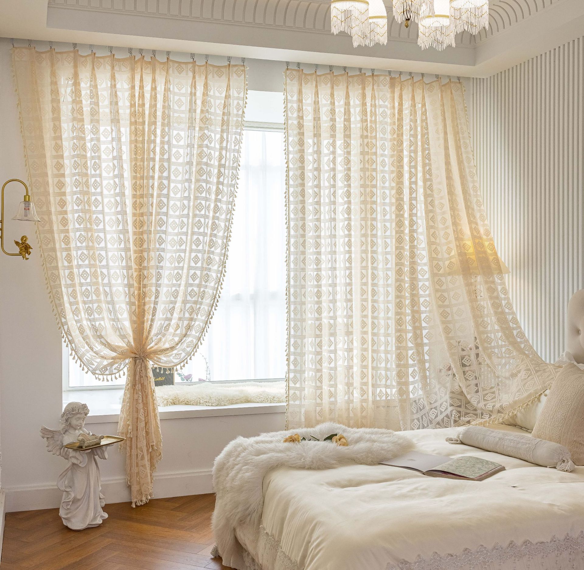 Tangmei 대외 무역 투명한 커튼 창 화면 도매 북유럽 인 베이지 빈 다이아몬드 격자 거실 침실 커튼