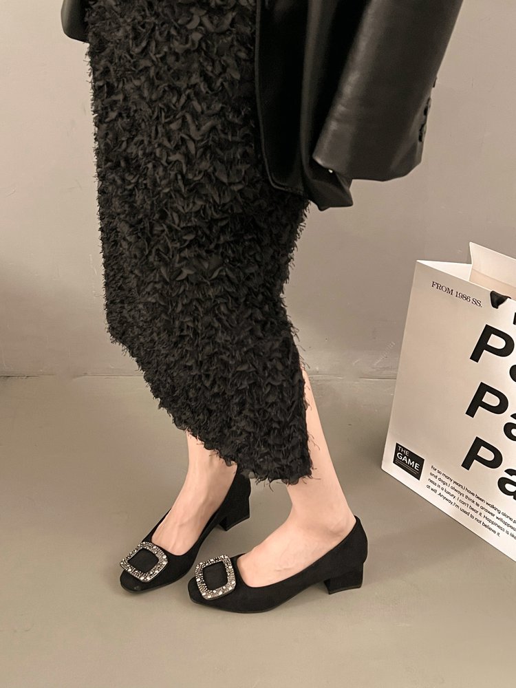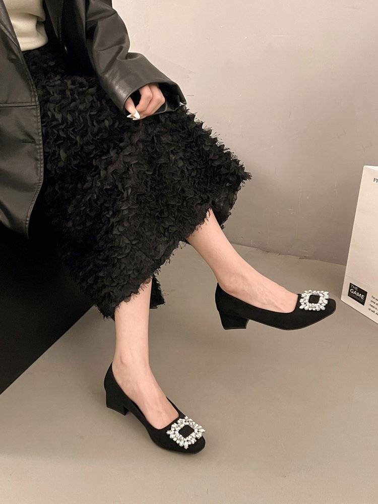 하이힐 스퀘어 헤드 라인 스톤 하이 레벨 신발 여성 신발 2024 새로운 가을과 겨울 검은 기질 두꺼운 굽 통근 신발