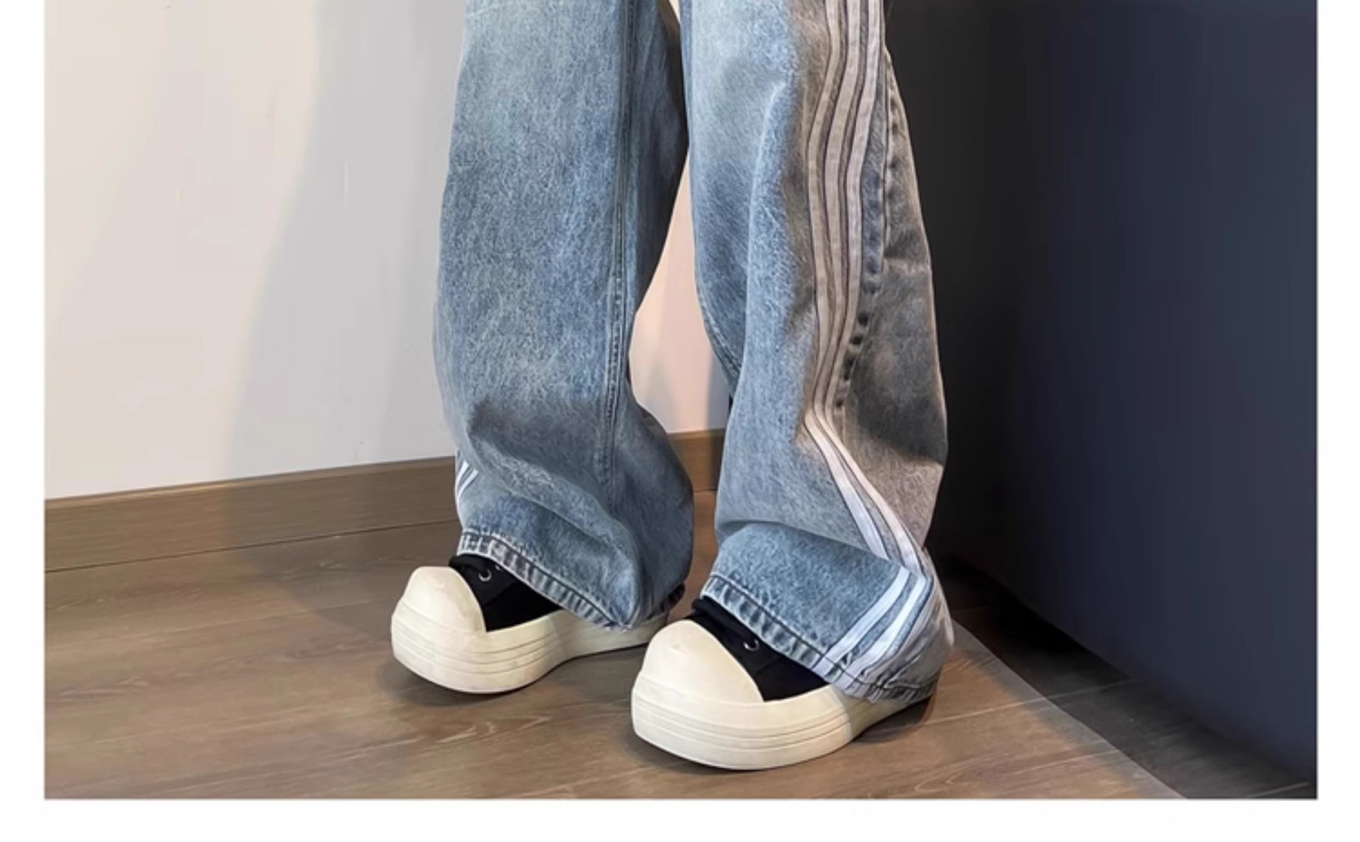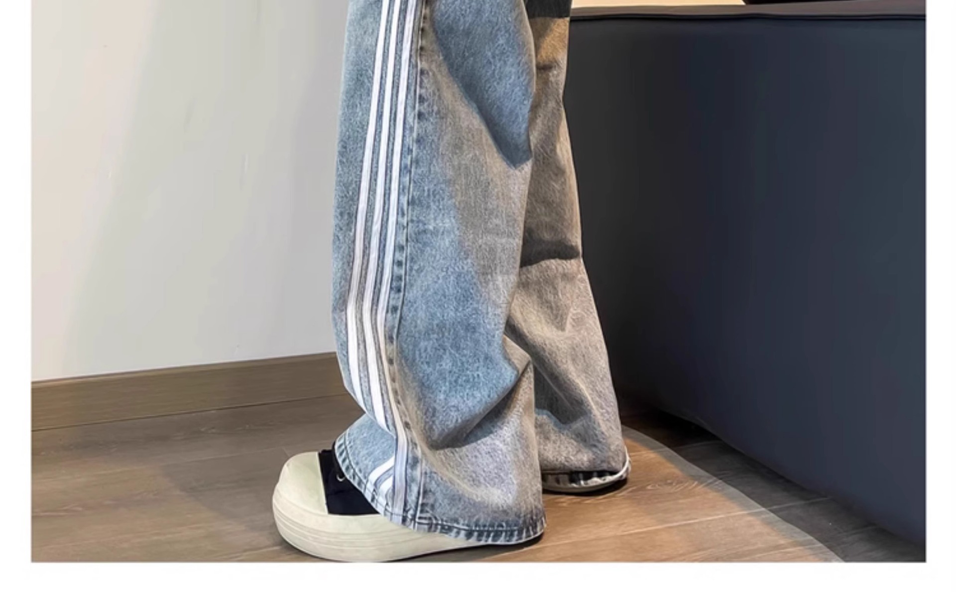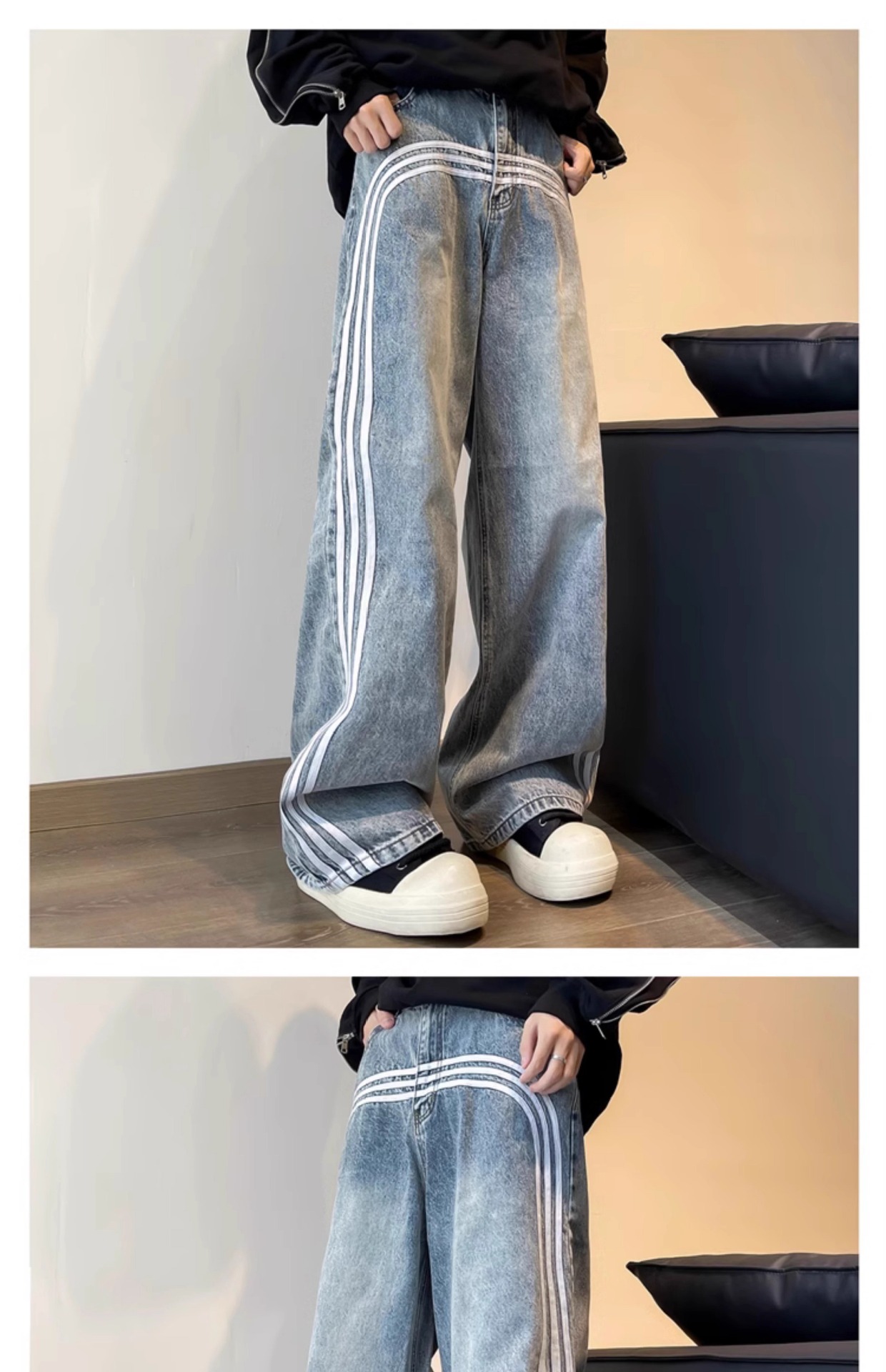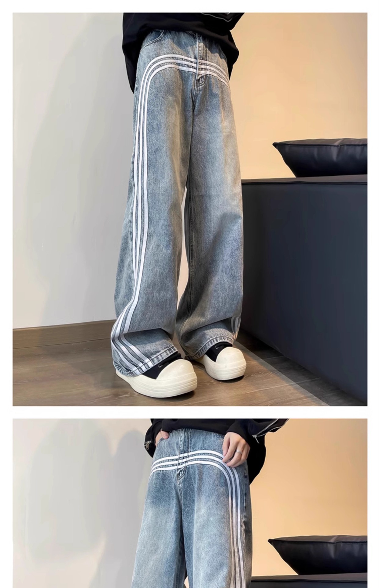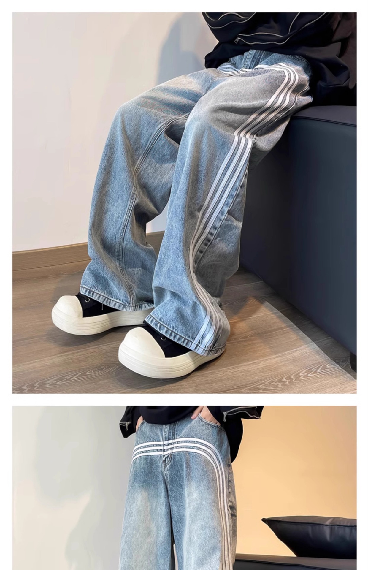 3 개의 바 스티칭 와이드 레그 청바지 남성용 아메리칸 스타일 바이브 하이 스트리트 레트로 틈새 세탁 캐주얼 롱 팬츠스토어 가기