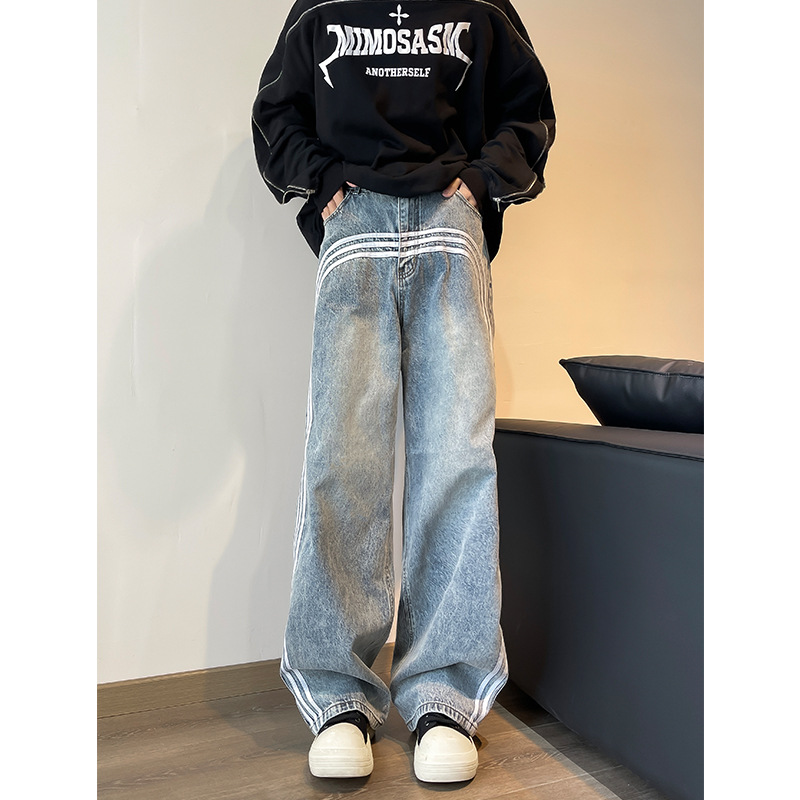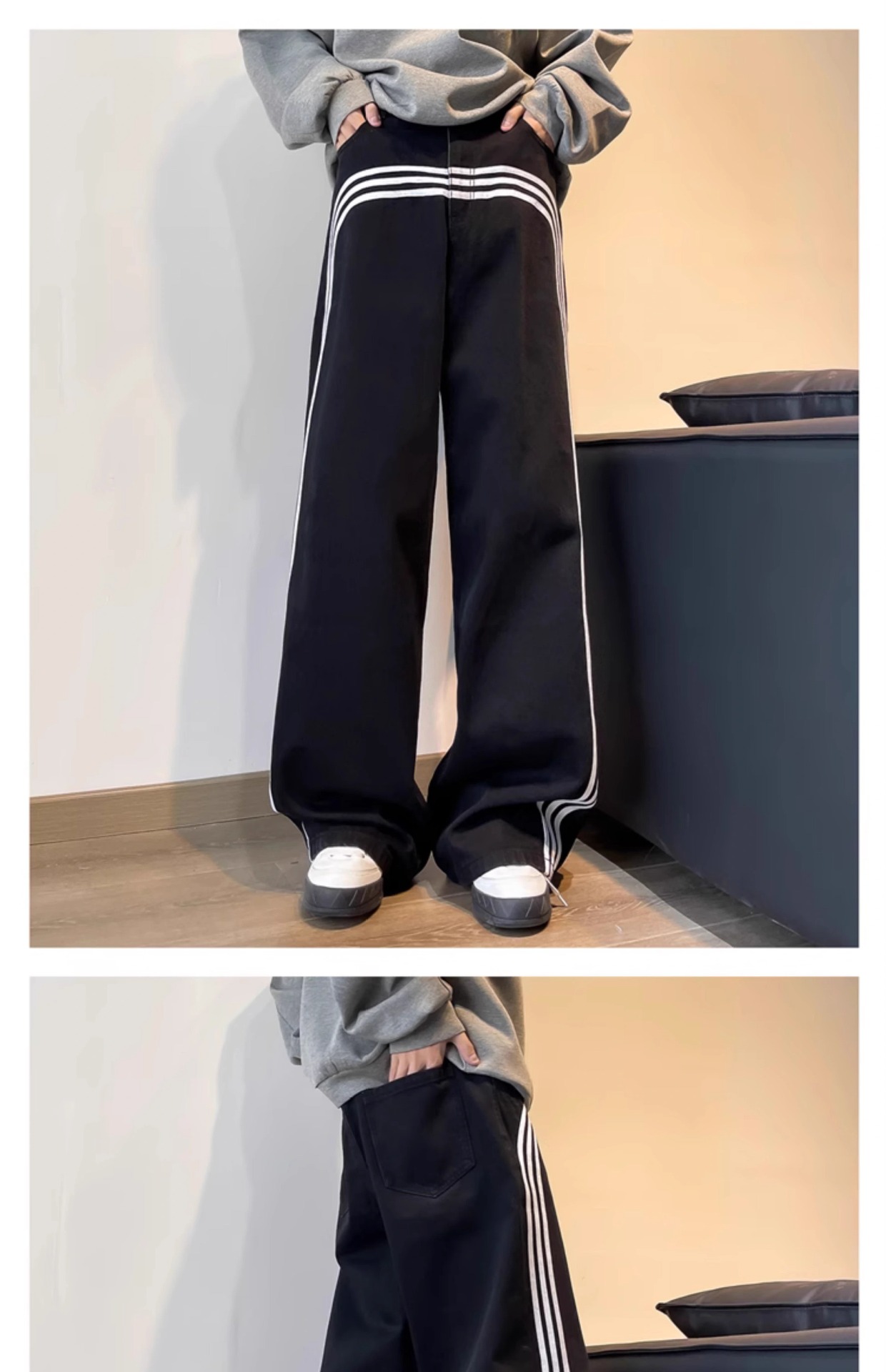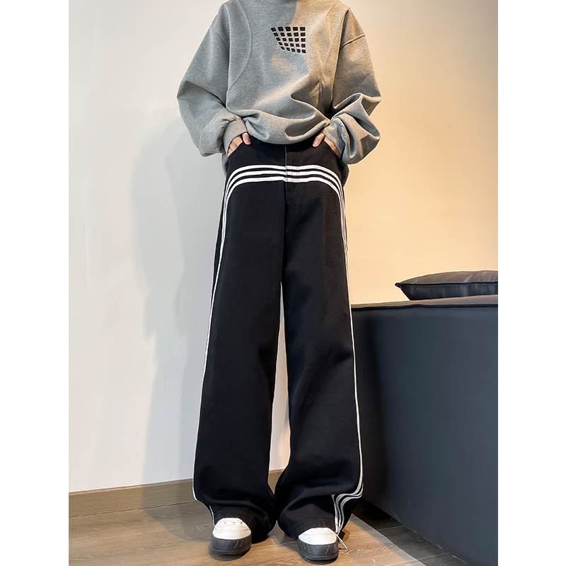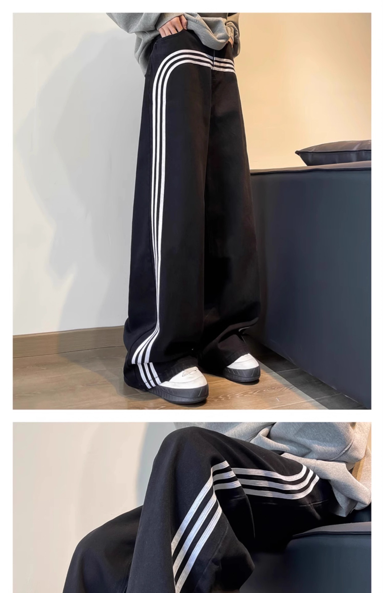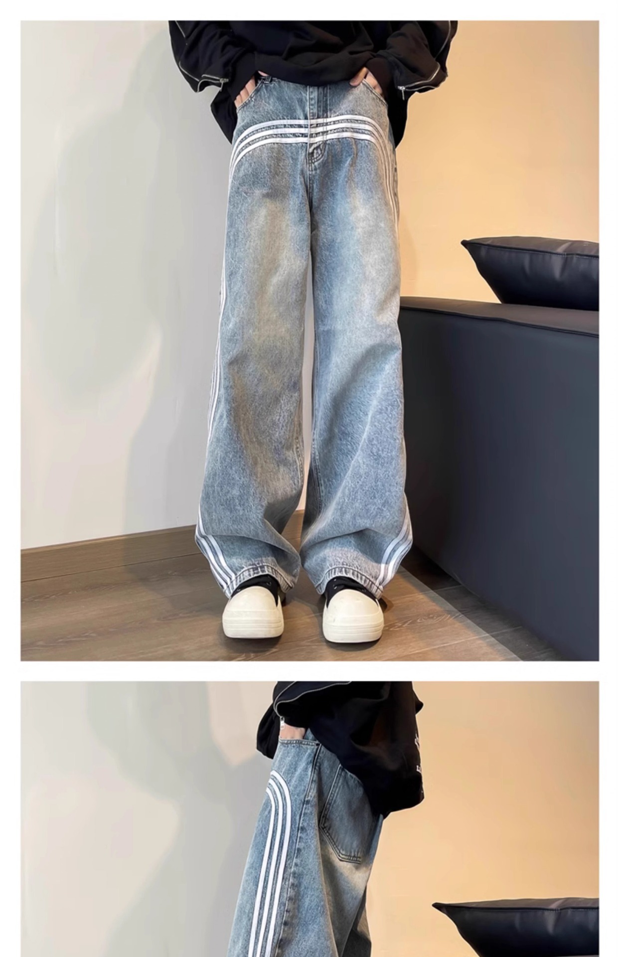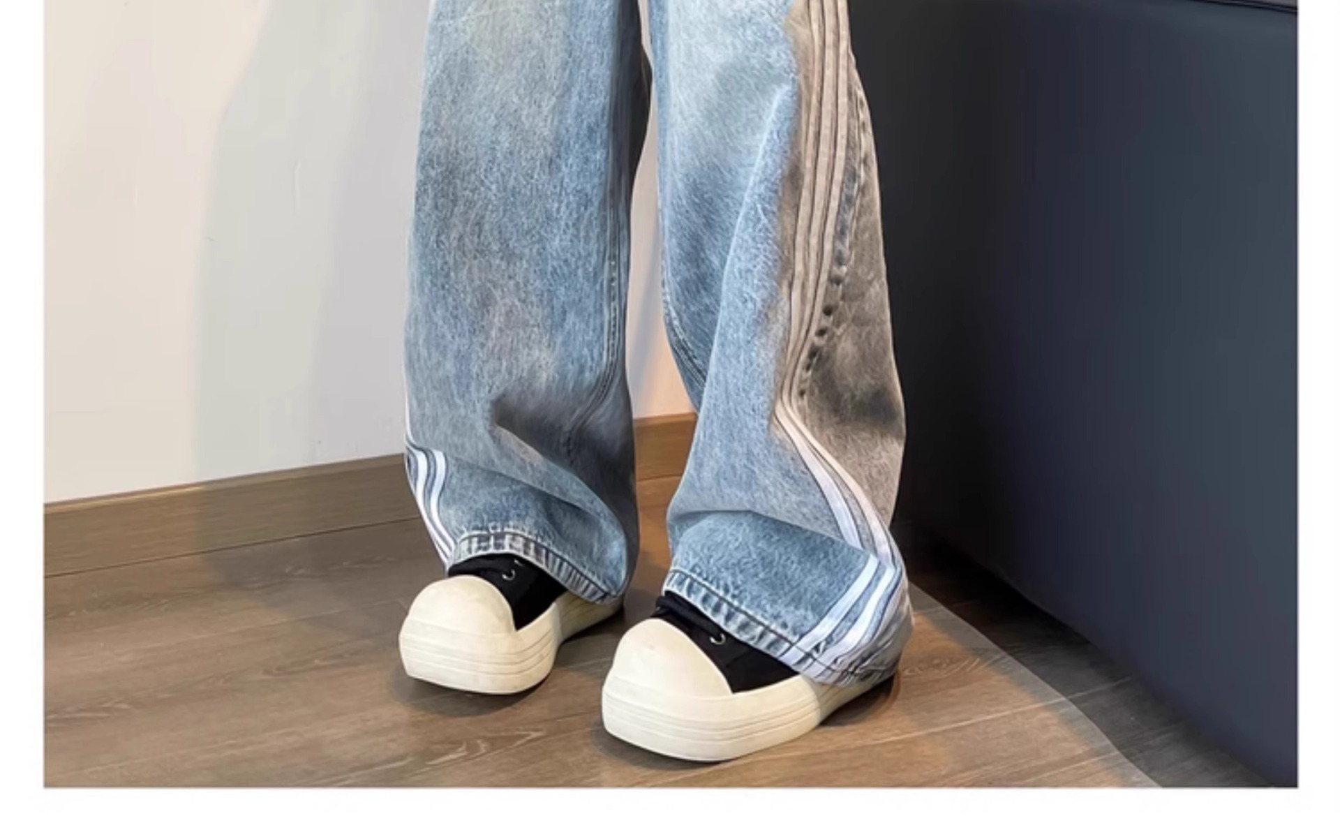 3 개의 바 스티칭 와이드 레그 청바지 남성용 아메리칸 스타일 바이브 하이 스트리트 레트로 틈새 세탁 캐주얼 롱 팬츠스토어 가기