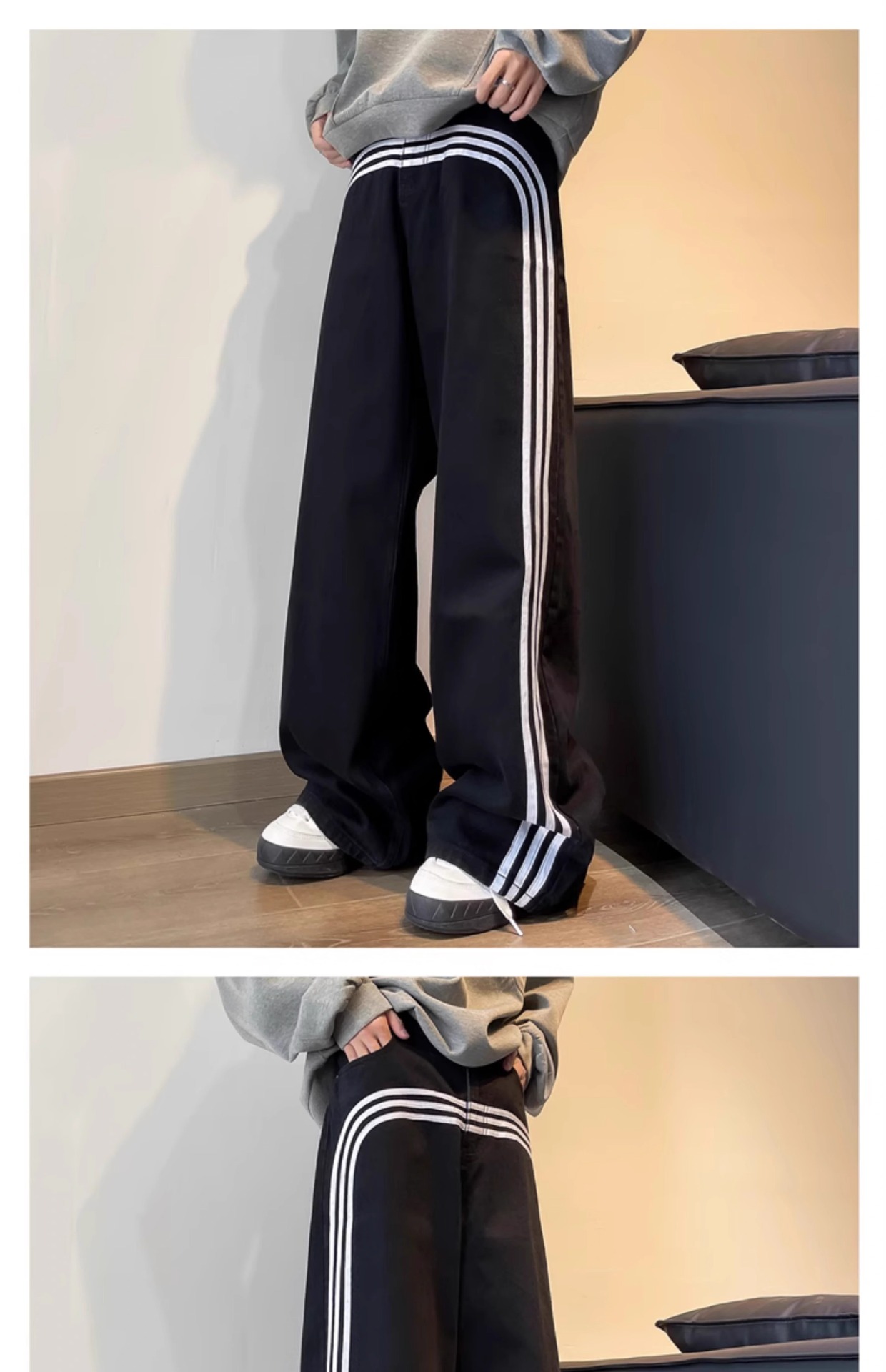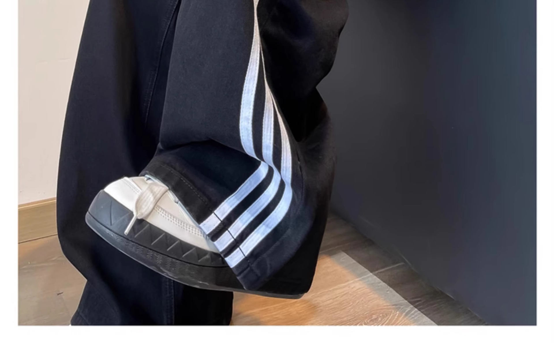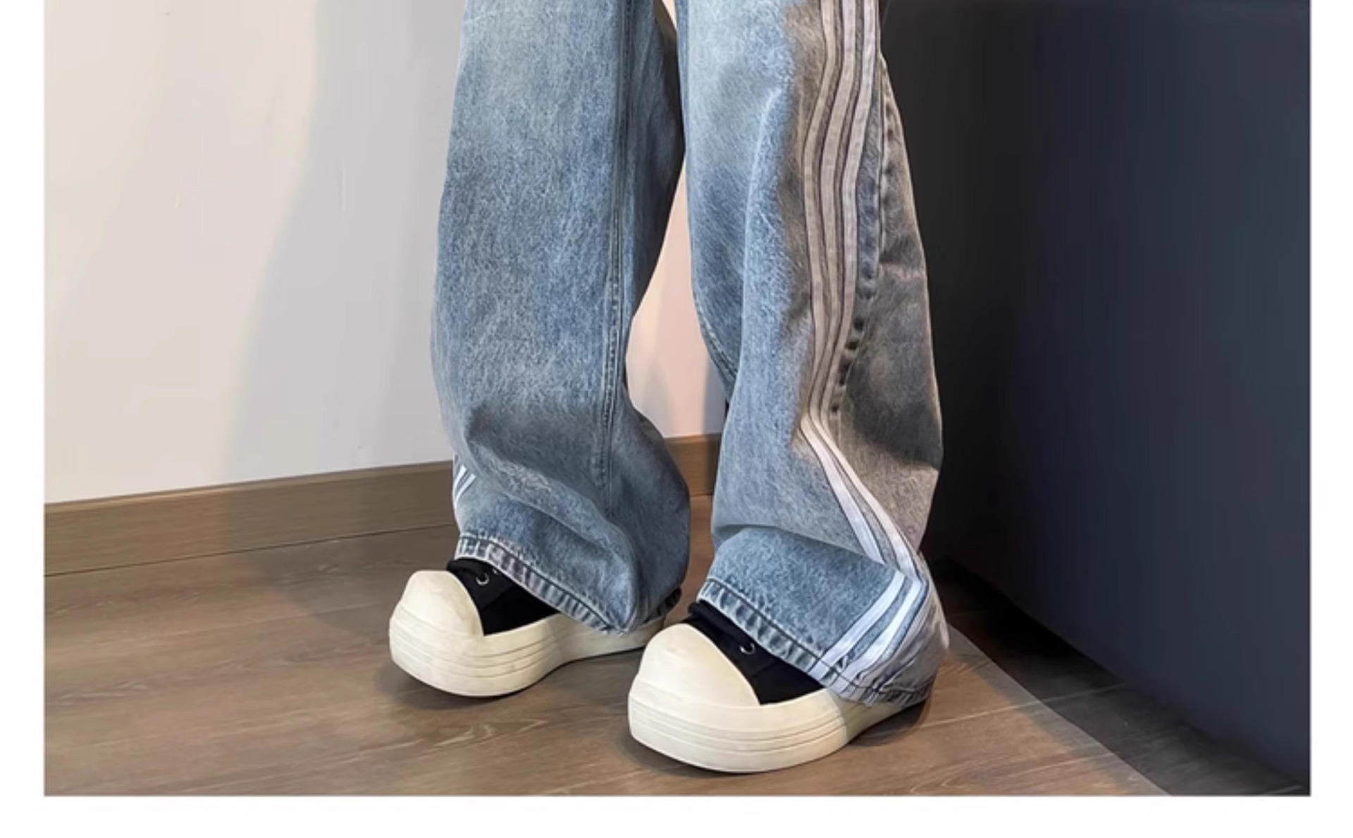 3 개의 바 스티칭 와이드 레그 청바지 남성용 아메리칸 스타일 바이브 하이 스트리트 레트로 틈새 세탁 캐주얼 롱 팬츠