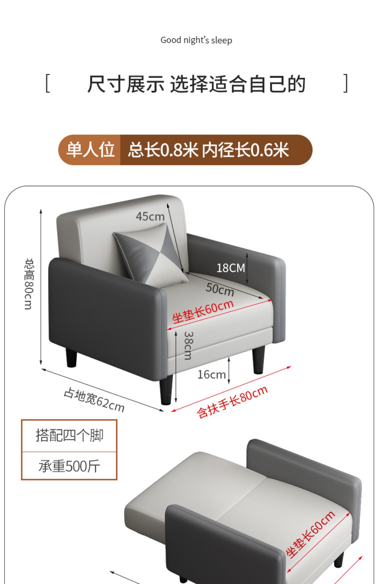 • 1인용 시트 - 팔걸이 포함 전체 길이 0.8m (베개 제외)