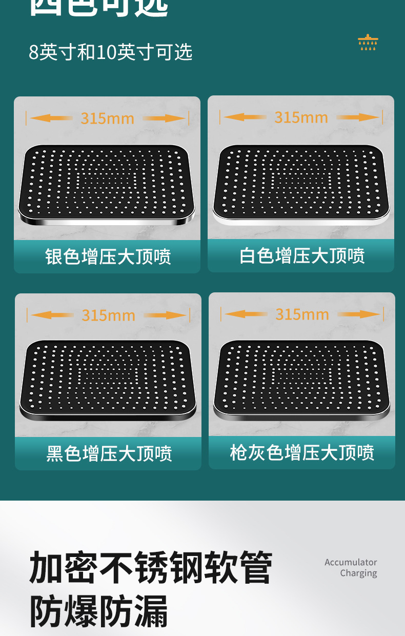 • 건 그레이 13inch [스퀘어 탑 스프레이] + 샤워 핸드 스프레이 + 1.5m 두꺼운 암호화 호스