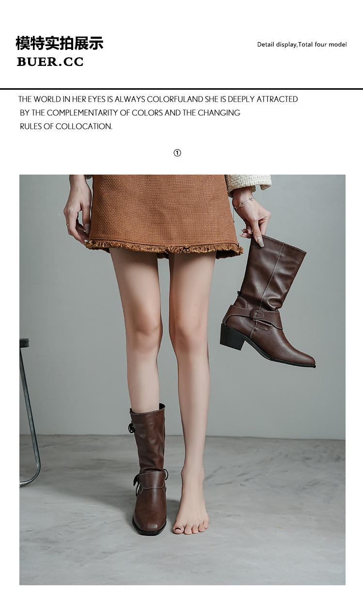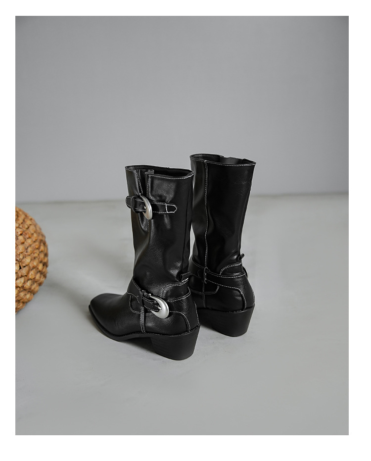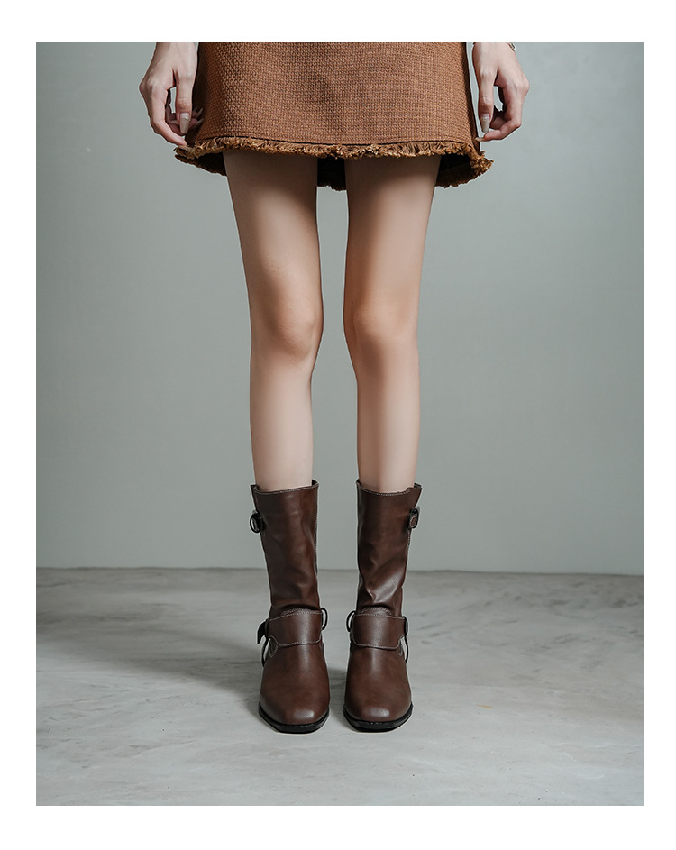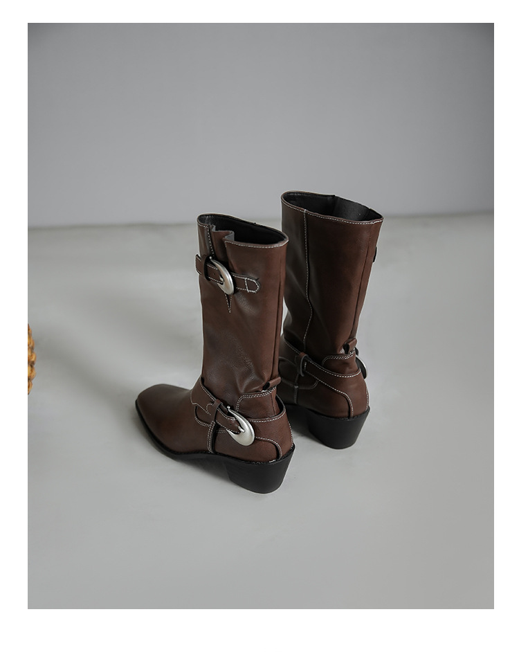 소가죽 버전~수인인과 같은 스타일의 영국식 사각코 금속 버클 두꺼운 굽 웨스턴 숏부츠 여성용 첼시 마틴 부츠스토어 가기