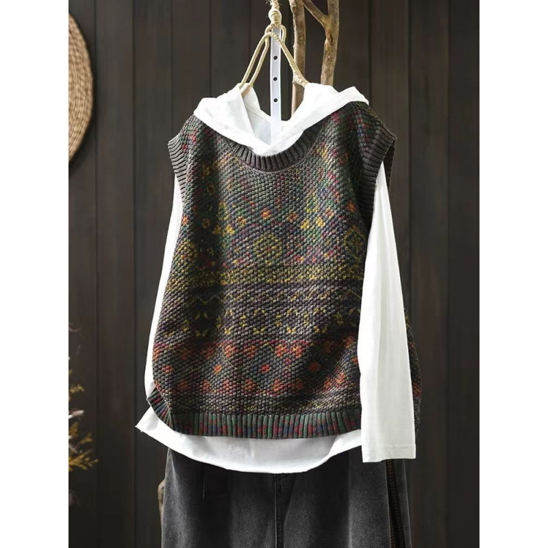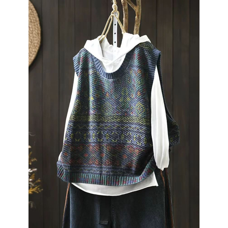 2024 빈티지 인쇄 코튼 니트 조끼 여성 느슨한 예술적 캐주얼 라운드 넥 소매 풀오버 조끼스토어 가기