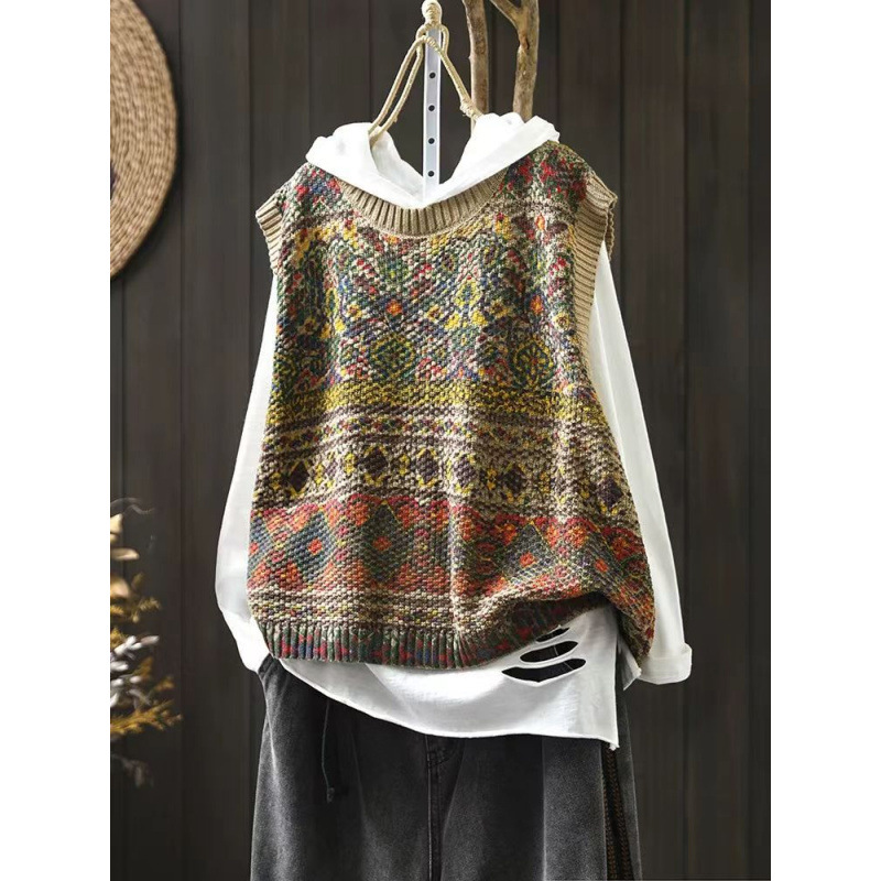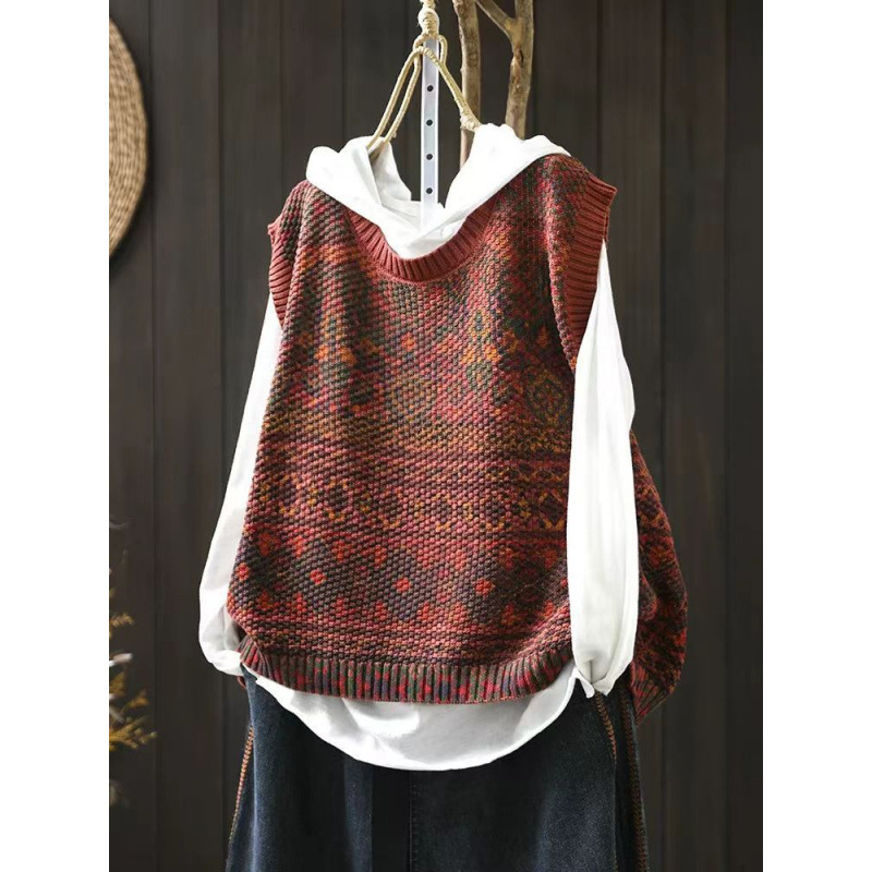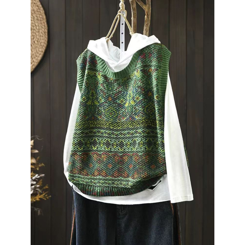 2024 빈티지 인쇄 코튼 니트 조끼 여성 느슨한 예술적 캐주얼 라운드 넥 소매 풀오버 조끼