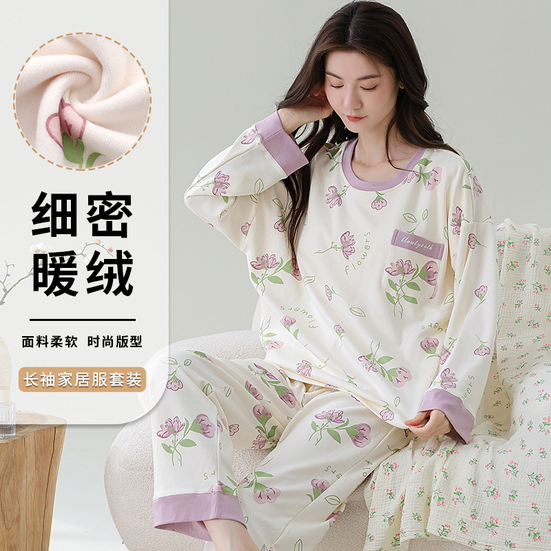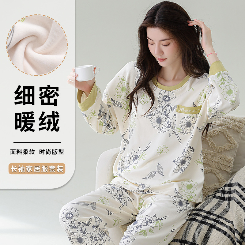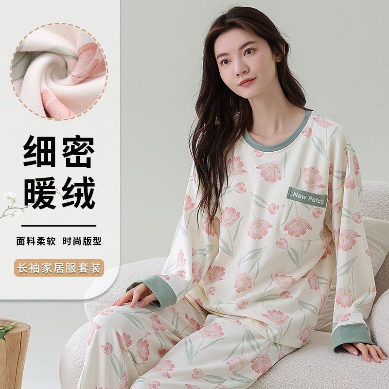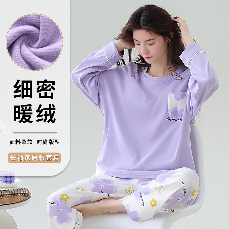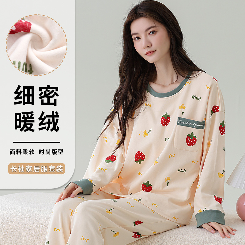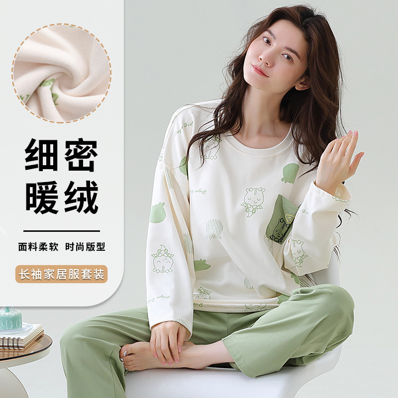 2024 새로운 겨울 잠옷 여성용 벨벳 달콤한 귀여운 풀오버 라운드 넥 따뜻한 홈 옷 투피스 의상스토어 가기