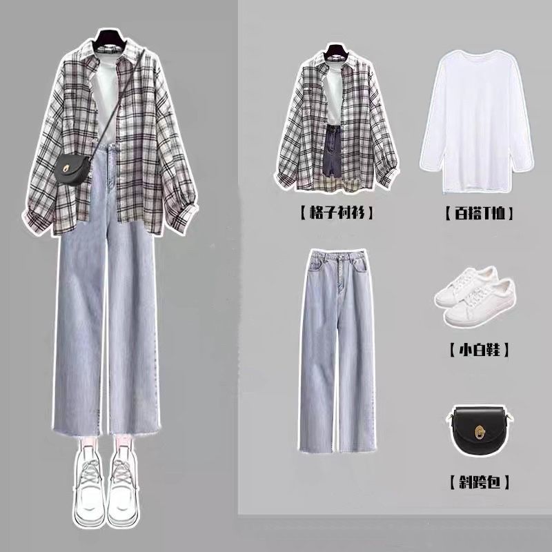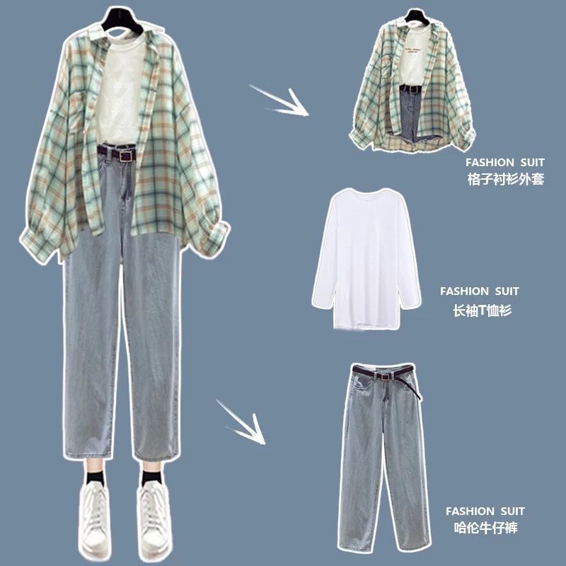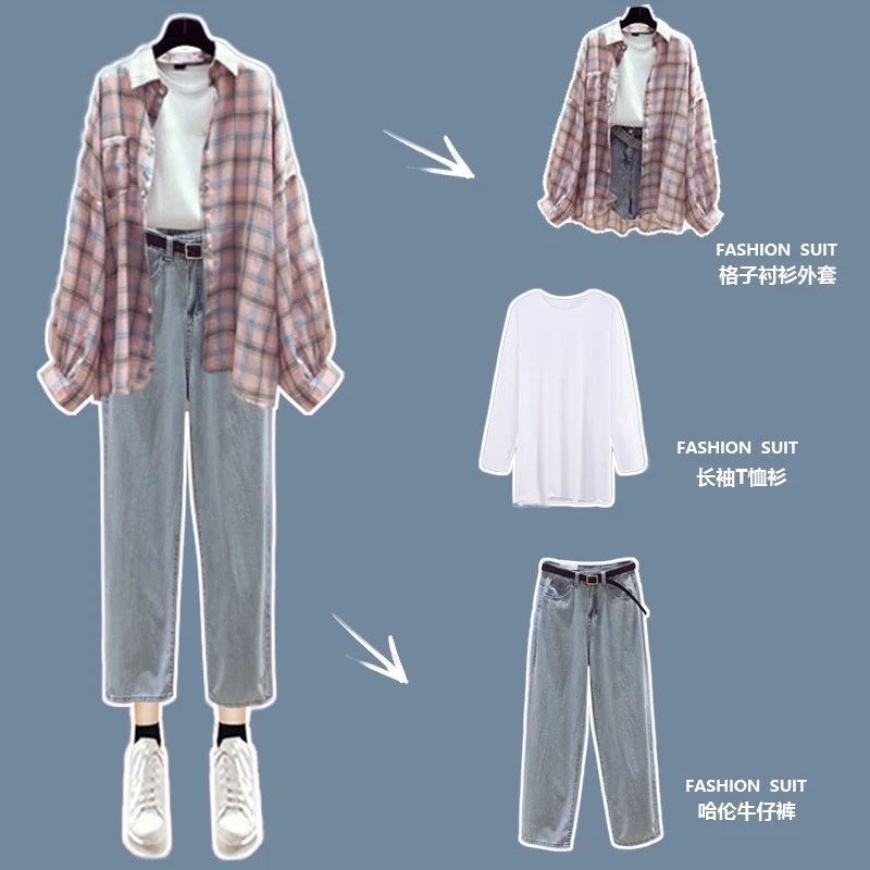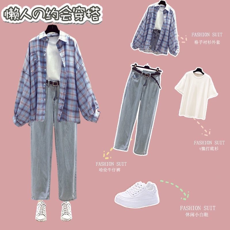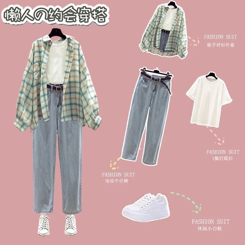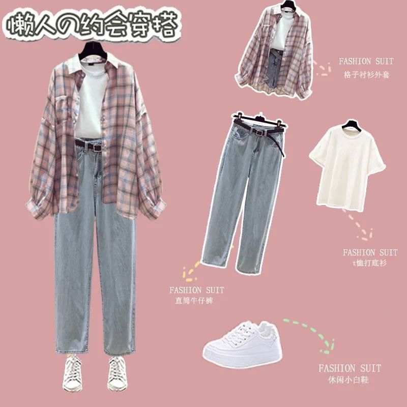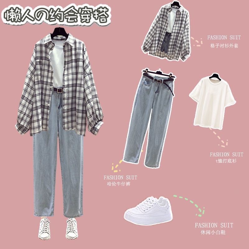 2021 봄 패션 세트 여학생 한국 느슨한 격자 무늬 셔츠 재킷 티셔츠 청바지 산핑 달리기스토어 가기