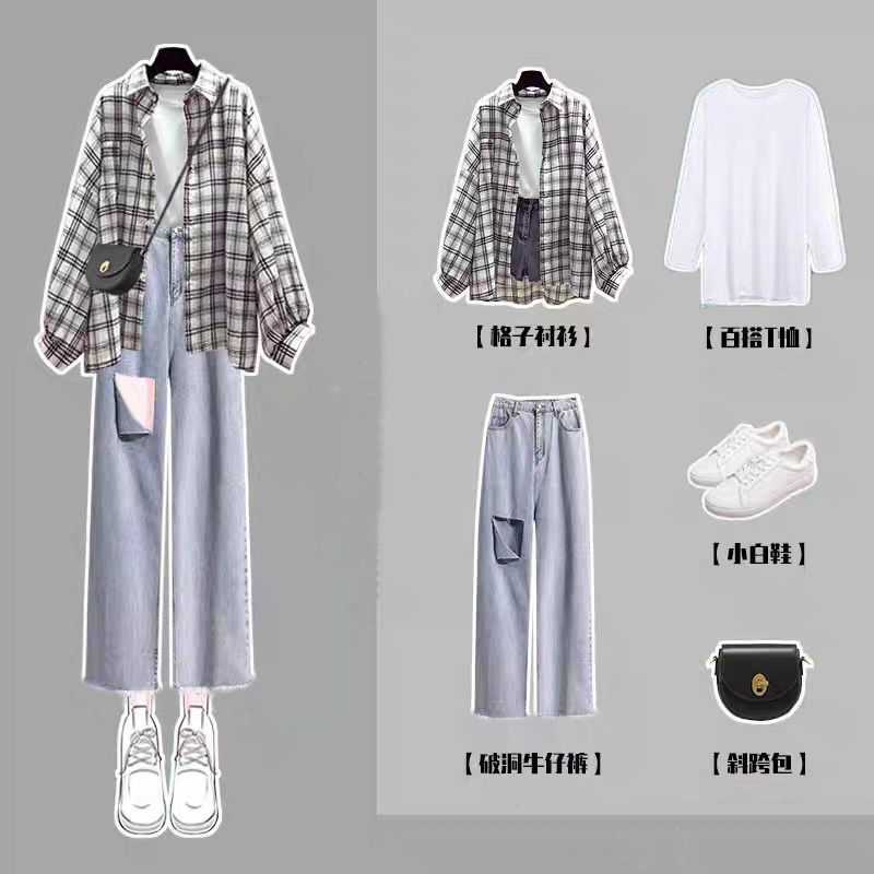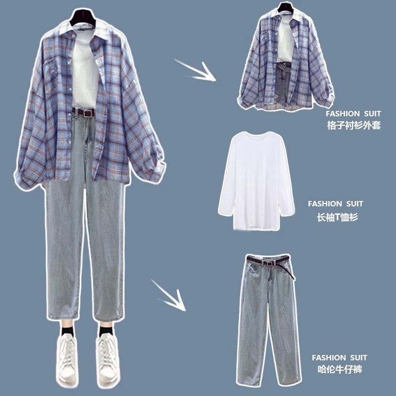 2021 봄 패션 세트 여학생 한국 느슨한 격자 무늬 셔츠 재킷 티셔츠 청바지 산핑 달리기