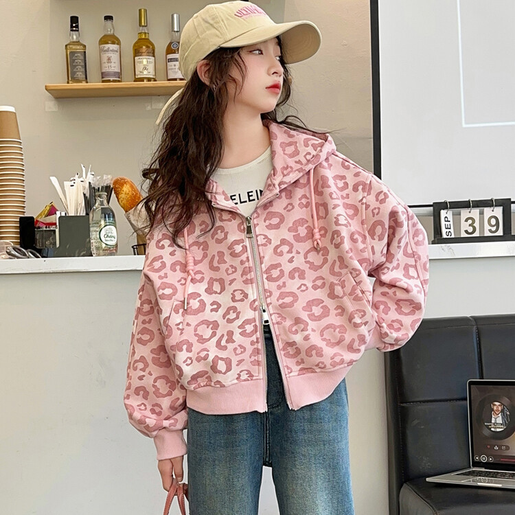 2024 여자 가을 코트 레오파드 무늬 트렌디 한 새로운 도착 한국 스타일 짧은 카디건 후드 지퍼 셔츠