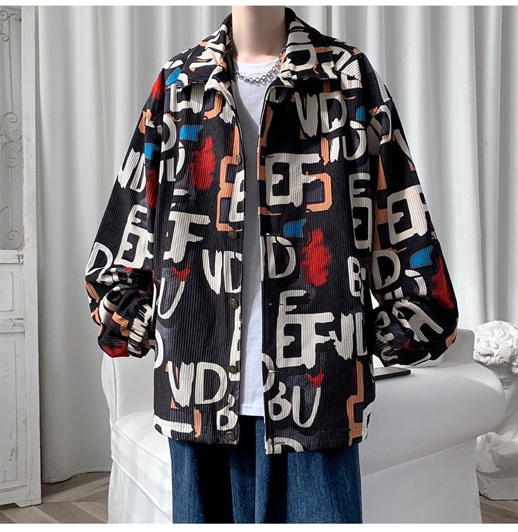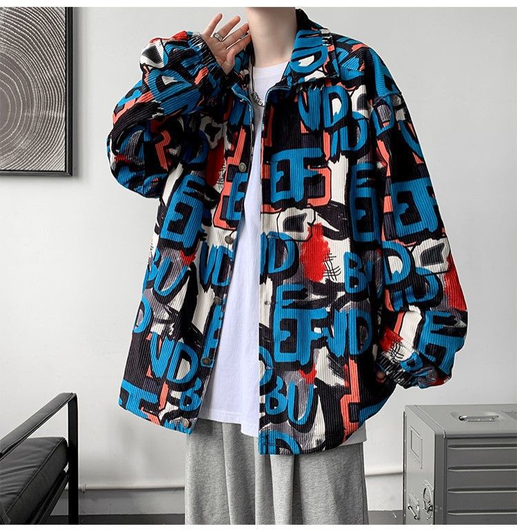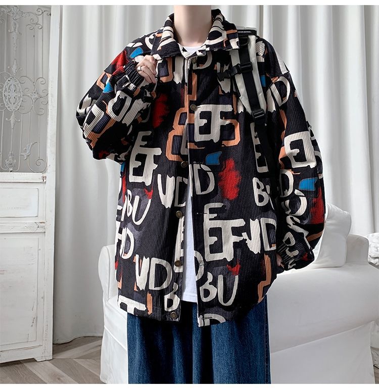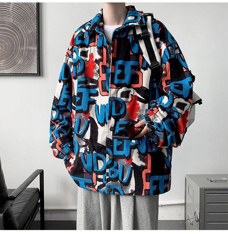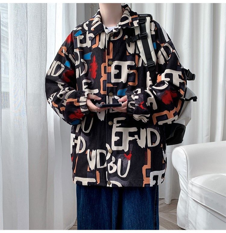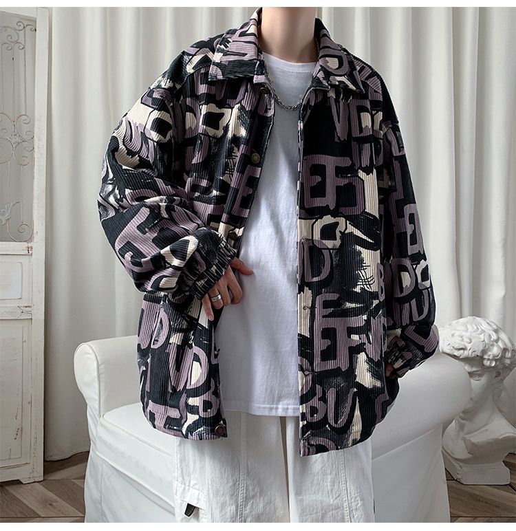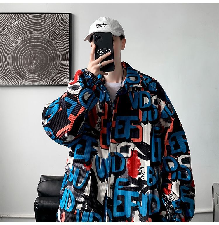 코듀로이 재킷 남자의 봄과 가을 새로운 홍콩 스타일 낙서 인쇄 하이 스트리트 재킷 Ins 느슨한 올 매치 탑