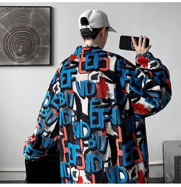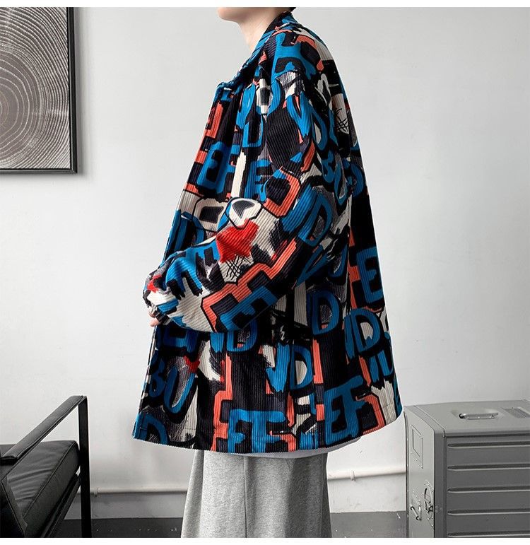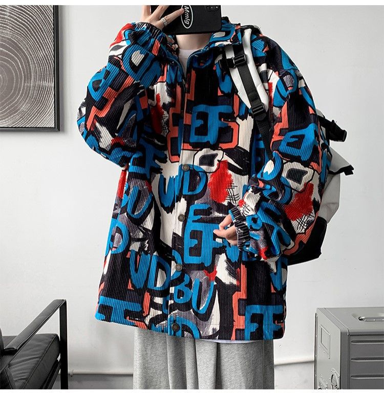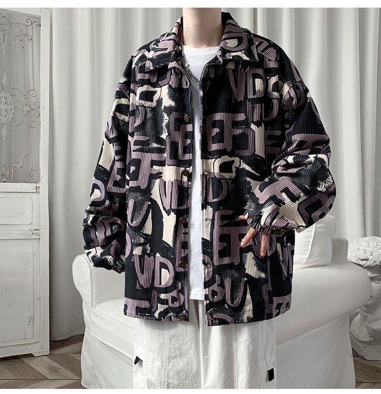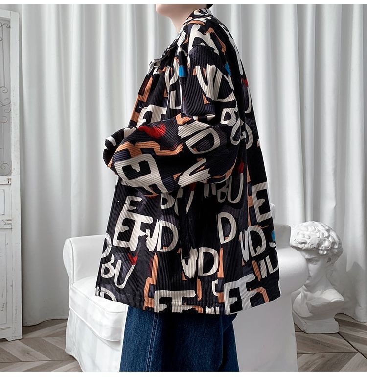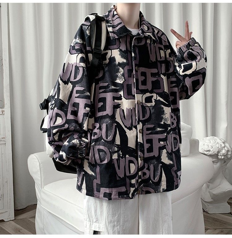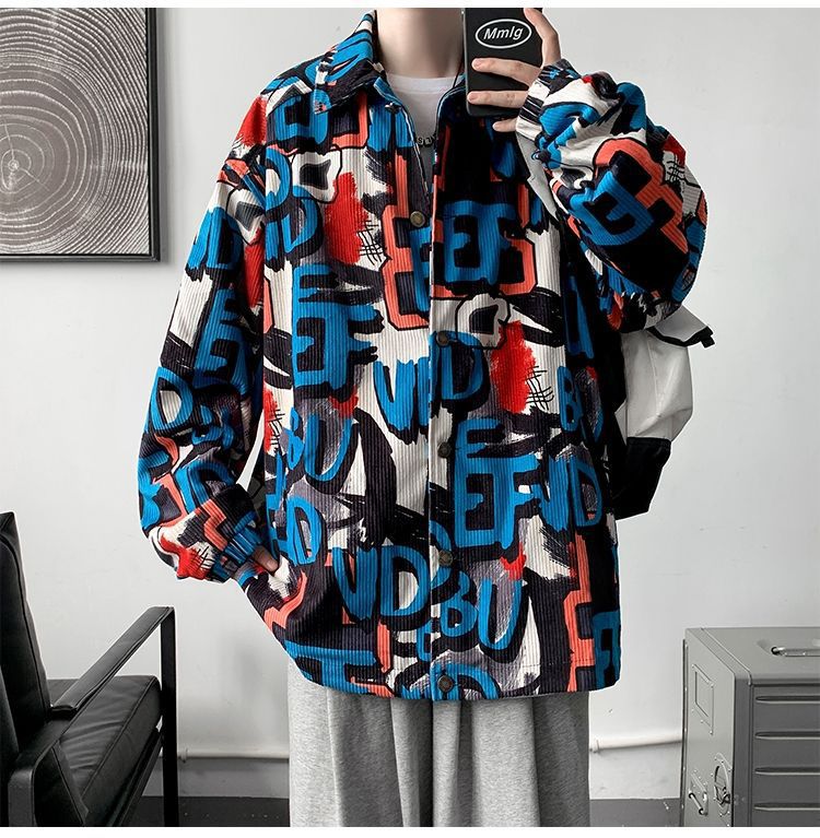 코듀로이 재킷 남자의 봄과 가을 새로운 홍콩 스타일 낙서 인쇄 하이 스트리트 재킷 Ins 느슨한 올 매치 탑