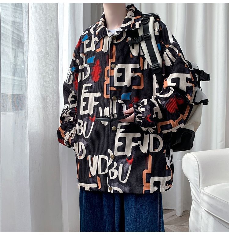코듀로이 재킷 남자의 봄과 가을 새로운 홍콩 스타일 낙서 인쇄 하이 스트리트 재킷 Ins 느슨한 올 매치 탑스토어 가기